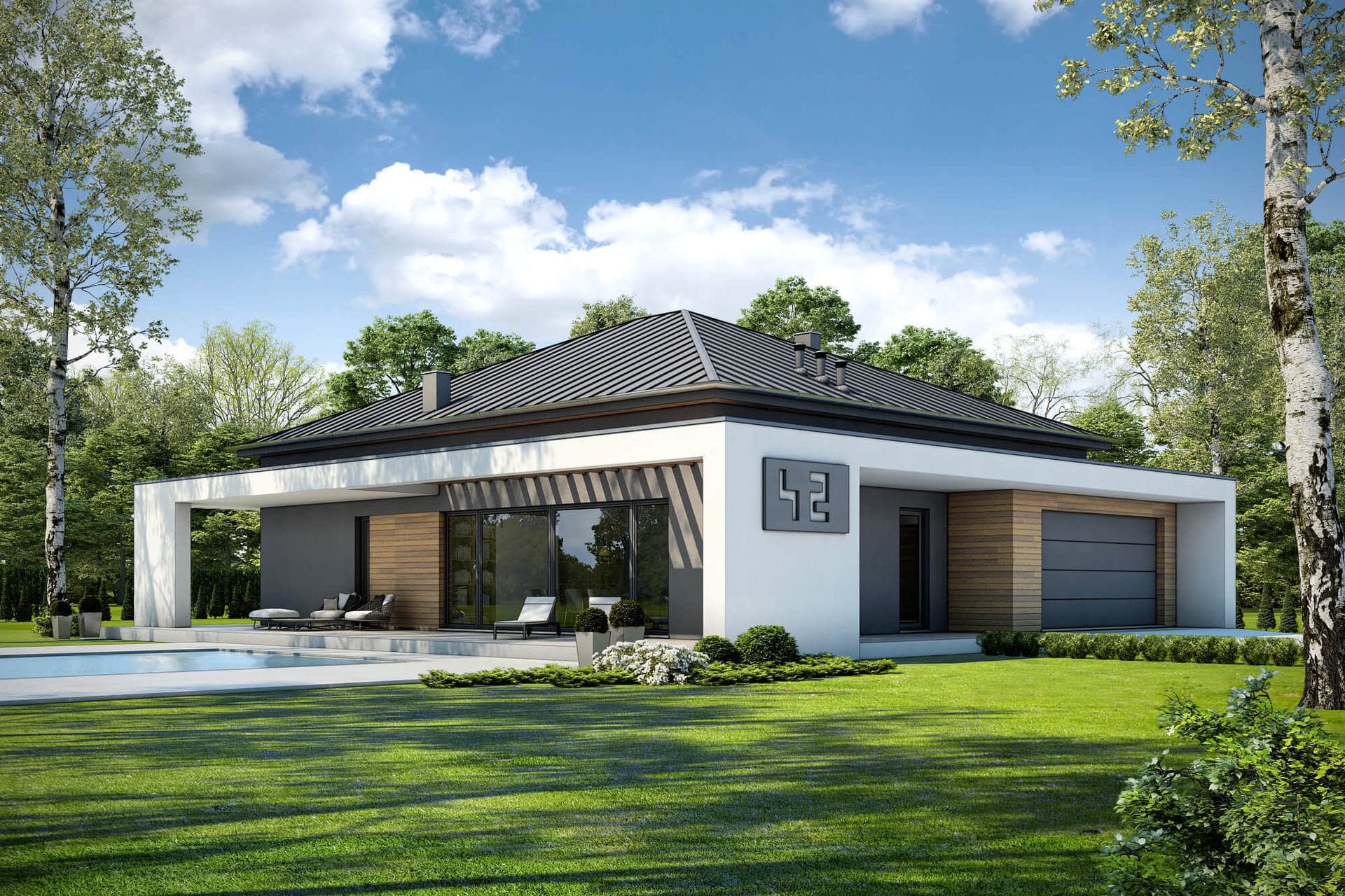 OTWARTY D42 WARIANT II to nowoczesny, parterowy dom w wersji z dachem kopertowym. Plan domu zbliżony do kwadratu z charakterystyczną ramą oplatającą dom.