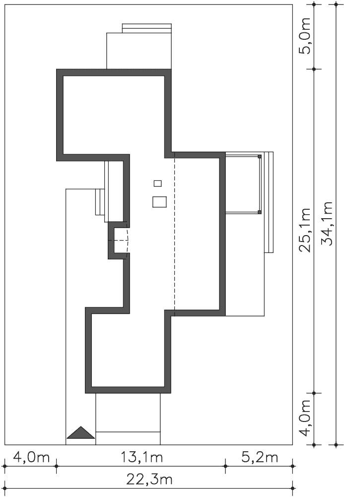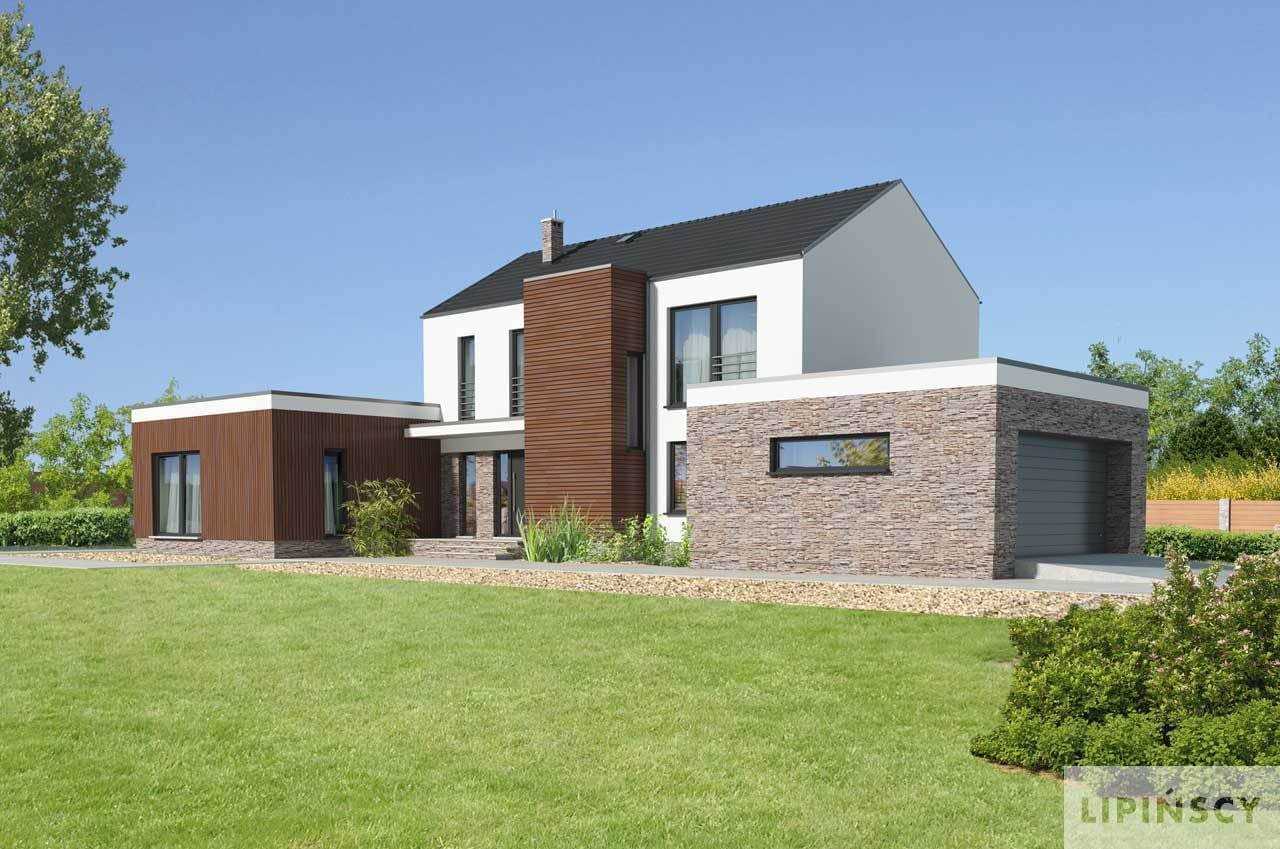 Energooszczędny dom piętrowy, wielopokoleniowy, z wydzielonym osobnym mieszkaniem. Dom składa się z trzech połączonych ze sobą brył. Główny budynek ma dwie pełne kondygnacje, natomiast zlokalizowane po przeciwnych stronach jednopoziomowe dobudówki to: dwupokojowe mieszkanie z aneksem kuchennym i łazienką oraz dwustanowiskowy garaż. Wjazd do garażu jest zaplanowany w taki sposób, aby dom można było umieścić na stosunkowo wąskiej działce. Strefy dzienne obu mieszkań oraz wszystkie sypialnie są wyposażone w duże przeszklenia, dzięki którym wnętrza są jasne i przestronne. Część dzienna głównego budynku zajmuje niemal cały parter. Spore tarasy zostały tak zaplanowane aby nie kolidowały ze sobą i można było z nich korzystać niezależnie. Dom ten będzie wygodny dla wielopokoleniowej rodziny, ale może też stanowić dodatkowe źródło dochodu uzyskane z niezależnego mieszkania na wynajem.