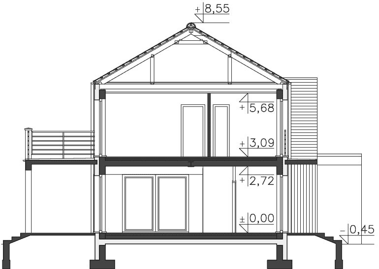 - Rozwiązania konstrukcyjno-materiałowe: ściany, strop/stropy, nadproża okienne i drzwiowe, wieńce, dach, schody na poddasze nieużytkowe, kominy i wentylacje, izolacje, powłoki zabezpieczające, posadzki i podłogi, tynki i okładziny, stolarka okienna i drzwiowa, obróbki blacharskie, rynny i rury spustowe, taras i płyta wejściowa