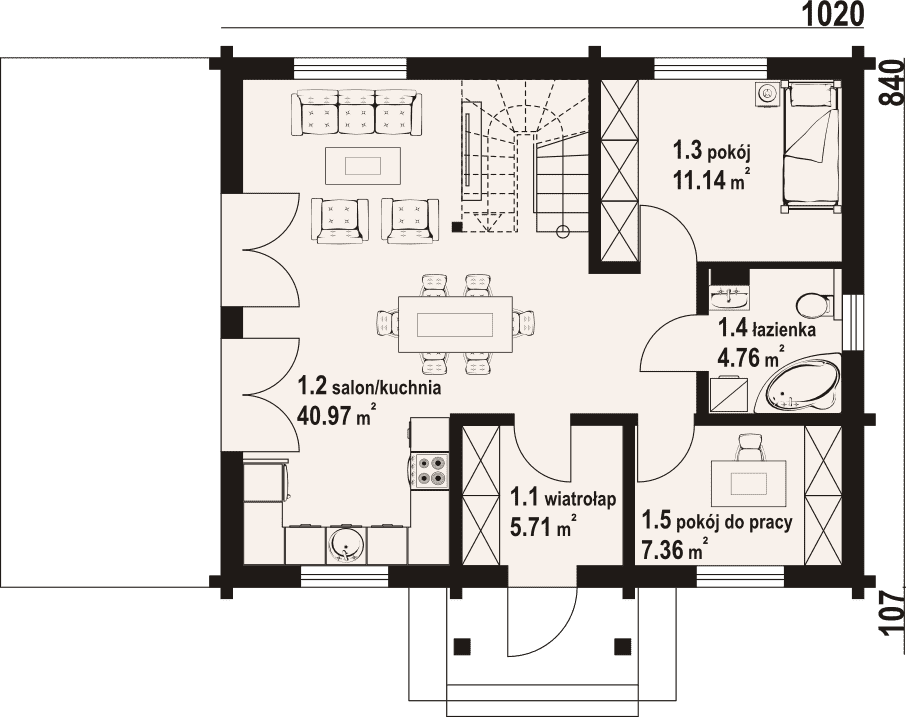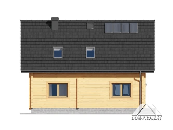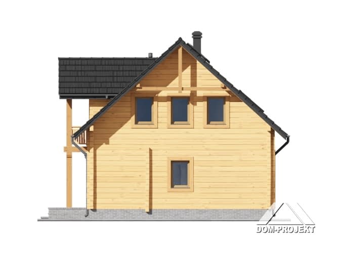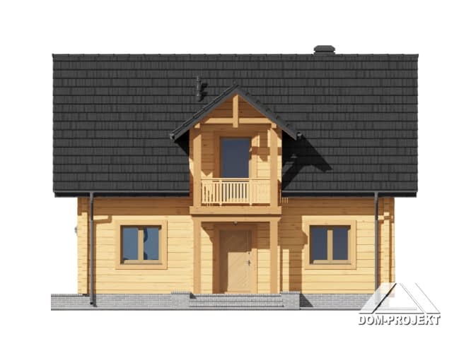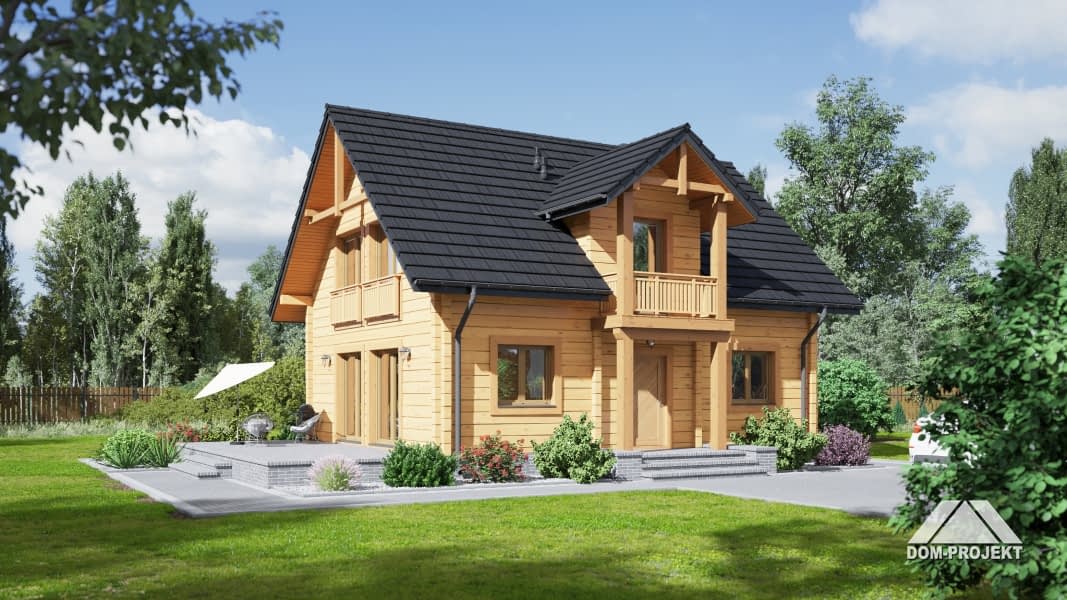 Dom z bali. Duży salon z aneksem kuchennym, wyjściami na taras i schodami na poddasze. Dwa pokoje, łazienka i wiatrołap. Na poddaszu cztery pokoje, łazienka, komunikacja i balkon. Zwarta bryła budynku i dach dwuspadowy sprzyjają szybkiej i taniej budowie i niskim kosztom eksploatacji.Rzuty