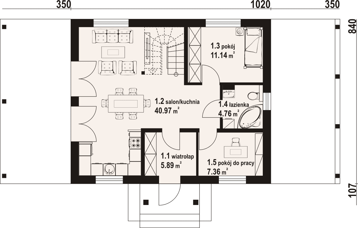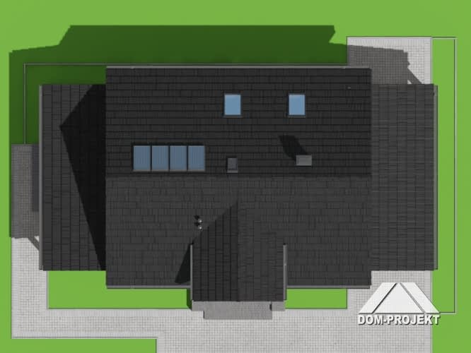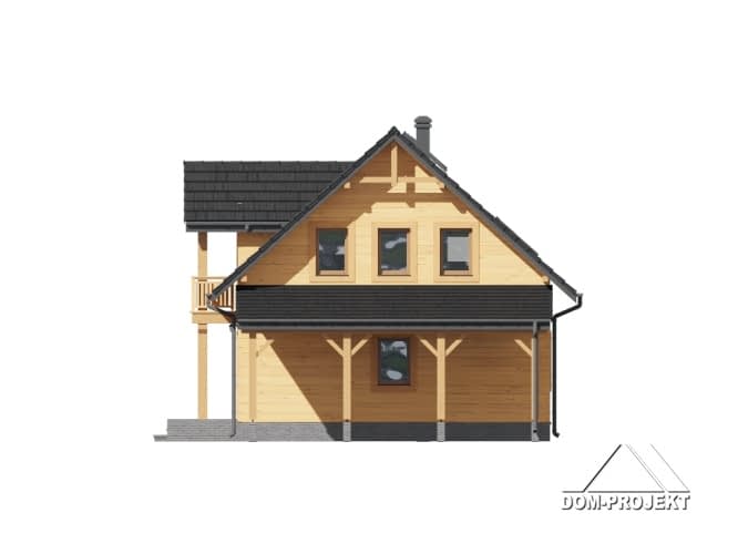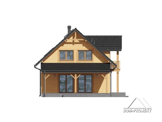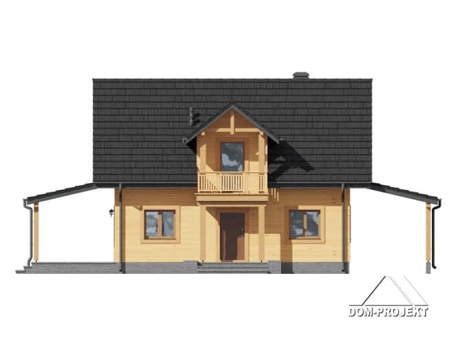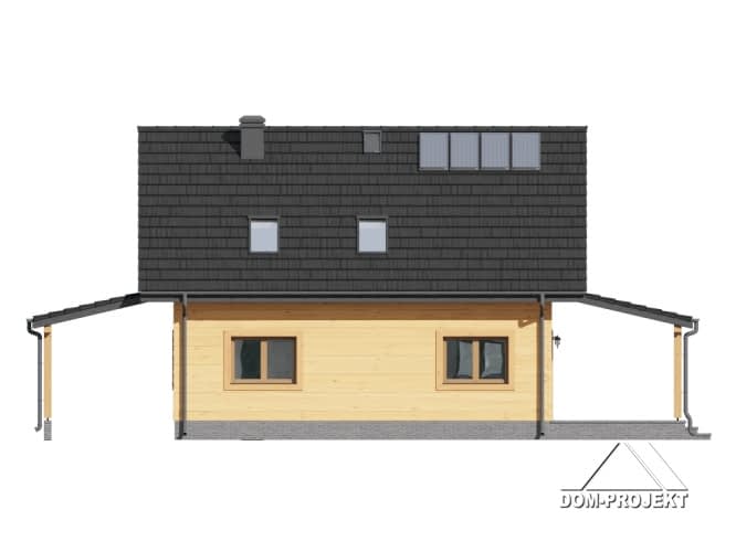 Dom w konstrukcji szkieletu drewnianego. Duży salon z aneksem kuchennym, wyjściami na zadaszony taras i schodami na poddasze. Dwa pokoje, łazienka, wiatrołap. Wiata na samochód. Na poddaszu cztery pokoje, łazienka, komunikacja i balkon. Zwarta bryła budynku i dach dwuspadowy sprzyja szybkiej i taniej budowie i niskim kosztom eksploatacji.Rzuty