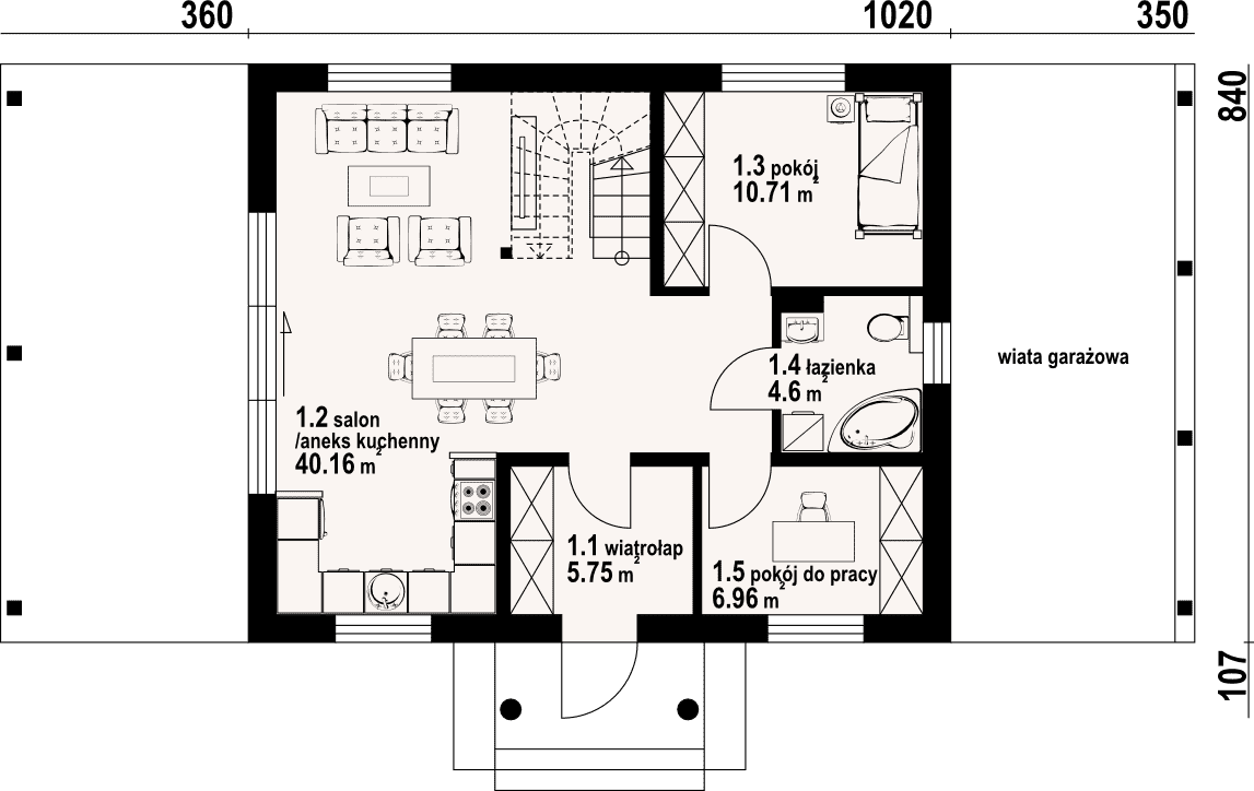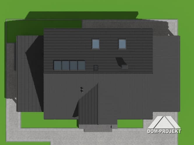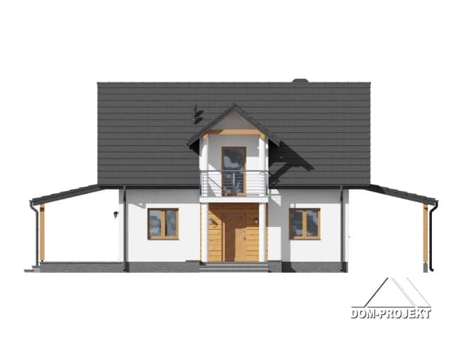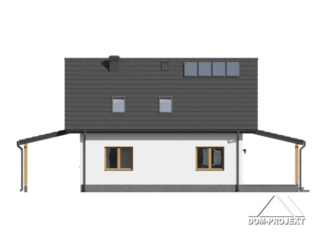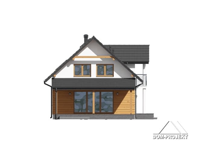 Dom z poddaszem. Duży salon z aneksem kuchennym, wyjściem na zadaszony taras i schodami na poddasze. Pokój do pracy, pokój, łazienka i wiatrołap. Wiata na samochód. Na poddaszu cztery pokoje, łazienka, komunikacja i balkon. Zwarta bryła budynku i dach dwuspadowy sprzyjają szybkiej i taniej budowie i niskim kosztom eksploatacji.Rzuty