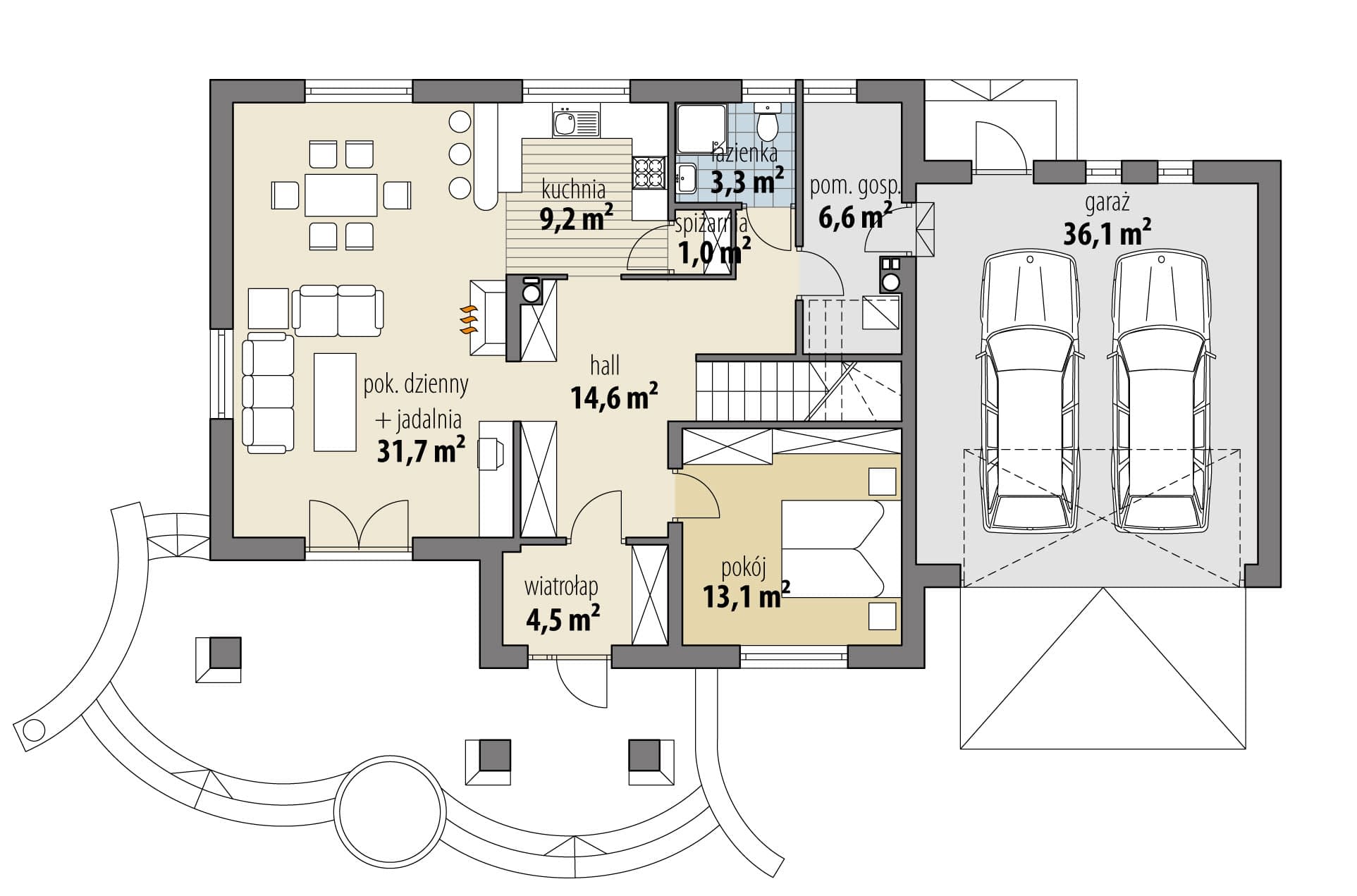 Dom z użytkowym poddaszem, przeznaczony dla 4-6-osobowej rodziny. Na parterze zlokalizowano pokój dzienny połączony z kuchnią i jadalnią, łazienkę, spiżarnię, pomieszczenie gospodarcze oraz dodatkowy pokój. Dwustanowiskowy garaż dostępny jest poprzez pomieszczenie gospodarcze. Na poddaszu znajdują się trzy przestronne sypialnie, łazienka, pralnia oraz strych, który można zaadaptować na dodatkowy pokój. Centralnie usytuowany kominek pozwala na wykonanie ogrzewania kominkowego. Projekt dostępny w wersji z garażem jednostanowiskowym - Pallas oraz bez garażu - Pallas III. Projekt można zbliźniaczyć.