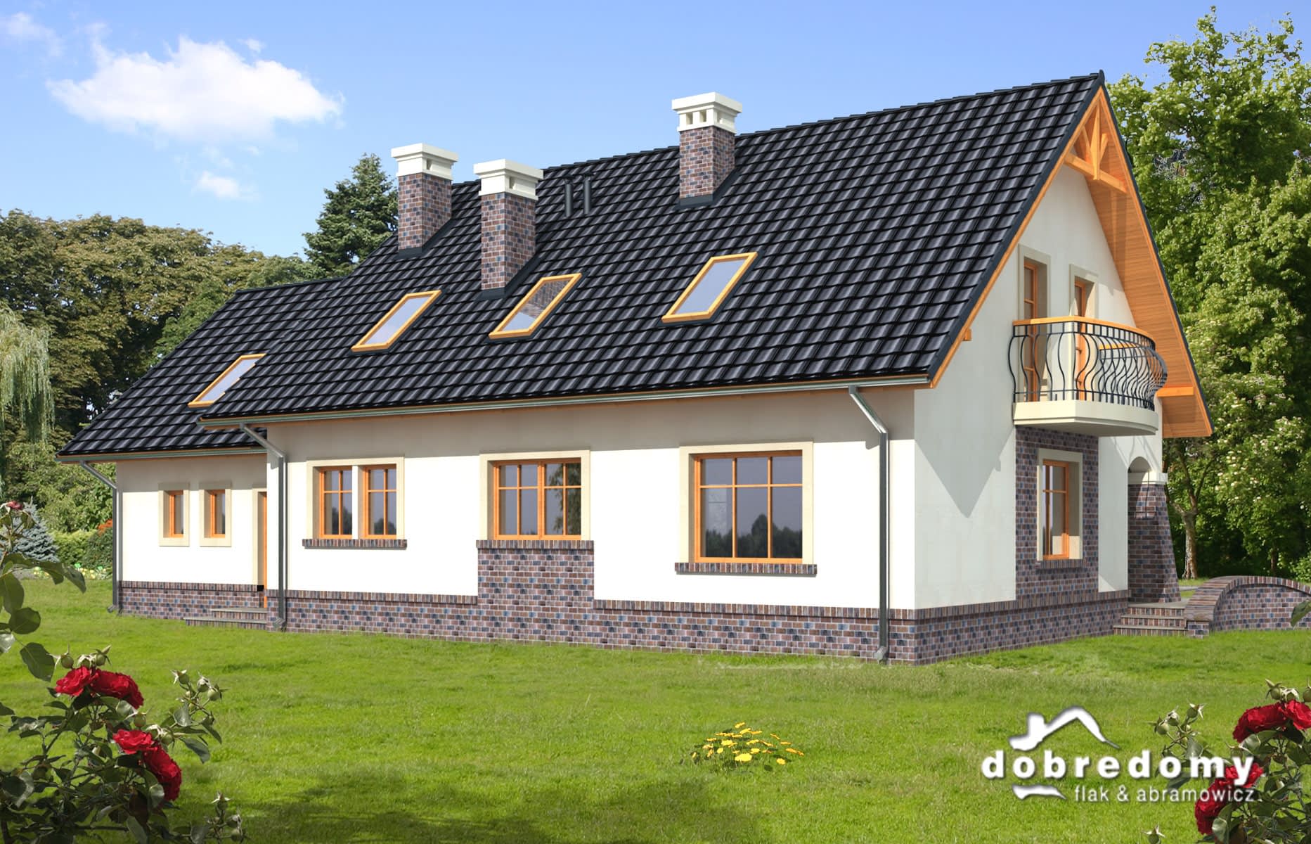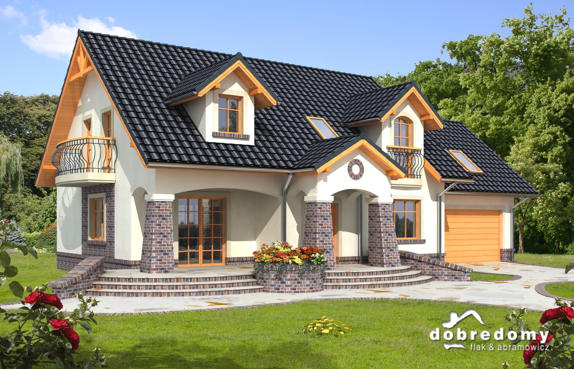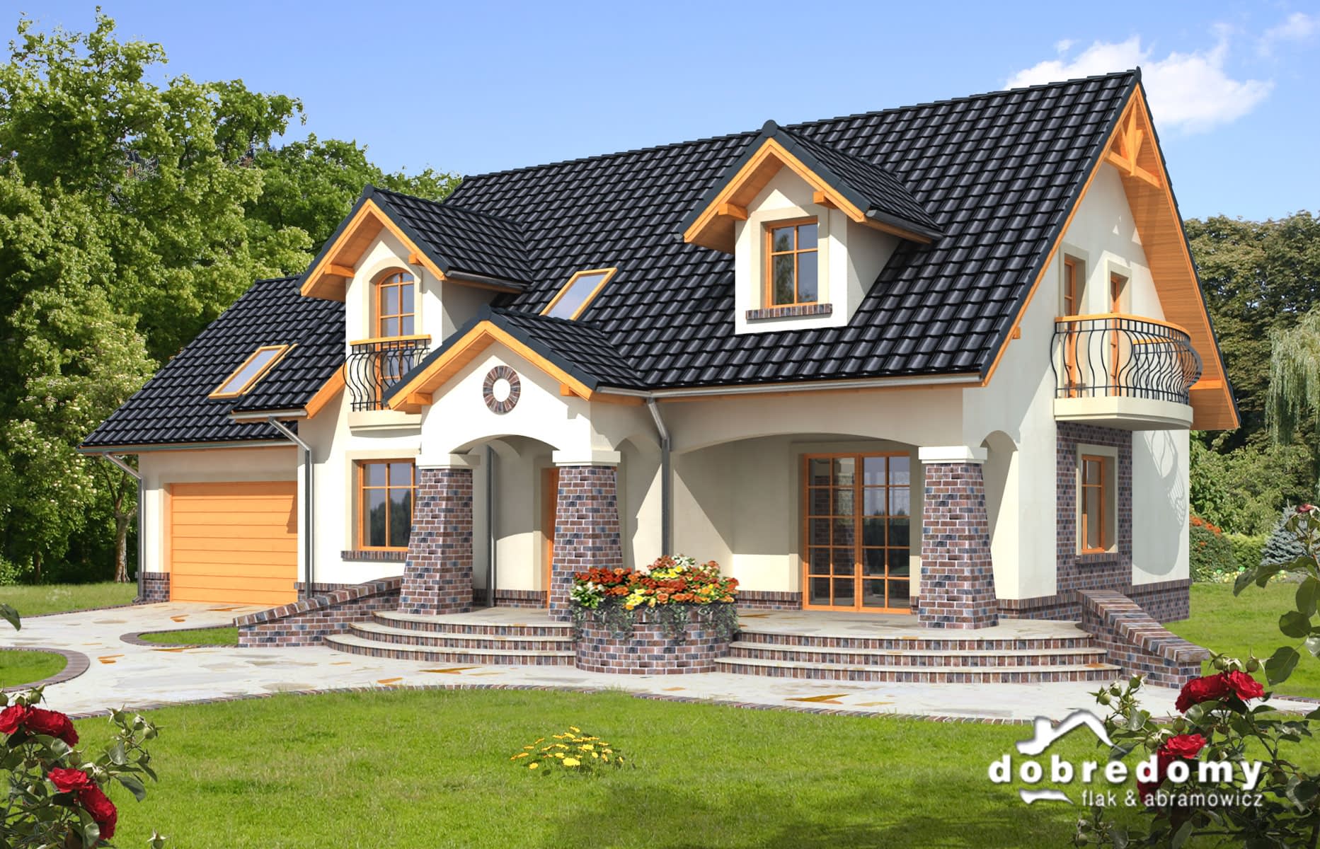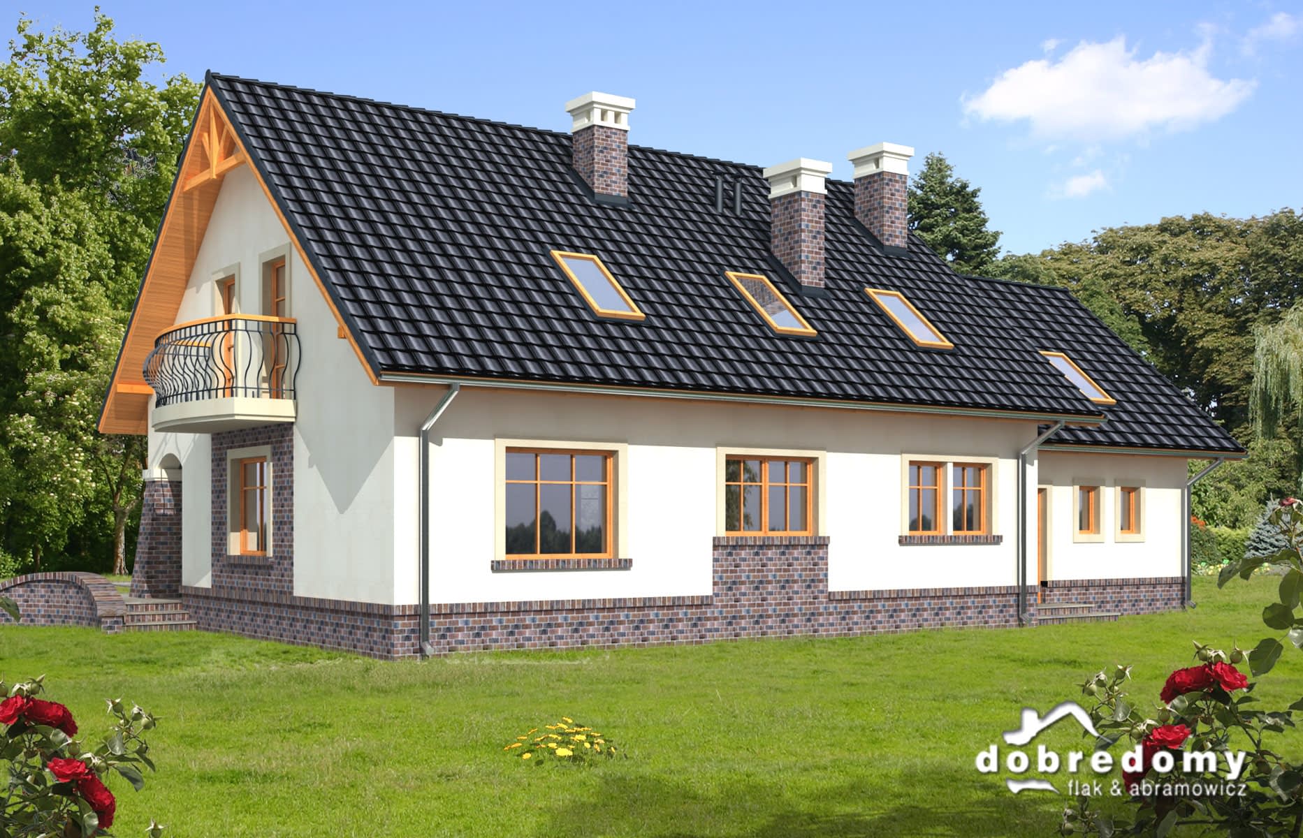 Elewacje pokryte tynkiem strukturalnym w systemie ociepleń Termo Organika i okładziną klinkierową. W projekcie zastosowano okna dachowe marki FAKRO. Pokrycie dachu - dachówka ceramiczna lub cementowa CREATON.