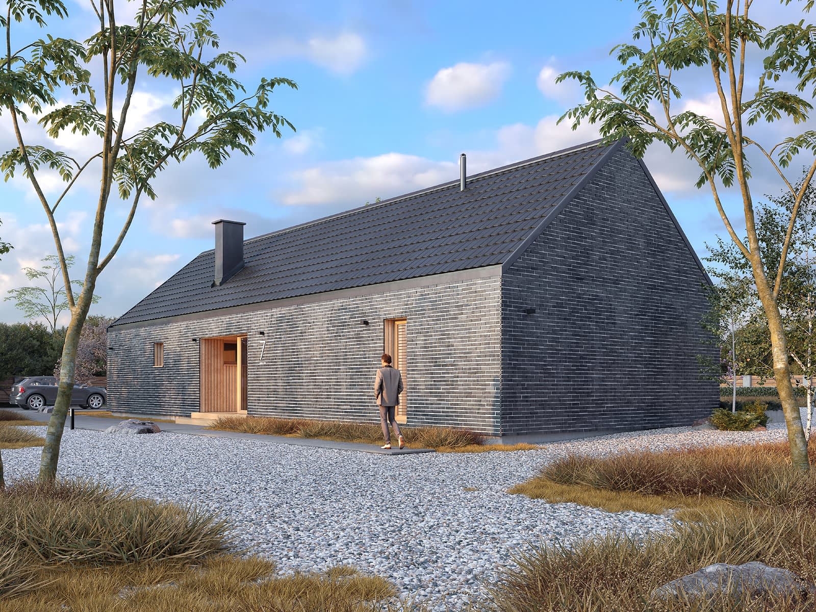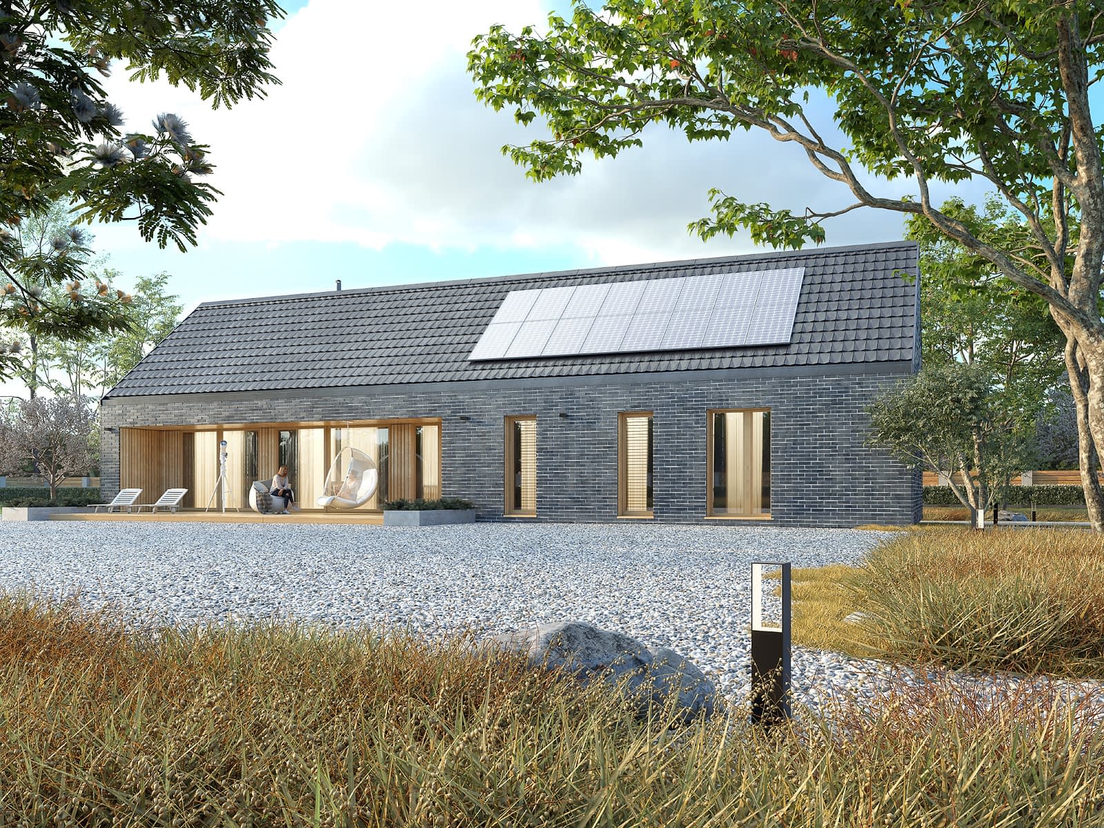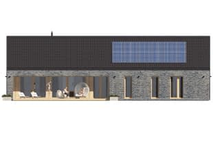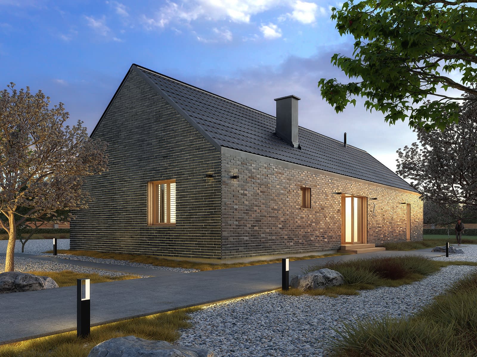 Projekt domu Paproć 2 to nowoczesna parterówka, która należy do projektów w stylu nowoczesnej stodoły. Prosta bryła budynku przykryta została dwuspadowym dachem bez okapów. Całość dopełnia duża ilość przeszkleń i oryginalna elewacja. Na elewacji pojawiła się grafitowa płytka elewacyjna, a na dachu dachówką ceramiczna w tym samym kolorze. W projekcie przewidziano otwartą część dzienną. Zaprojektowano tu salon z kozą, jadalnię z miejscem na duży stół oraz otwartą kuchnię z barkiem. Część nocna to trzy wygodne sypialnie oraz ogólnodostępna łazienka. Jedna z sypialni posiada własną łazienkę, co na pewno docenią mieszkańcy.Konstrukcja