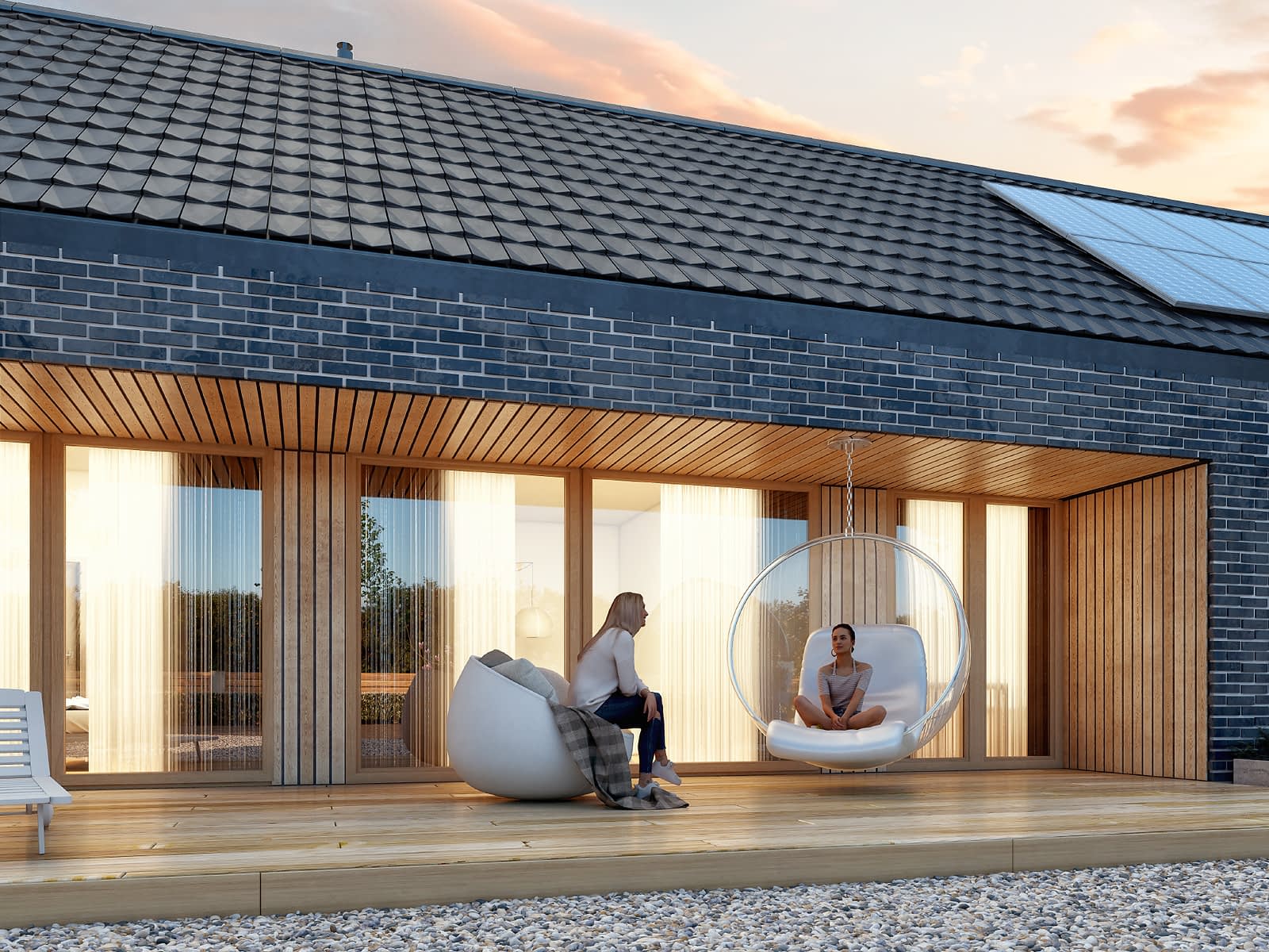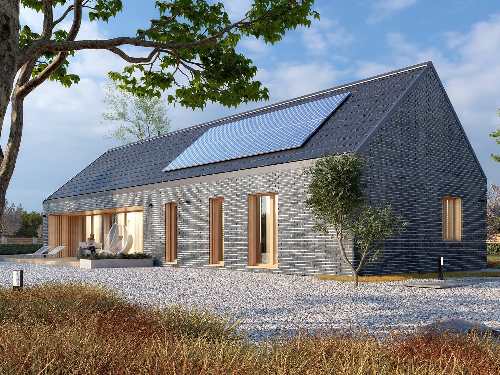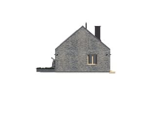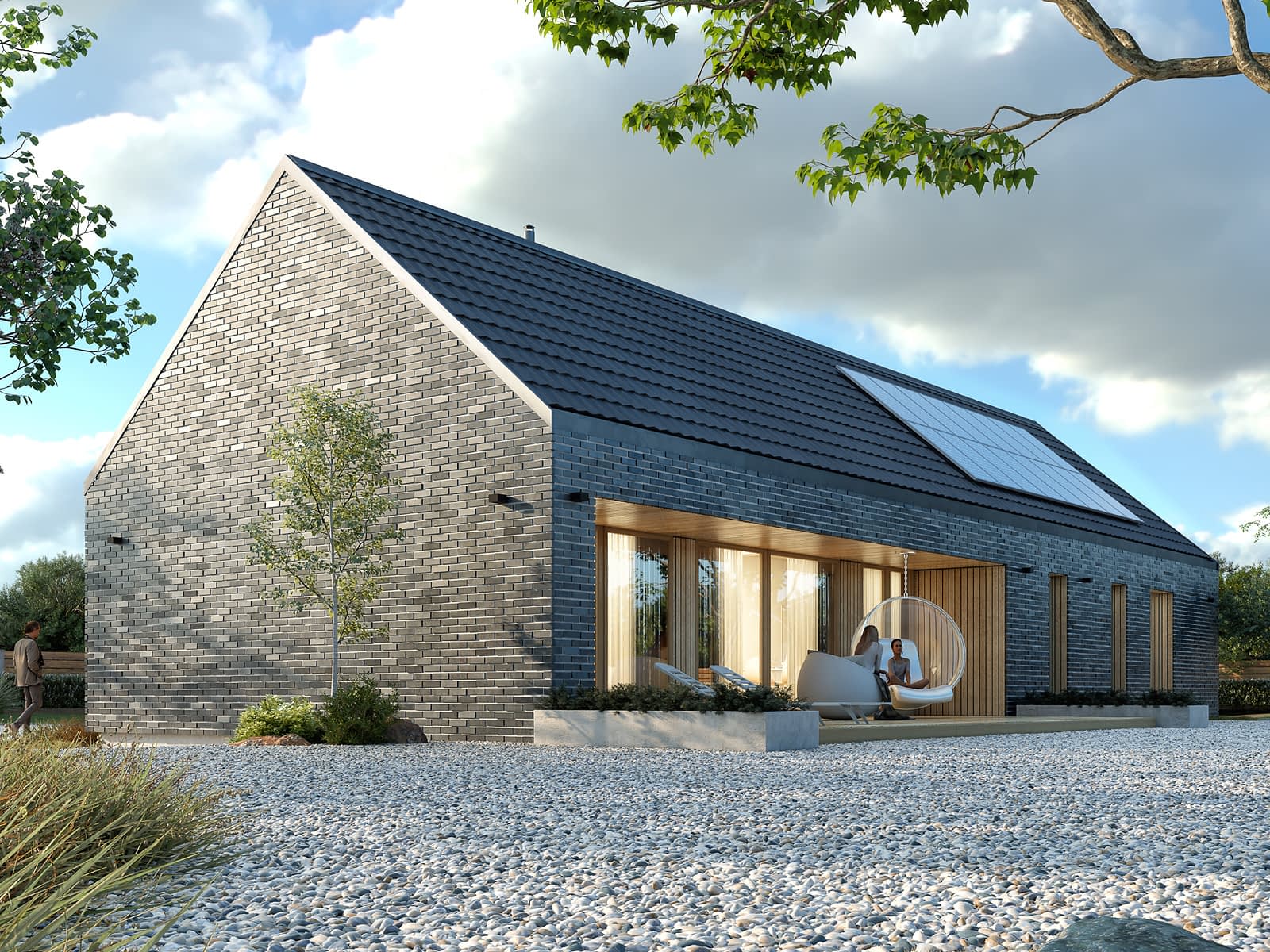 Projekt domu Paproć 2 to nowoczesna parterówka, która należy do projektów w stylu nowoczesnej stodoły. Prosta bryła budynku przykryta została dwuspadowym dachem bez okapów. Całość dopełnia duża ilość przeszkleń i oryginalna elewacja. Na elewacji pojawiła się grafitowa płytka elewacyjna, a na dachu dachówką ceramiczna w tym samym kolorze. W projekcie przewidziano otwartą część dzienną. Zaprojektowano tu salon z kozą, jadalnię z miejscem na duży stół oraz otwartą kuchnię z barkiem. Część nocna to trzy wygodne sypialnie oraz ogólnodostępna łazienka. Jedna z sypialni posiada własną łazienkę, co na pewno docenią mieszkańcy.Konstrukcja