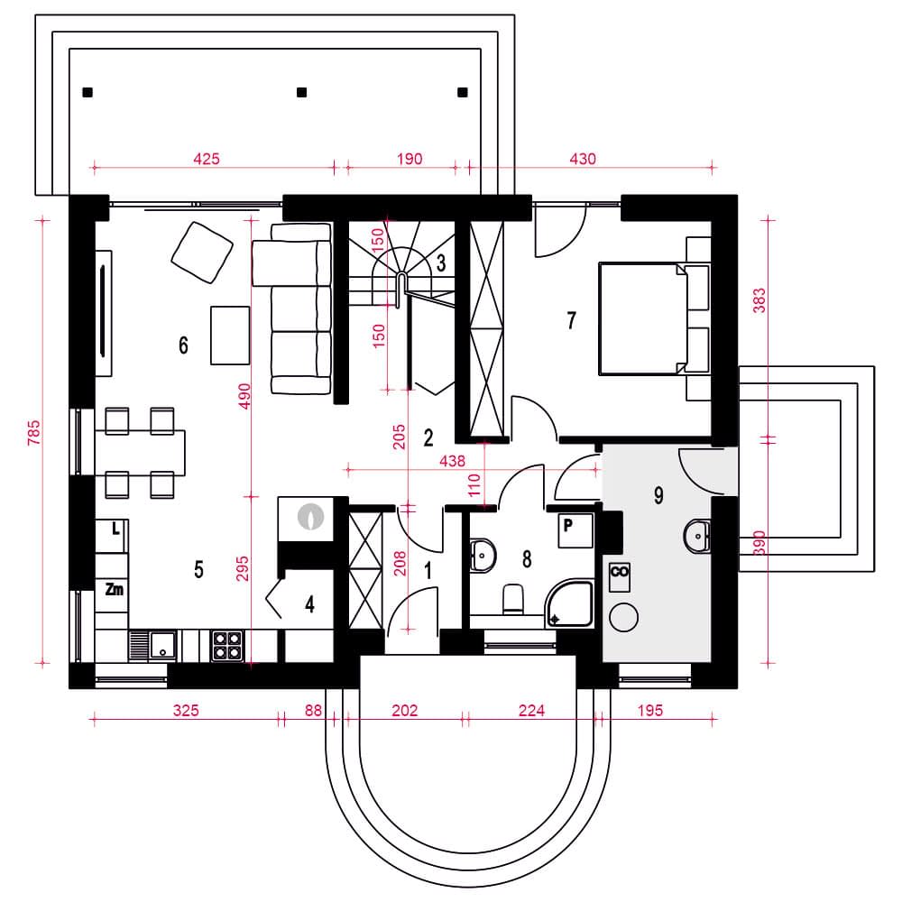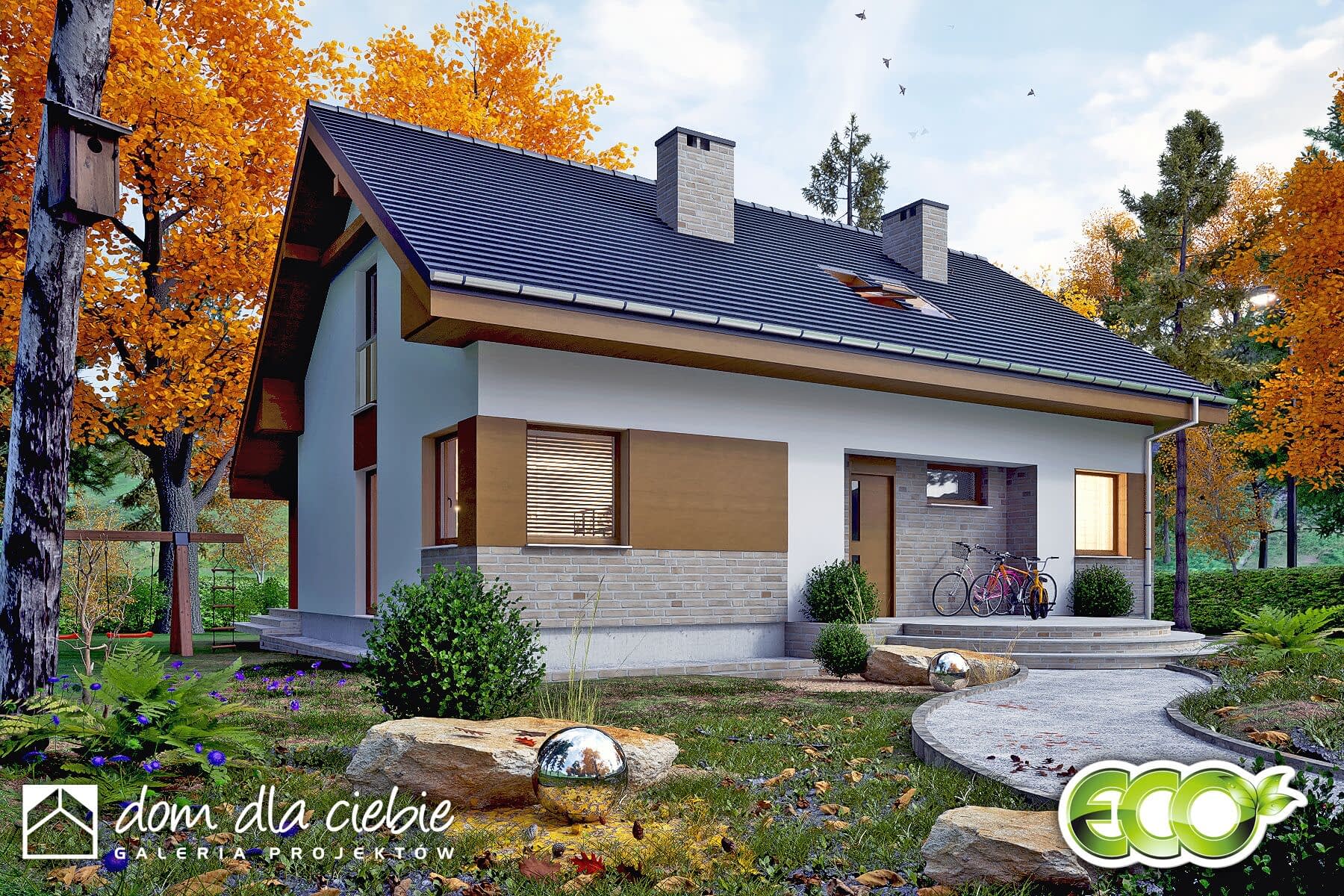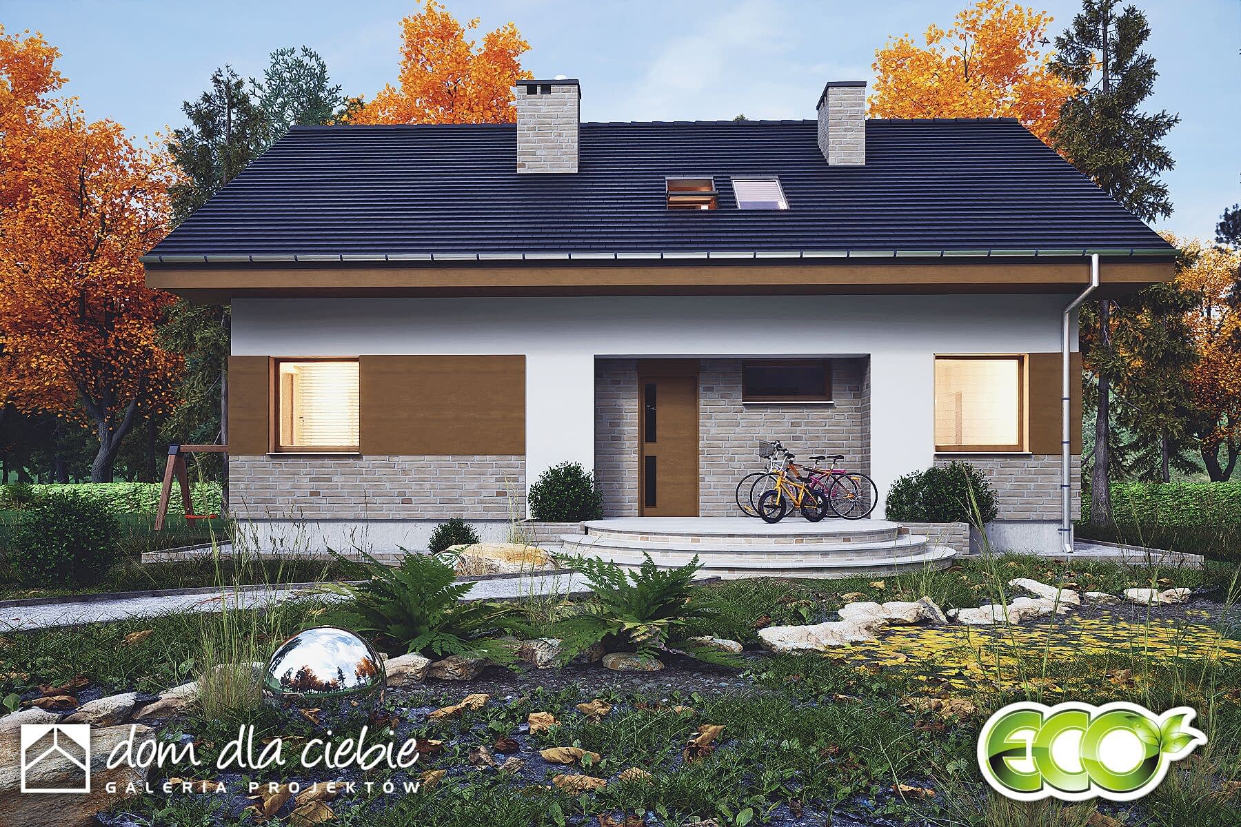 Paprotka to projekt oszczędnego domu z dwuspadowym dachem, idealnego dla czteroosobowej rodziny. Główne wejście prowadzi do wiatrołapu z praktycznymi szafami, a stamtąd do holu ze schodami, który dzieli przestrzeń na sypialnię i część dzienną. Obok schodów znajduje się funkcjonalna sypialnia dwuosobowa, a naprzeciwko - niewielka łazienka z prysznicem i pralką. Dalej korytarzem mamy dostęp do pomieszczenia technicznego.Strefa dzienna obejmuje salon z kuchnią i jadalnią. Przy kuchni zlokalizowano użyteczną spiżarnię oraz kominek, a salon łączy się z ogrodem poprzez zadaszony taras. W centralnej części tej strefy znajduje się miejsce na jadalnię. Wygodne schody prowadzą na poddasze, gdzie umieszczono dwie duże sypialnie z garderobami oraz wspólną łazienkę. Pod schodami przewidziano praktyczną garderobę.Ten projekt reprezentuje propozycję ekonomicznego i ekologicznego domu, doskonale nadającego się do zamieszkania przez cały rok, ze względu na uniwersalną architekturę.