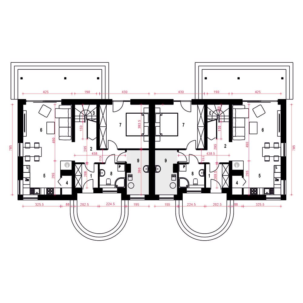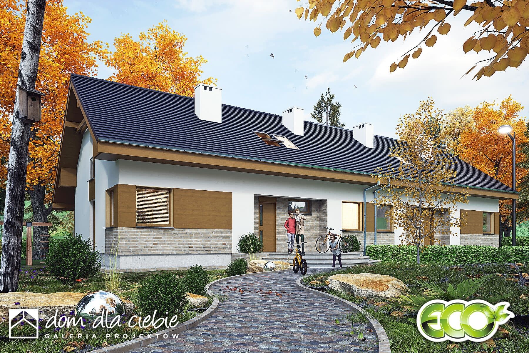 (Uwaga: projekty typu bliźniak oferujemy jako domy dwulokalowe, projekt można zamówić również w zabudowie bliźniaczej)Poniższy opis odnosi sie do jednego segmentu:Paprotka to projekt oszczędnego domu z dwuspadowym dachem, idealnego dla czteroosobowej rodziny. Główne wejście prowadzi do wiatrołapu z praktycznymi szafami, a stamtąd do holu ze schodami, który dzieli przestrzeń na sypialnię i część dzienną. Obok schodów znajduje się funkcjonalna sypialnia dwuosobowa, a naprzeciwko - niewielka łazienka z prysznicem i pralką. Dalej korytarzem mamy dostęp do pomieszczenia technicznego.Strefa dzienna obejmuje salon z kuchnią i jadalnią. Przy kuchni zlokalizowano użyteczną spiżarnię oraz kominek, a salon łączy się z ogrodem poprzez zadaszony taras. W centralnej części tej strefy znajduje się miejsce na jadalnię. Wygodne schody prowadzą na poddasze, gdzie umieszczono dwie duże sypialnie z garderobami oraz wspólną łazienkę. Pod schodami przewidziano praktyczną garderobę.Ten projekt reprezentuje propozycję ekonomicznego i ekologicznego domu, doskonale nadającego się do zamieszkania przez cały rok, ze względu na uniwersalną architekturę.