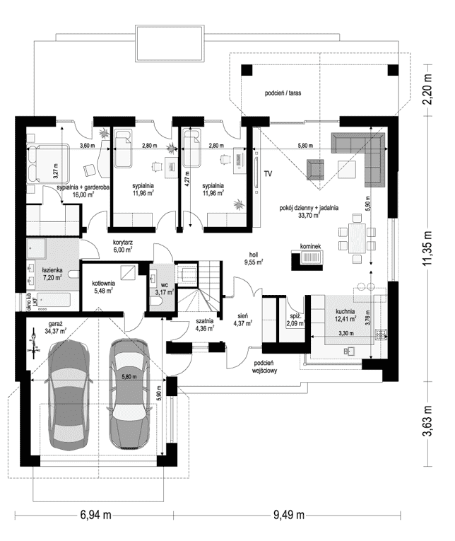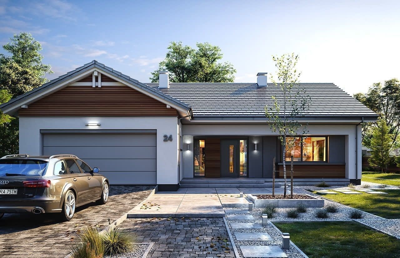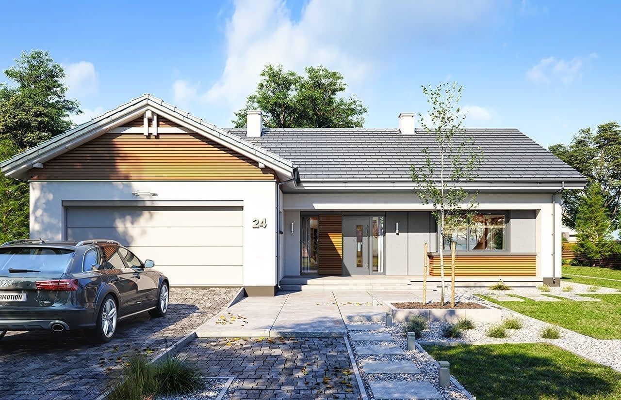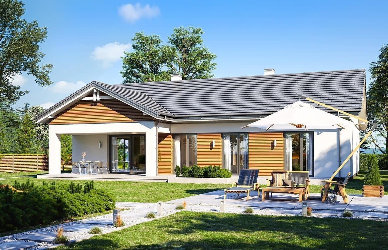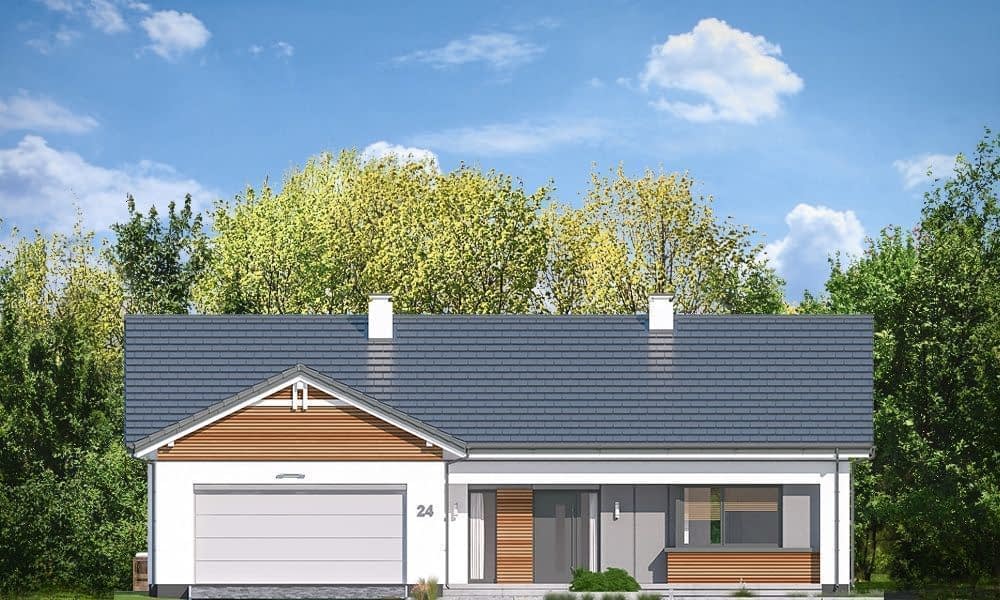 Projekt domu Parterowy 4 to kolejna propozycja z serii cieszących się dużą popularnością projektów Parterowych z MGProjekt. Tym razem to dom o dachu dwuspadowym, prosty w budowie i o nieskomplikowanej bryle. Prosta bryła nie jest jednak nieudanym kompromisem - ciekawe detale, materiały, ładne przeszklenia otwierające wnętrze na ogród tworzą w sumie bardzo atrakcyjny dom jednorodzinny. Całość domu przykrywa prostokątny dwuspadowy dach o kącie nachylenia 25 stopni, kryjący niewielki strych, który stanowi dodatkową przestrzeń do wykorzystania przez domowników - magazyn "rzeczy wszelkich". Wnętrze domu Parterowy 4: wszelkie funkcje mieszczą się na jednym poziomie, na parterze. Z ładnego przedsionka domostwa przechodzimy do holu i do części dziennej, z salonem, jadalnią i kuchnią. Kuchnia z narożnym oknem otwiera się na front domu. Obok kuchni mieści się spiżarnia. Z salonu mamy dwa duże okna - z jadalni na ogród, oraz przesuwne drzwi balkonowe - na taras i piękny podcień.Z holu przechodzimy korytarzem do części nocnej z sypialniami. Mieszczą się tutaj sypialnie: rodziców z garderobą, oraz dwa pokoje dzieci z szafami wbudowanymi. Wszystkie pokoje mają wyjścia na taras. Dodatkowo zaprojektowano łazienkę, oraz wc z kącikiem na pralkę i suszarkę. Z sieni mamy przejście przez szatnię do dwustanowiskowego garażu i kotłowni. Na strych wchodzimy schodami dostępnymi z holu. Strych to ponad 60 m2 dodatkowej przestrzeni. Może to być po prostu magazyn, a można z biegiem czasu wykorzystać tą powierzchnię jako poddasze użytkowe - wystarczy dodać kilka okien i już! Projekt domu Parterowy 4 został zaprojektowany w prostej, łatwej do budowy bryle. Budynek ma zwarty plan, będzie niedrogi w ogrzewaniu i tani w późniejszej eksploatacji. Zastosowane materiały i rozwiązania są energooszczędne. Projekt domu Parterowy 4 to doskonała propozycja dla Inwersorów chcących uzyskać maksymalny efekt z zainwestowanych przez siebie pieniędzy. Chcący ładnego, ale i praktycznego, oraz funkcjonalnego mieszkania dla siebie i swojej rodziny. Projekt domku Parterowy 4 można zamówić w odbiciu lustrzanym. Dostępne są także wariantowe projekty domów z serii Parterowych. Zapraszamy do zapoznania się z pełną ofertą pracowni MG Projekt: Parterowy, Parterowy 2, Parterowy 3.