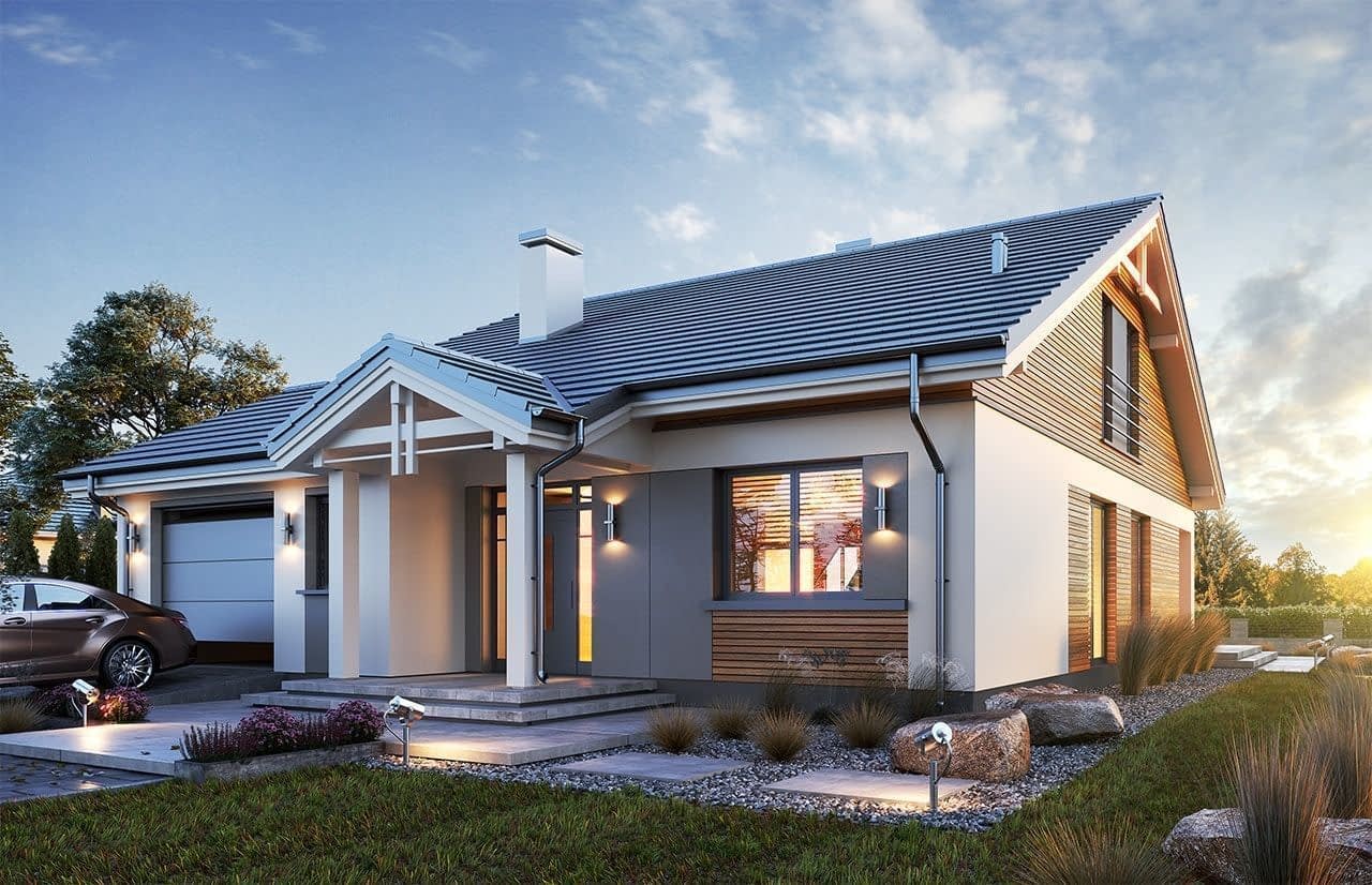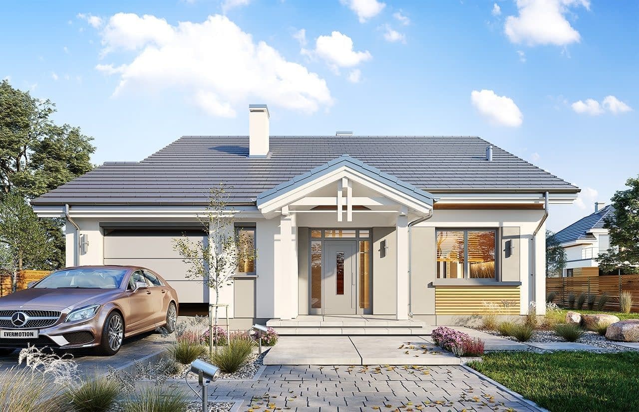 Projekt domu Parterowy wąski to projekt domu jednorodzinnego parterowego ze strychem / poddaszem do zagospodarowania, nawiązującego do popularnych projektów z serii ”Parterowy”. Tym razem jest to dom przewidziany na węższą działkę o szerokości poniżej 20tu metrów - prezentujemy dwie wersje architektury : tradycyjną - Parterowy wąski 1 i nowoczesną – Parterowy wąski 2. Bryła budynku jest prostokątna, przykryta dwuspadowym dachem, z dobudowanym gankiem wejściowym, oraz wysuniętą sypialnią przykrytą poprzecznym zadaszeniem. Elewację frontową ozdobiono wejściowym portykiem z przeszklonymi drzwiami wejściowymi zapraszającymi do wnętrza. Od strony ogrodowej mamy szerokie przeszklone drzwi z salonu na taras i podcień. Nowoczesna architektura domu, duże przeszklenia, elewacje podzielone pasami zróżnicowanych okładzin dają w efekcie atrakcyjną sylwetkę budynku. Wnętrze parteru podzielone zostało na część dzienną - z salonem, cześć gospodarczą - z garażem i kotłownią, oraz sypialnie. Do wnętrza wchodzimy wygodnym przedsionkiem, do holu połączonego z salonem z jadalnią i kuchnią ze spiżarką. Salon ma podniesiony aż do dachu sufit nad częścią z meblami wypoczynkowymi, kominkiem i ścianą TV - otwarcie w stropie, przy założeniu zagospodarowania poddasza jako użytkowego, może być antresolą nad salonem z barierką. Na lewo od wejścia mamy kotłownię i garaż. Przechodząc wgłąb domu, trafiamy do sypialni - rodziców z garderobami, dwóch dziecięcych i dużej łazienki. Nad parterem mamy do dyspozycji duży strych, który może być przestrzenią magazynową, albo można go wykorzystać jako dodatkowe poddasze użytkowe – jeśli zajdzie taka potrzeba. Projekt domu Parterowy wąski został zaprojektowany jako energooszczędny. Jego bardzo dobre izolacje, nowoczesne instalacje sprawią, że koszt eksploatacji budynku będzie niewielki. Projekt domu Parterowy wąski powinien przypaść do gustu osobom, które chcą postawić niewielki dom, z wszystkimi pomieszczeniami na parterze, w nowoczesnej atrakcyjnej architekturze, którzy dysponują dość wąską parcelą. Bryła budynku jest prosta - dom będzie łatwy do wybudowania. W wersji podstawowej projekt ma nad parterem strop żelbetowy monolityczny i tradycyjną więźbę dachową, ale projekt występuje też w drugiej wersji - bardziej ekonomicznej - z prefabrykowaną więźbą dachową i stropem z wiązarów kratownicowych, których wykonanie z montażem nasza pracownia MG Projekt oferuje w naszym zakładzie prefabrykacji MG Domy. Zapraszamy!