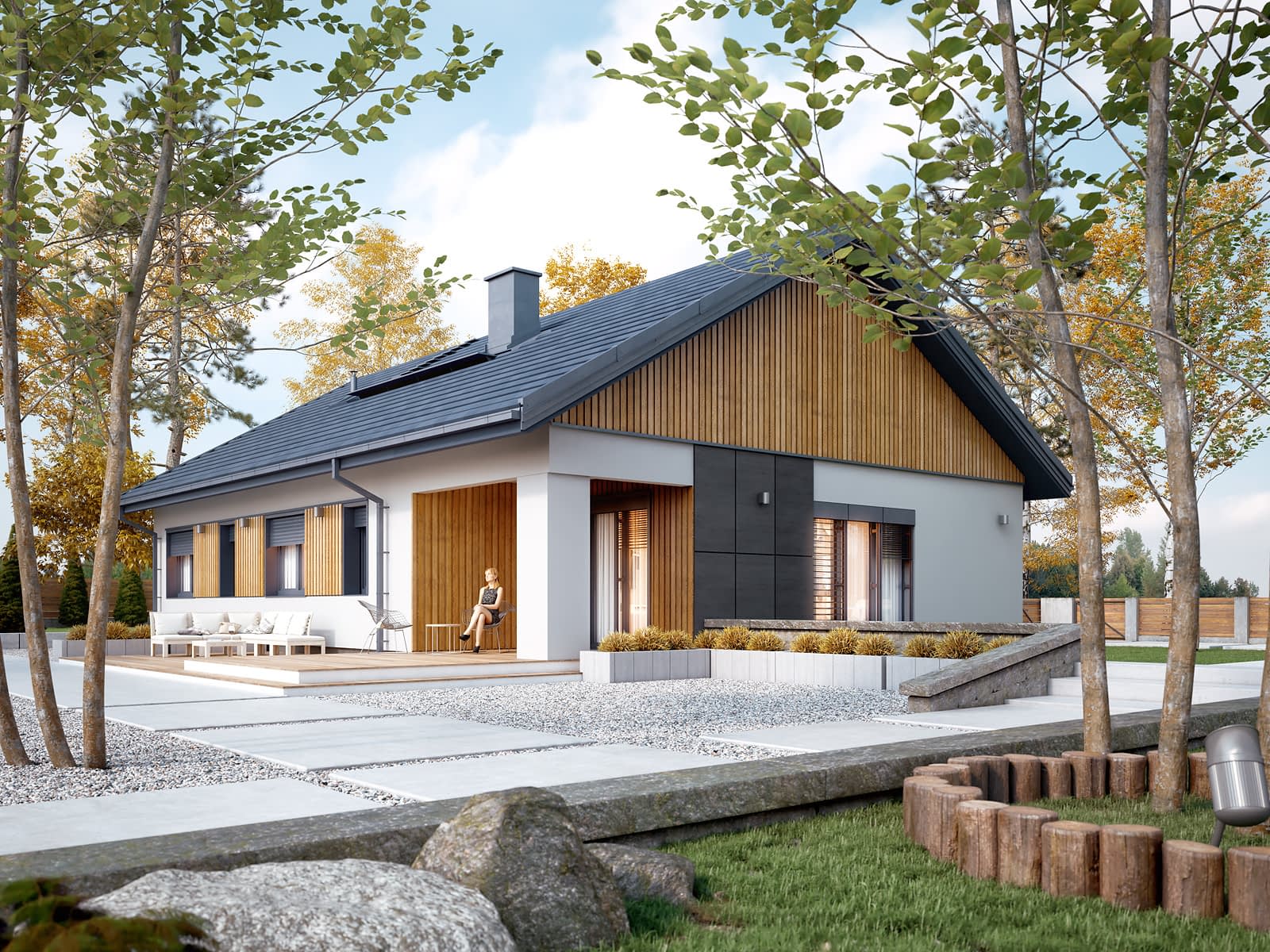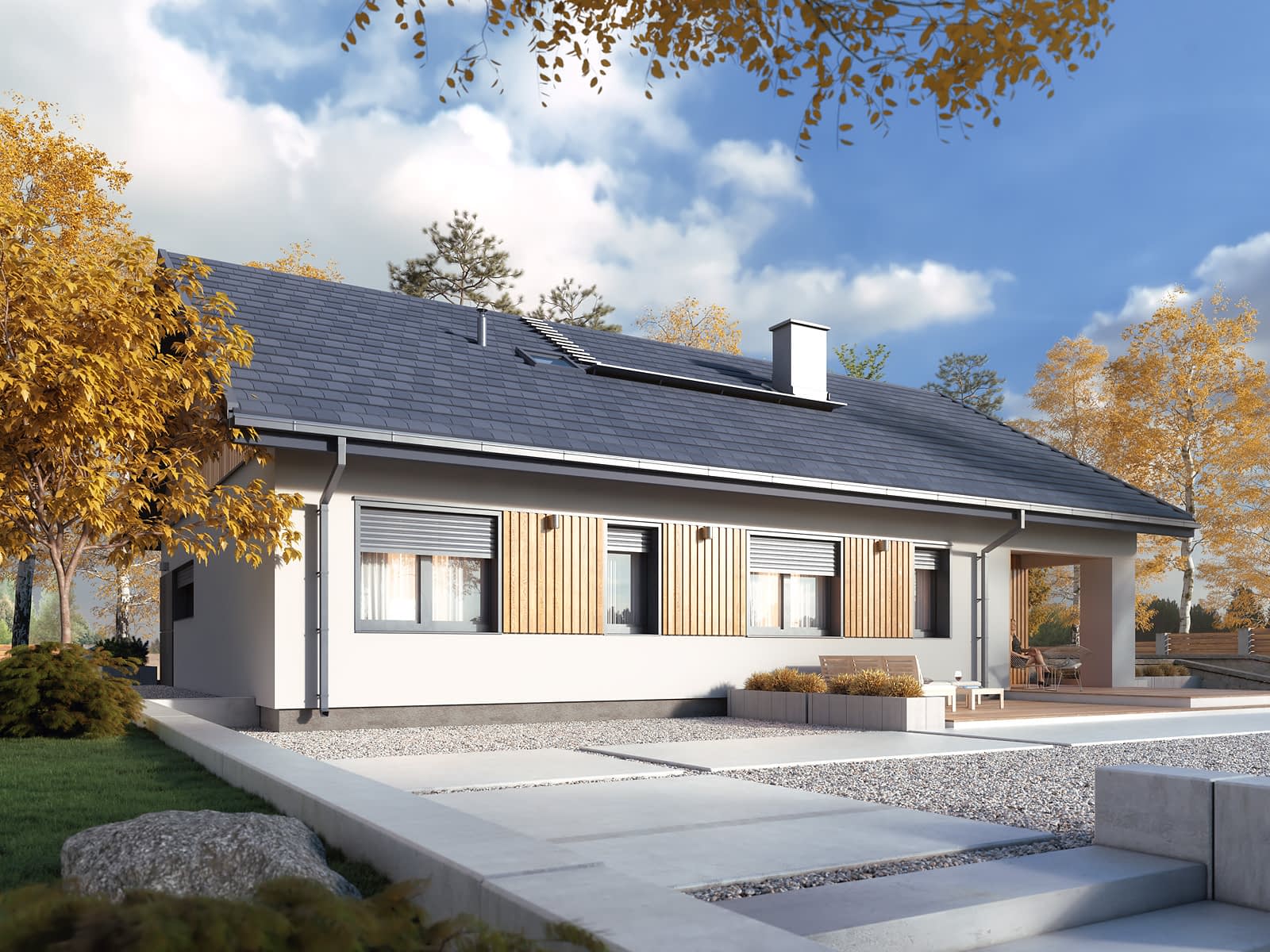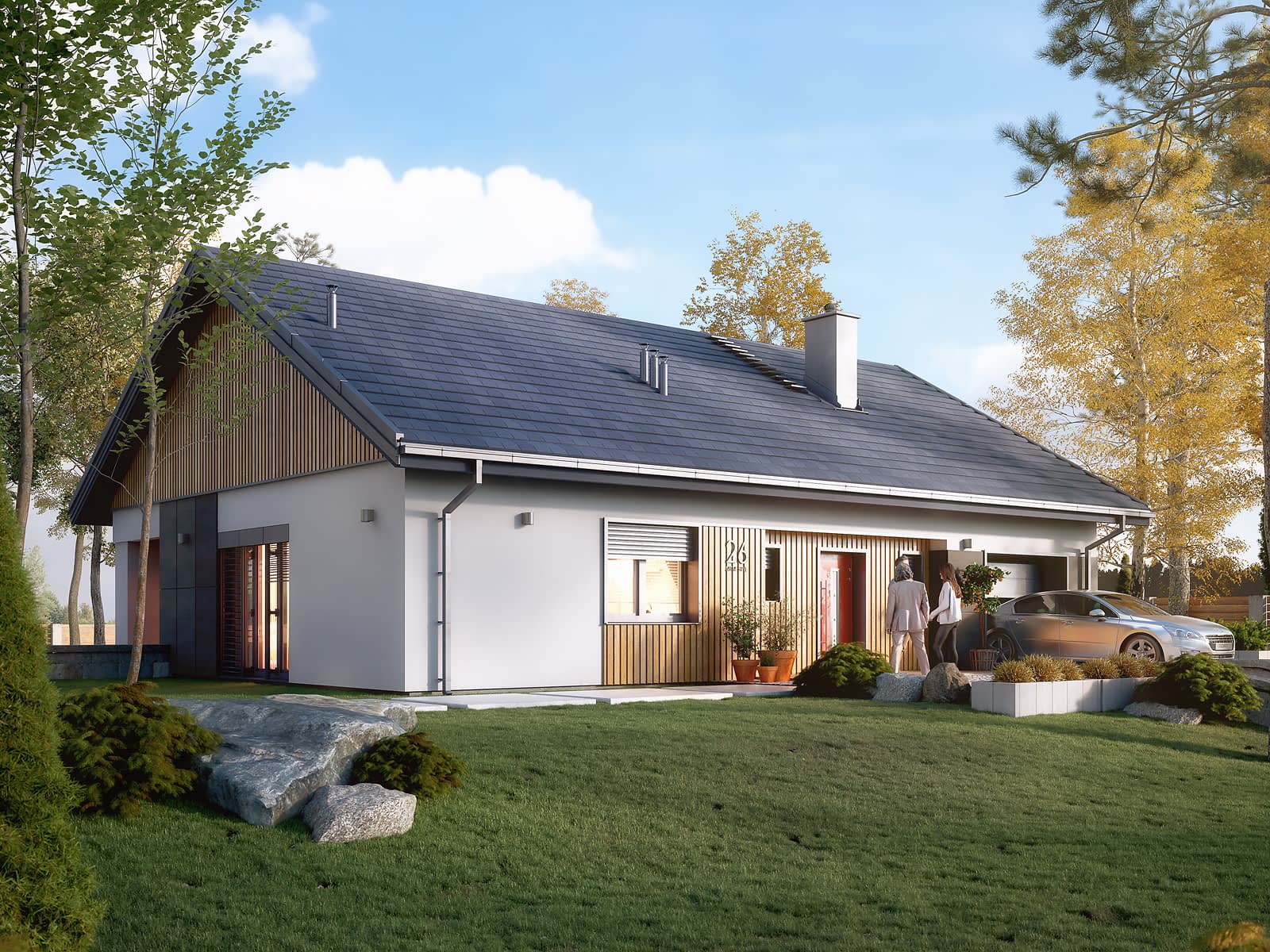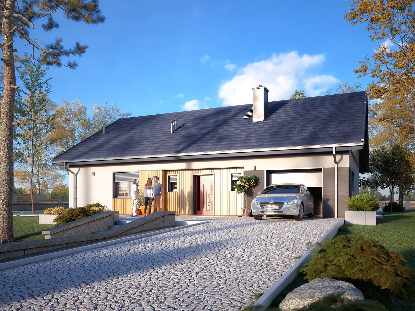 Projekt Pasja to niewielki dom idealny dla kilkuosobowej rodziny stworzony z pasją. Część dzienną tworzy salon z otwartą kuchnią i spiżarnią. Część nocna to dwie przestronne sypialnie, z których jedna posiada wydzieloną garderobę. Dodatkowo w programie funkcjonalnym przewidziana została łazienka, wc oraz spiżarnia. Wygodę i komfort użytkowania podkreśla duża, ogólnodostępna garderoba. Dodatkowym atutem projektu jest jednostanowiskowy garaż znajdujący się w bryle budynku.Konstrukcja