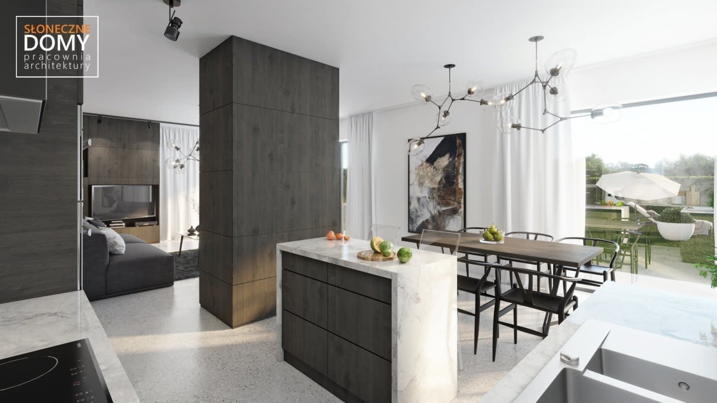 Na elewacji zastosowano ciemne detale nadające nowoczesny charakter oraz jasne drewno dzięki czemu projekt doskonale wpisuje się każde otoczenie. Na zewnątrz uwagę przyciągają również rozległe tarasy, zaprojektowane aby przyszli mieszkańcy mogli cieszyć się własnym ogrodem nie tylko w strefie dziennej.