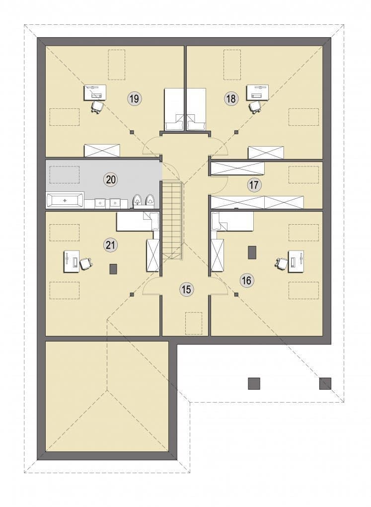 Na poddaszu zaprojektowano cztery pokoje oraz dostępne z korytarza łazienkę i garderobę.