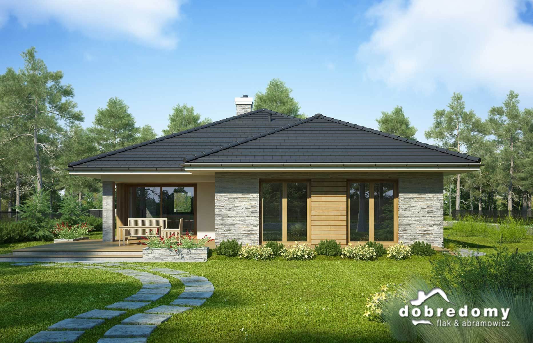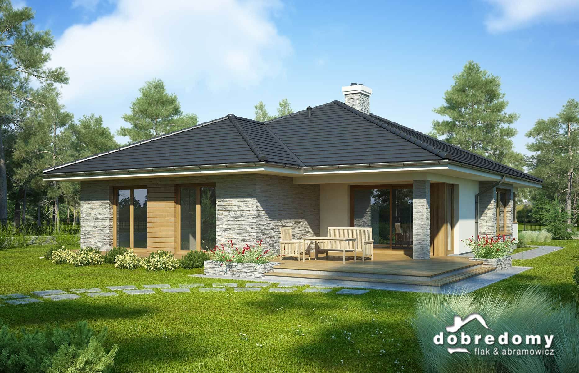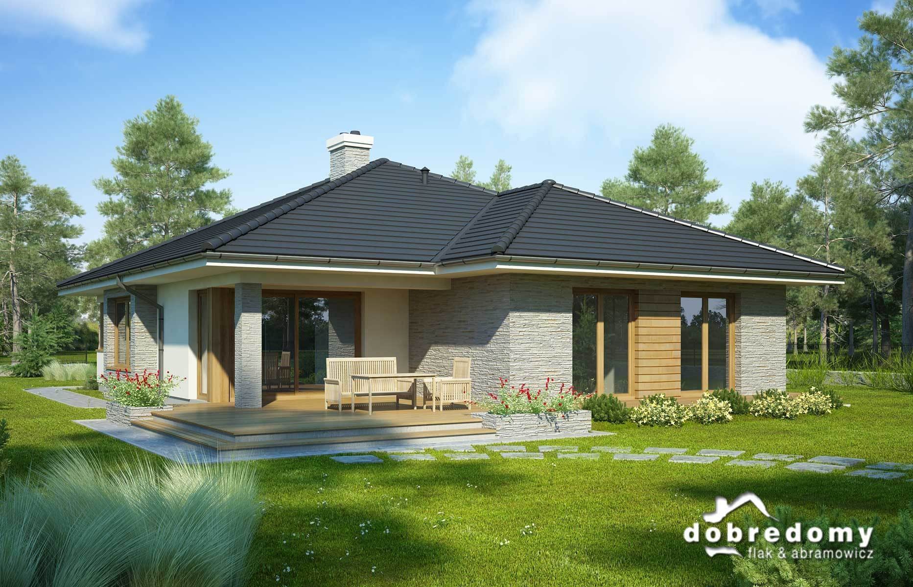 Parterowy dom w nowoczesnym stylu dla 4-5-osobowej rodziny. Wnętrze, mimo niewielkiej powierzchni użytkowej, jest bardzo funkcjonalne. Otwarta strefa dzienna składa się z jasnego salonu, jadalni i kuchni ze spiżarnią. W strefie prywatnej przewidziano trzy sypialnie. Wśród pozostałych zalet tego domu należy wymienić: dodatkowe wc, wydzielone miejsce na szafę wnękową w hallu czy bezpośrednio przejście z wiatrołapu do garażu.
