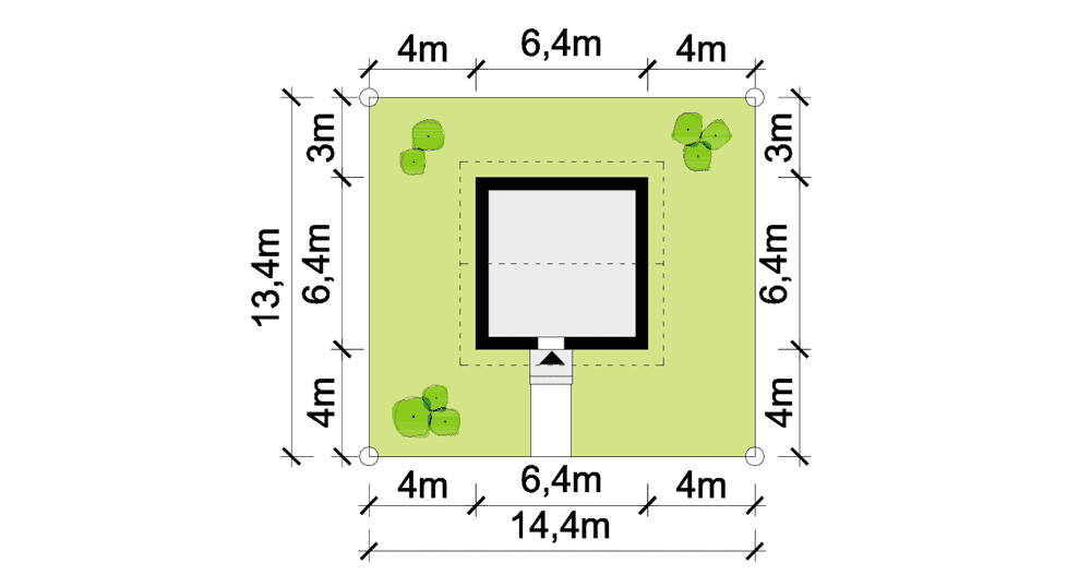 - Minimalne wymiary działki6.4 x 14.4m
