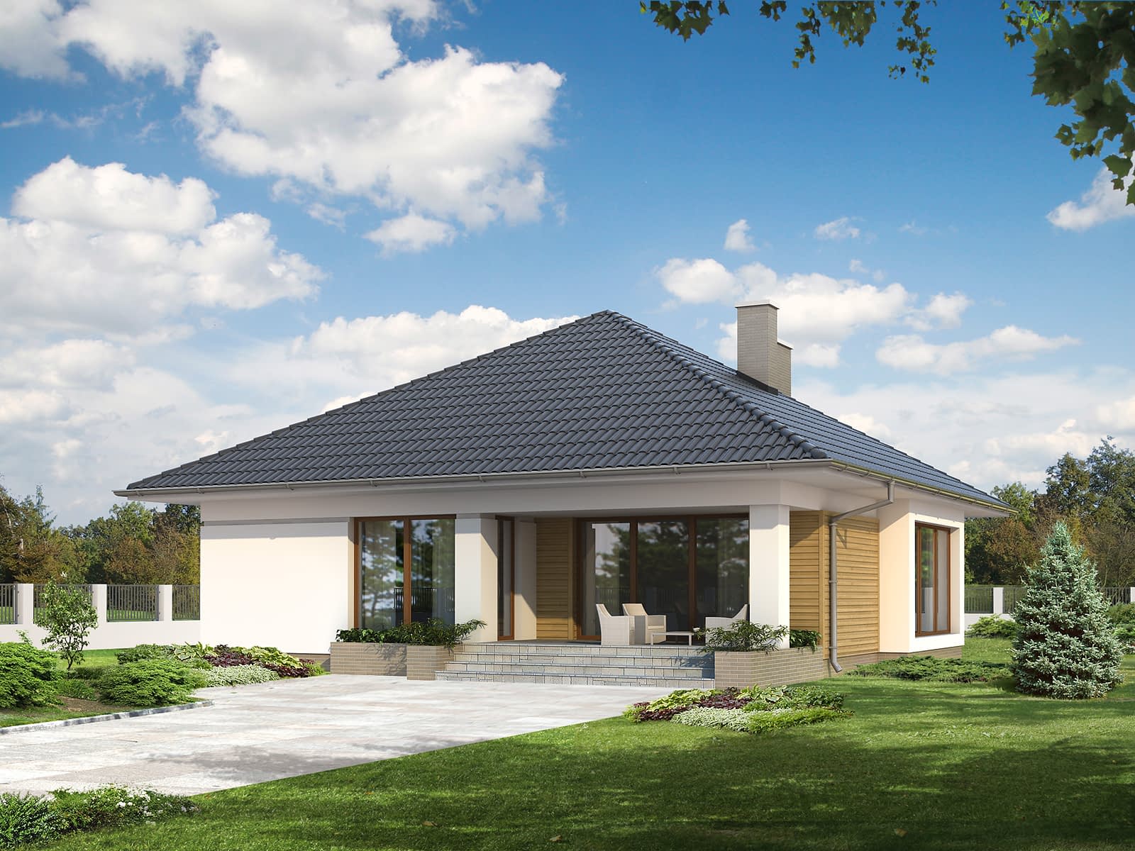 Średniej wielkości dom parterowy, niepodpiwniczony, przeznaczony dla 4-osobowej rodziny. Zaletą projektu jest przestronna część dzienna z wyraźnie wydzieloną, przeszkloną jadalnią. W części nocnej przewidziano trzy sypialnie i łazienkę. Atutem projektu jest zadaszony taras oraz spora kotłownia.Konstrukcja