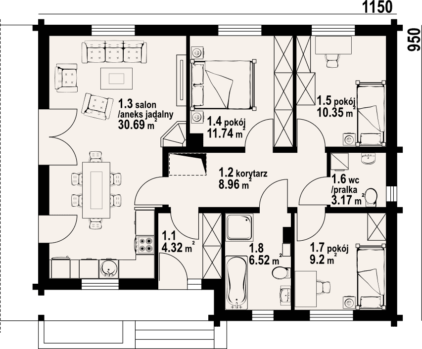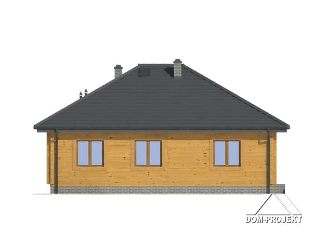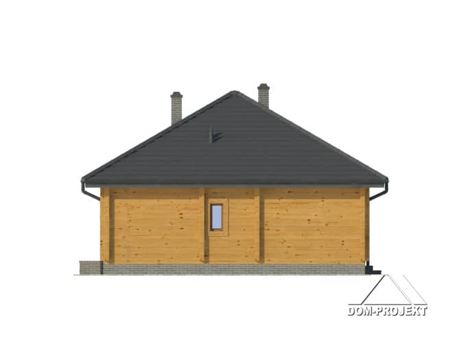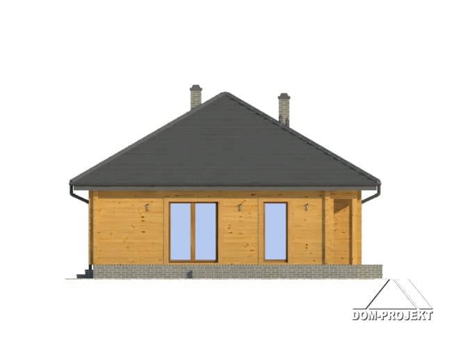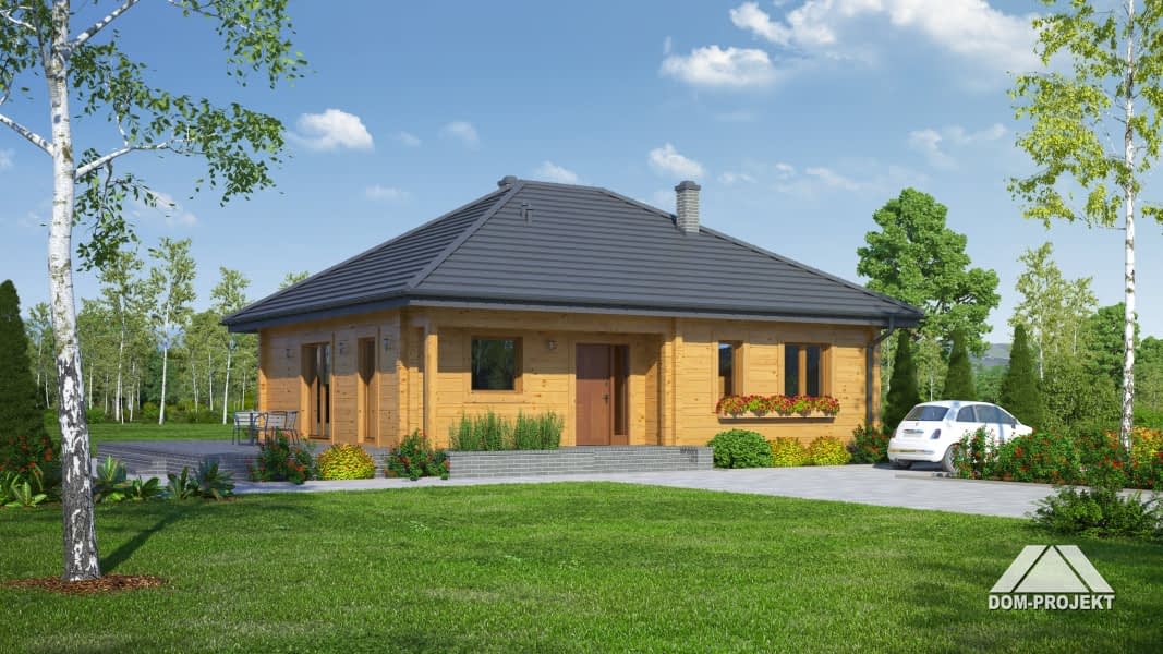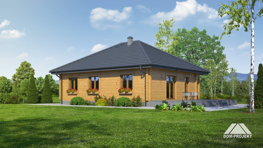 Dom parterowy z bali drewnianych. Duży salon z aneksem kuchennym, kominkiem i wyjściem na taras. Trzy pokoje, łazienka, wc z pralką, wiatrołap i korytarz. Wyjście na poddasze schodami rozkładanymi. Na poddaszu strych.Rzuty