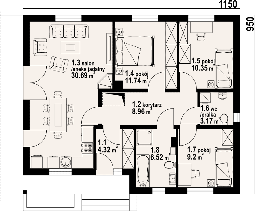 - 1.3 - salon z aneksem kuchennym30.69 m²