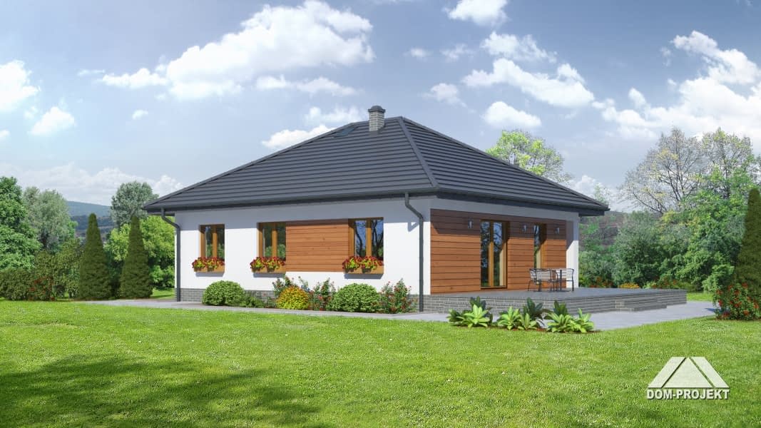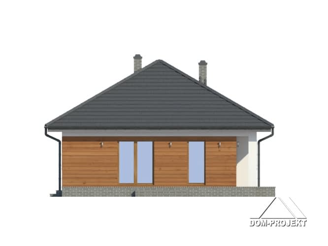 Dom parterowy. Duży salon z aneksem kuchennym, kominkiem i wyjściem na taras. Trzy pokoje, łazienka, wc z pralką, wiatrołap i korytarz. Wyjście na poddasze schodami rozkładanymi. Na poddaszu strych.Rzuty