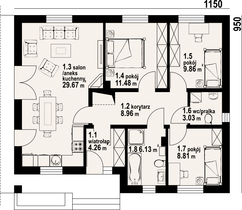 - 1.3 - salon z aneksem kuchennym29.67 m²