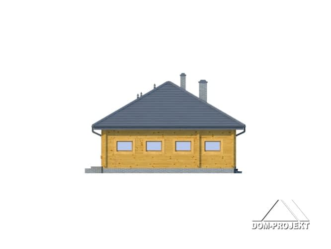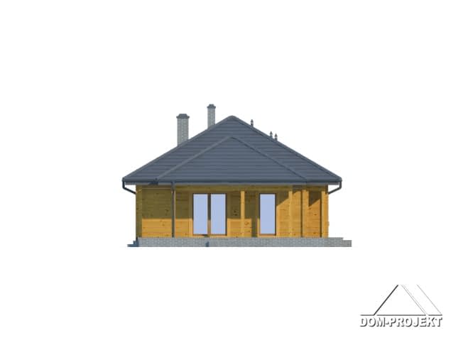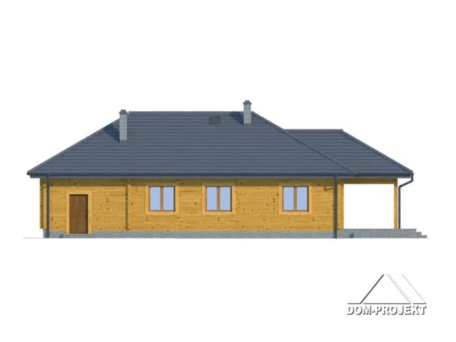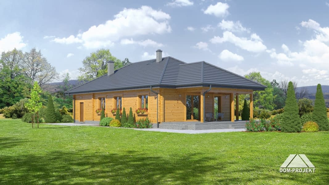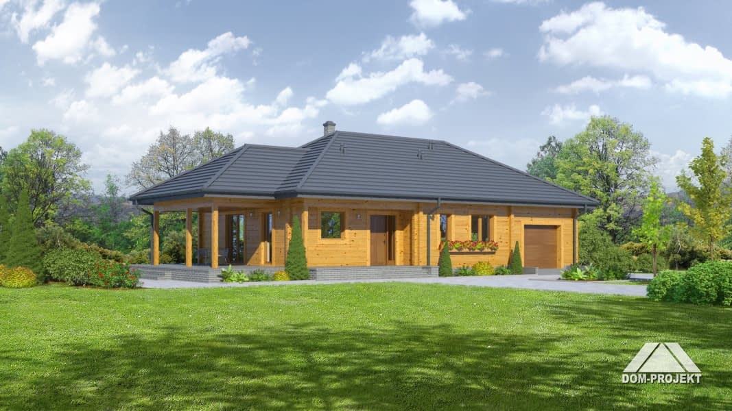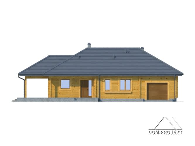 Dom parterowy z bali. Duży salon z aneksem kuchennym, kominkiem i wyjściem na zadaszony taras. Trzy pokoje, łazienka, wc, korytarz i wiatrołap. W korytarzu schody rozkładane na strych. Garaż, kotłownia.Rzuty