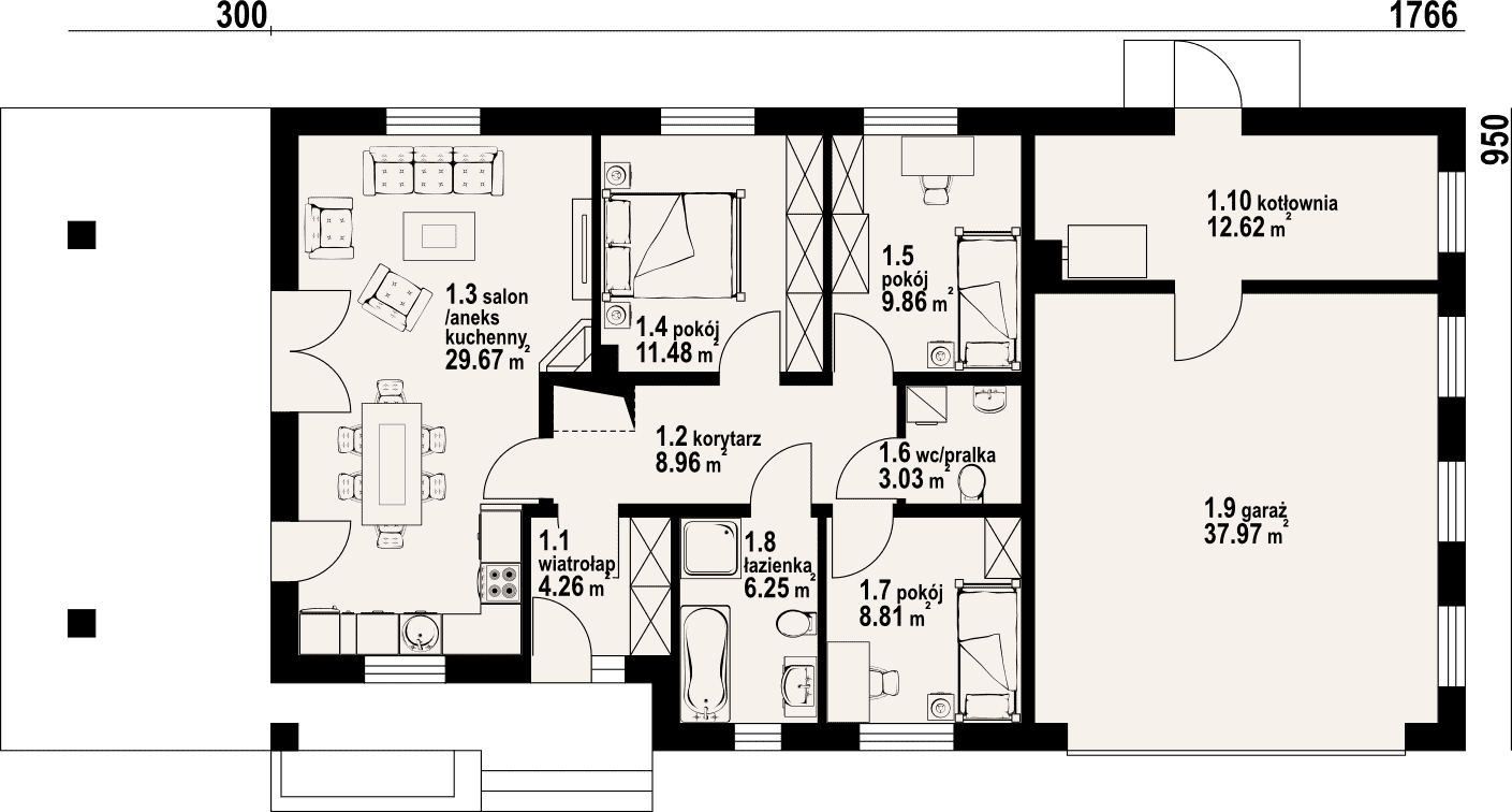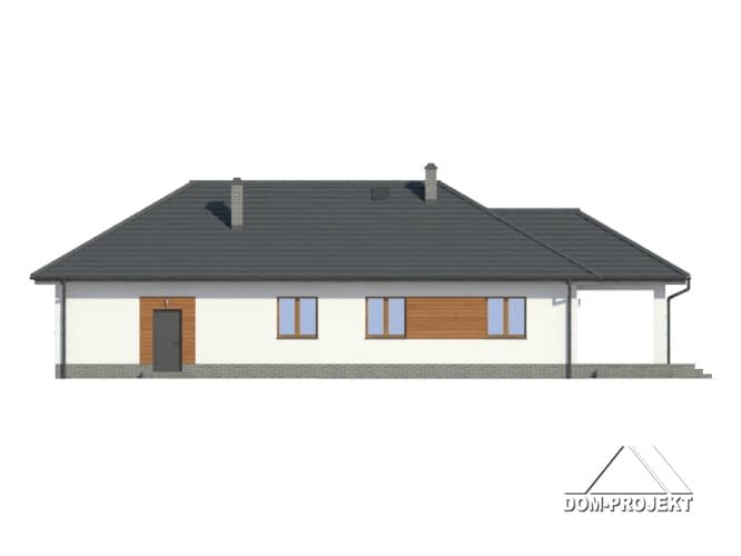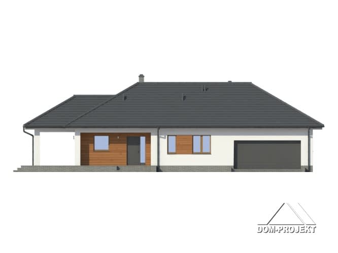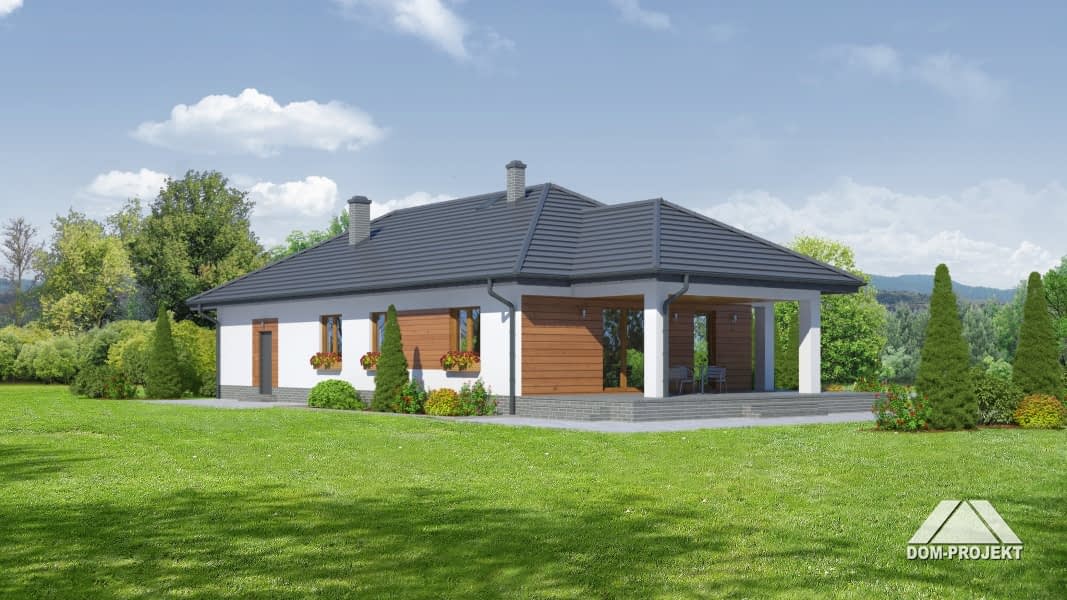 Dom parterowy. Duży salon z aneksem kuchennym, kominkiem i wyjściem na zadaszony taras. Trzy pokoje, łazienka, wc z pralką, wiatrołap i korytarz. Garaż dwustanowiskowy, kotłownia. Wyjście na poddasze schodami rozkładanymi. Na poddaszu strych.Rzuty