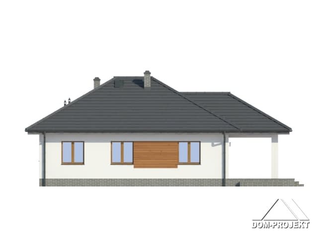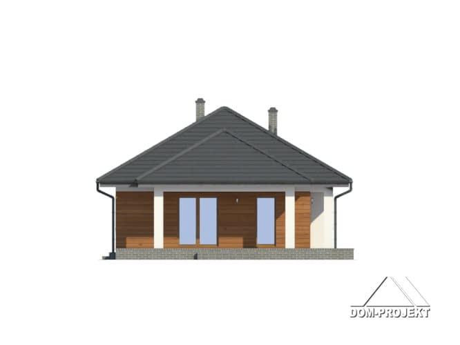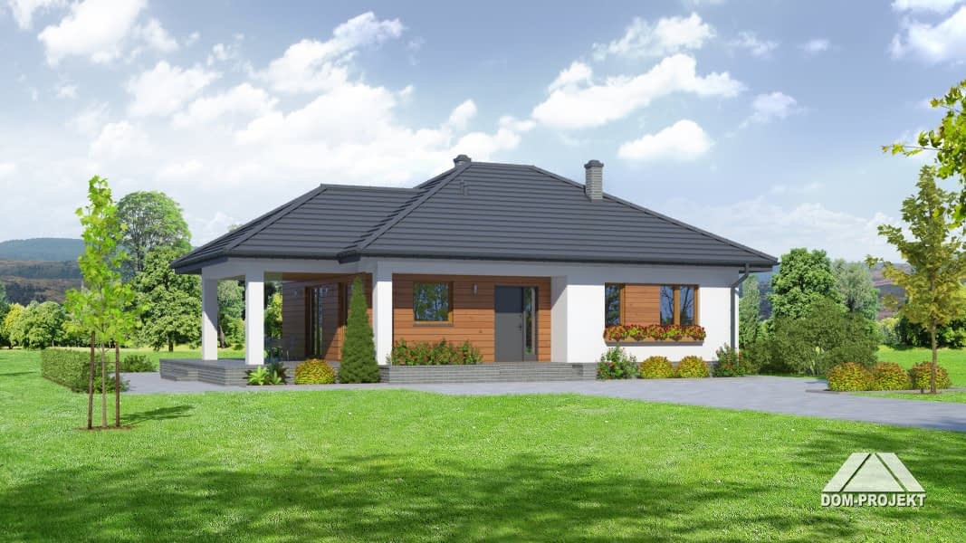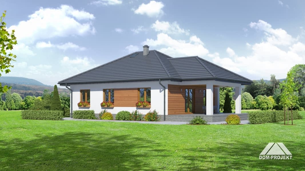 Dom parterowy. Duży salon z aneksem kuchennym, kominkiem i wyjściem na zadaszony taras. Trzy pokoje, łazienka, wc z pralką, wiatrołap i korytarz. Wyjście na poddasze schodami rozkładanymi. Na poddaszu strych.Rzuty