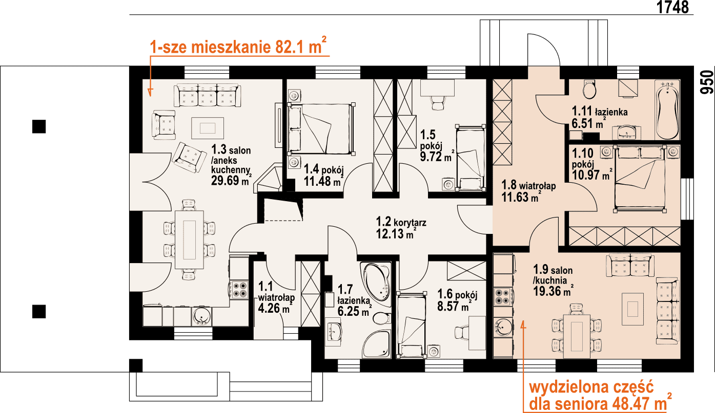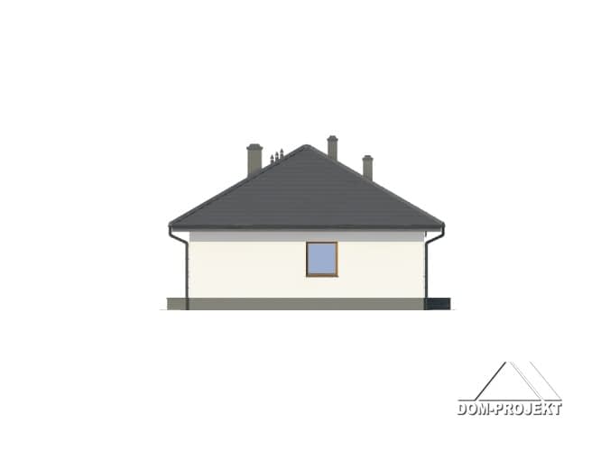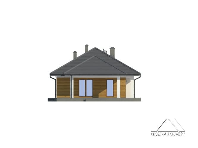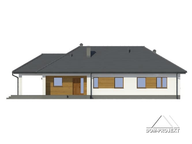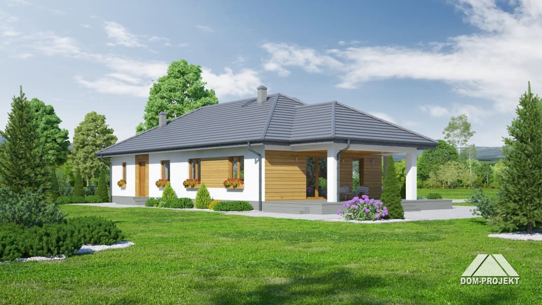 Dom parterowy z wydzielonym mieszkaniem dla seniora. Mieszkanie główne: duży salon z aneksem kuchennym, kominkiem i wyjściem na zadaszony taras. Trzy pokoje, łazienka, wiatrołap i korytarz. W mieszkaniu dla seniora: salon z aneksem kuchennym, pokój, łazienka i korytarz. Dostęp do strychu schodami rozkładanymi. Na strychu możliwość składania starych mebli itp.Rzuty