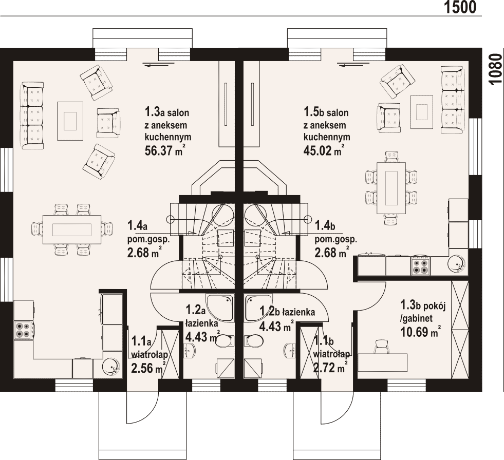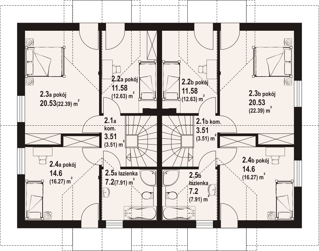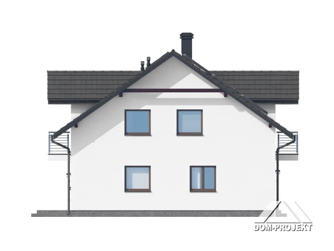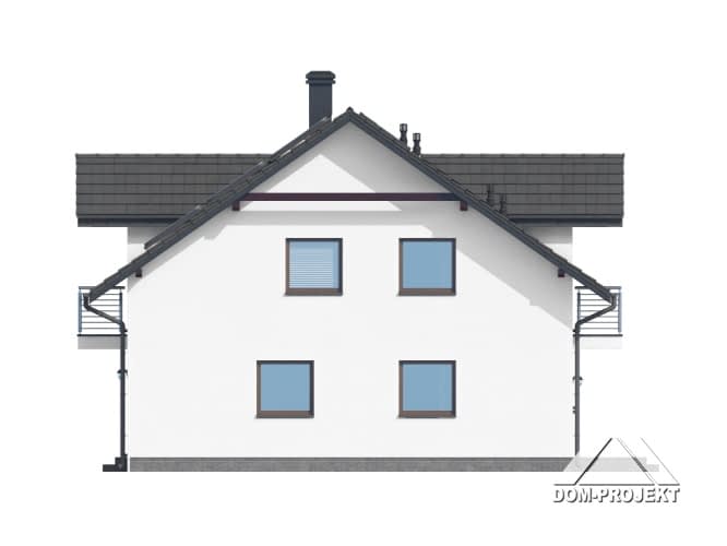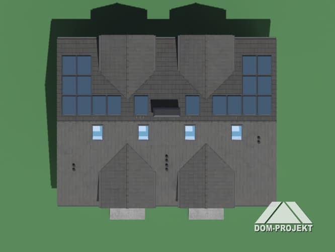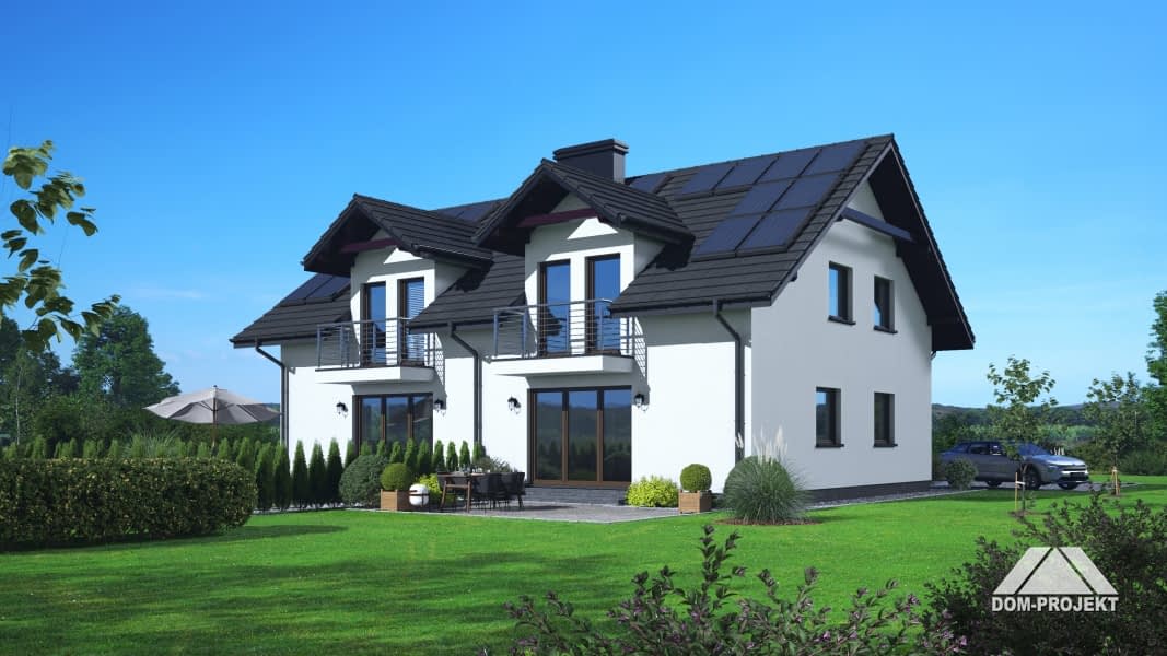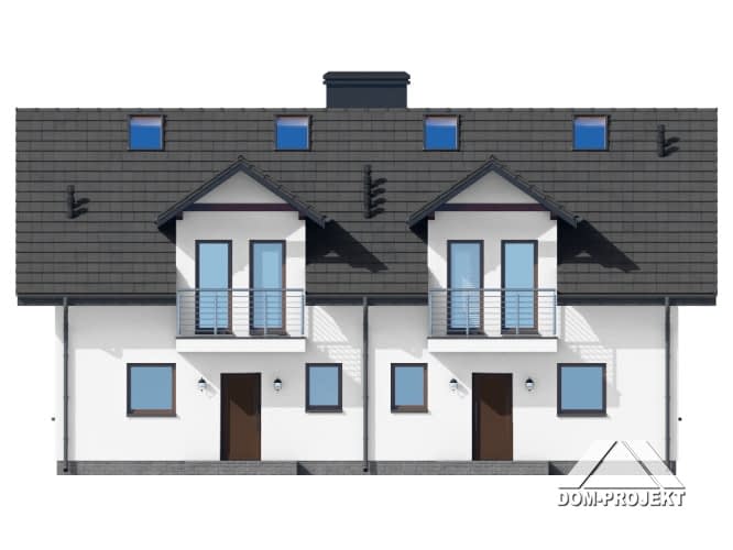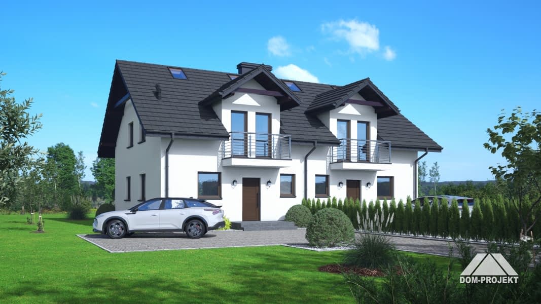Dom z dwoma mieszkaniami. W pierwszym mieszkaniu: na parterze salon z aneksem kuchennym, kominkiem oraz wyjściem na taras. Pomieszczenie gospodarcze, łazienka, wiatrołap. Na poddaszu trzy pokoje, łazienka, komunikacja, dwa balkony. W drugim mieszkaniu: salon z aneksem kuchennym, kominkiem oraz wyjściem na taras. Pokój/ gabinet, łazienka, wiatrołap, pomieszczenie gospodarcze. Na poddaszu trzy pokoje, łazienka, komunikacja, dwa balkony. Zwarta bryła budynku i dach dwuspadowy sprzyjają szybkiej i taniej budowie i niskim kosztom eksploatacji.Rzuty