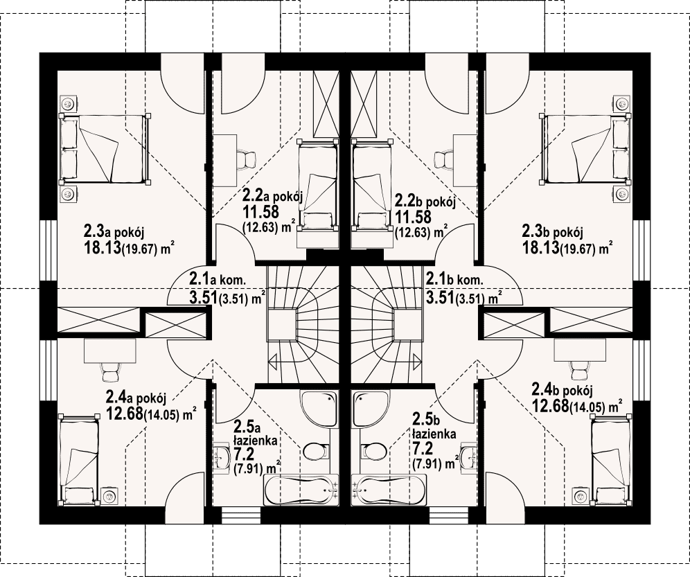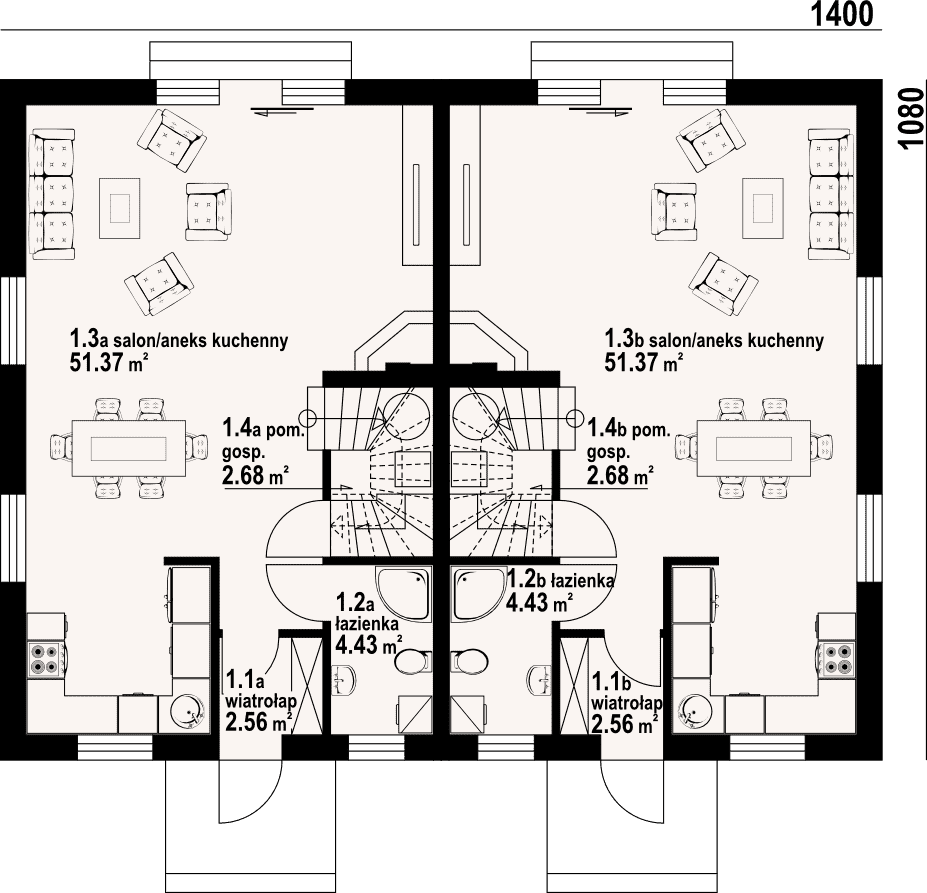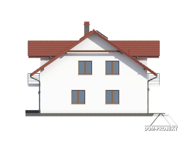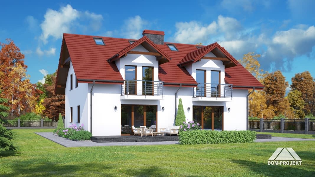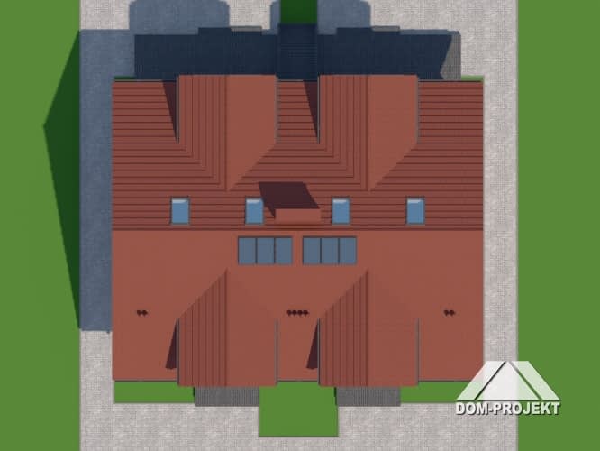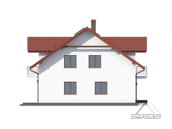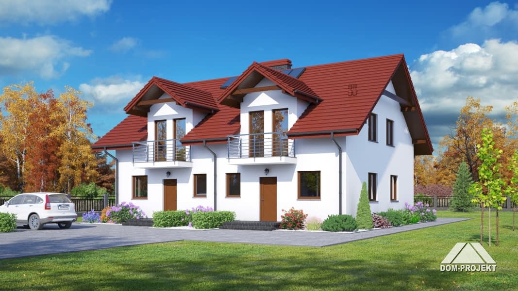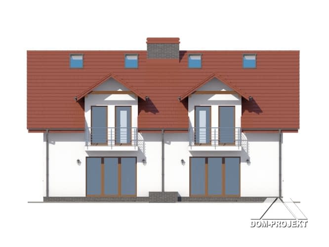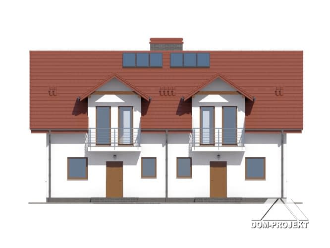 Dom dwulokalowy. Każdy lokal składa się z: dużego salonu z kominkiem i wyjściem na taras, aneksu kuchennego,łazienki, wiatrołapu, pomieszczenia gospodarczego i schodów na piętro. Na piętrze: trzy pokoje, łazienka, komunikacja i dwa balkony, Z piętra wyjście na strych (możliwość dodatkowego zagospodarowania). Zwarta bryła budynku i dach dwuspadowy sprzyjają szybkiej i taniej budowie i niskim kosztom eksploatacji.Rzuty
