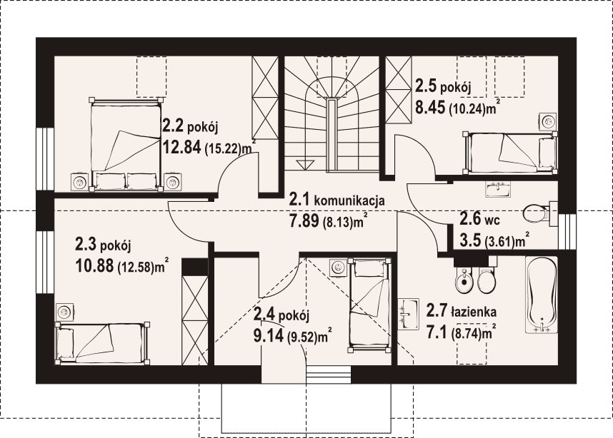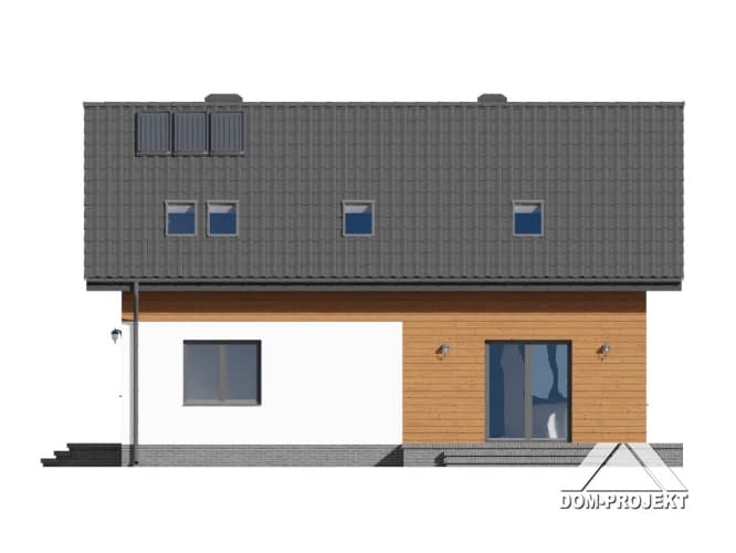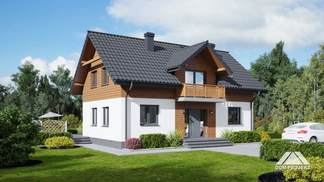 Dom z poddaszem. Duży salon z aneksem kuchennym, kominkiem, wyjściem na taras i schodami na poddasze. Pokój, łazienka, wiatrołap i kotłownia. Na poddaszu cztery pokoje, łazienka, wc, komunikacja i balkon.Zwarta bryła budynku i dach dwuspadowy sprzyjają szybkiej i taniej budowie i niskim kosztom eksploatacji.Rzuty