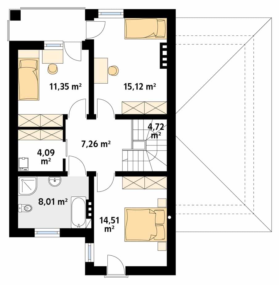 Pinia 2 to dwukondygnacyjny dom dla 4 - 5-osobowej rodziny z garażem jednostanowiskowym. Na parterze zaprojektowano bardzo funkcjonalną przestrzeń z aneksem kuchennym i częścią jadalną, połączoną z ogrodem szklaną witryną. Na parterze znajduje się również klimatyczny salon z kominkiem oraz wc. Garaż z kotłownią są połączone z częścią mieszkalną wewnętrznym wejściem. Na piętrze znajdują się trzy sypialnie, łazienka oraz pralnia z garderobą. Dom charakteryzuje się nowoczesnym wyglądem i prostą bryłą na rzucie prostokąta.Konstrukcja