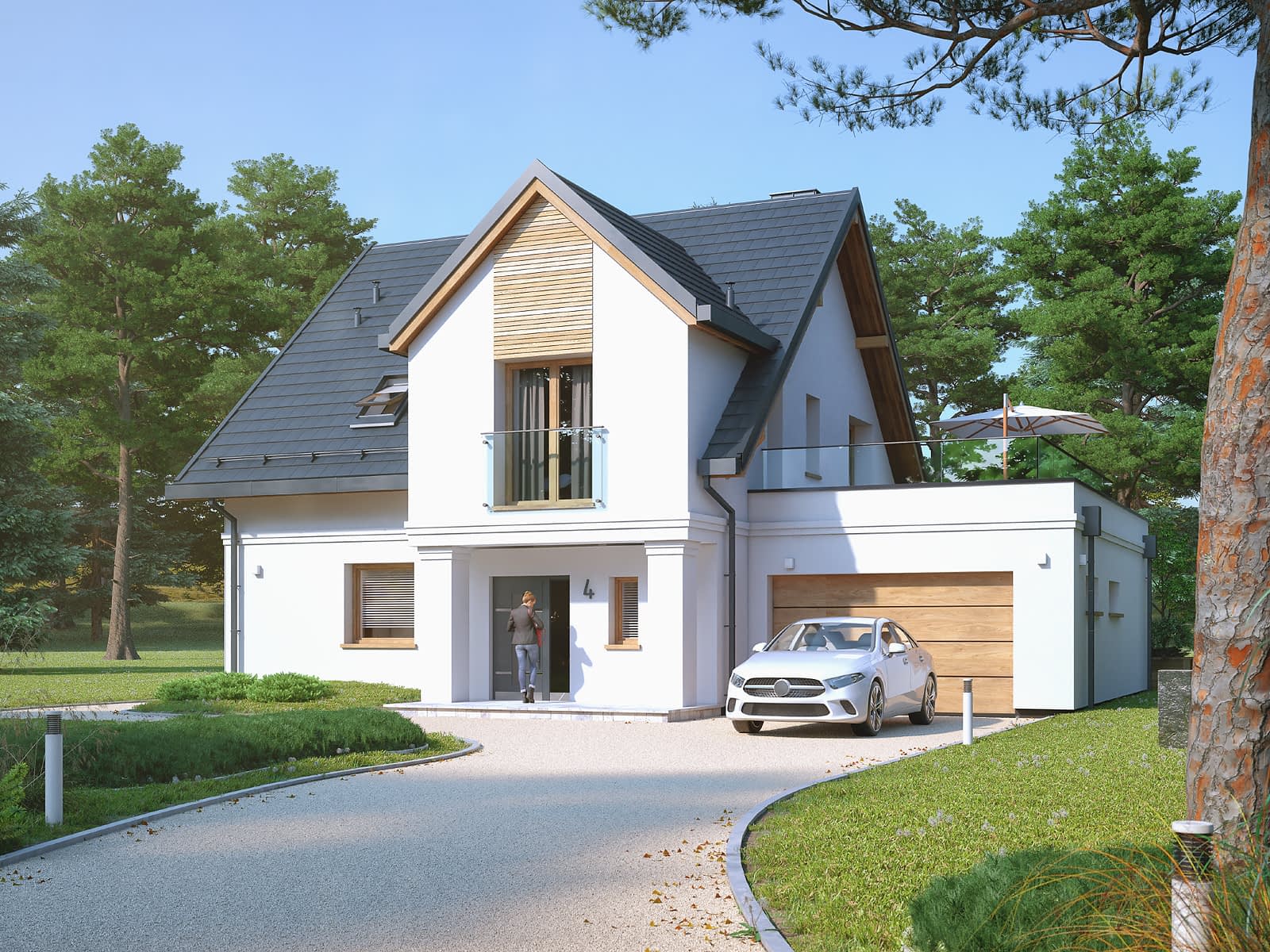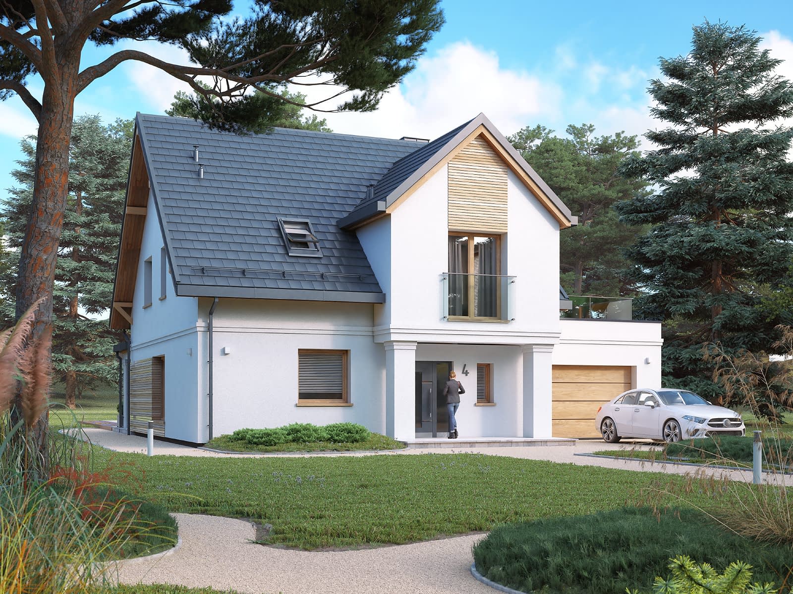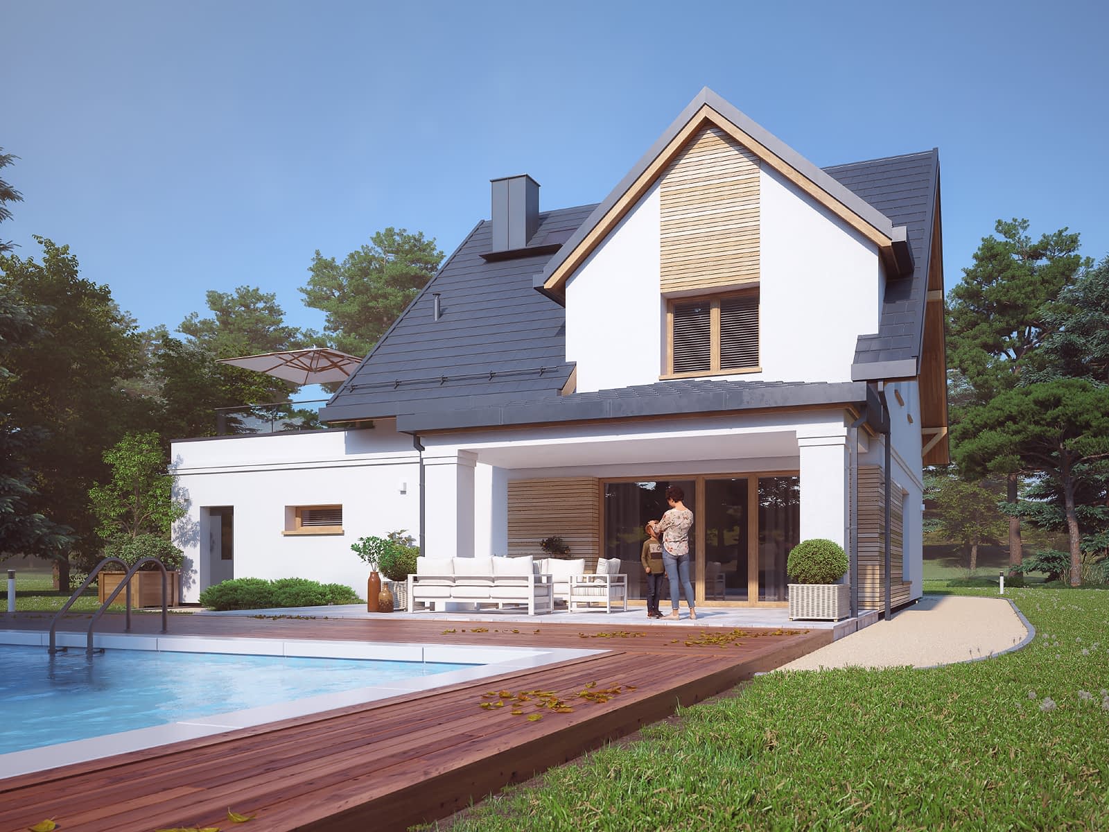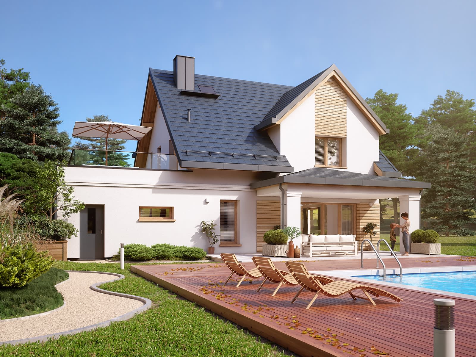 Pinia 3 to projekt domu z użytkowym poddaszem o powierzchni prawie 170 m2. Na parterze mieszkańcy do dyspozycji mają otwartą strefę dzienną z salonem, jadalnią i kuchnią. Przy kuchni zaprojektowano praktyczną spiżarnię. Poddasze to trzy wygodne sypialnie i rodzinna łazienka. Niewątpliwym atutem projektu jest duży garaż przy którym pojawiło się funkcjonalne pomieszczenie gospodarcze oraz zadaszony taras.Konstrukcja