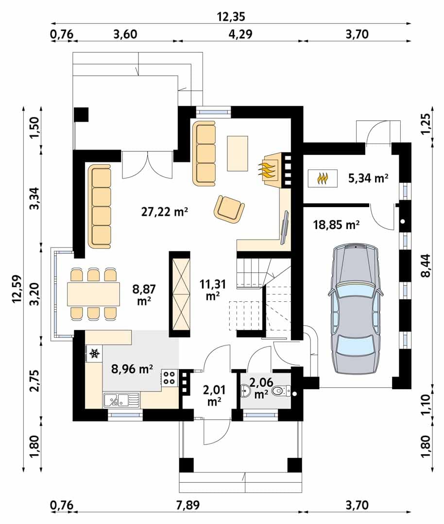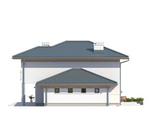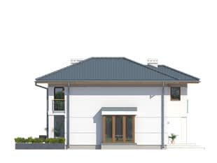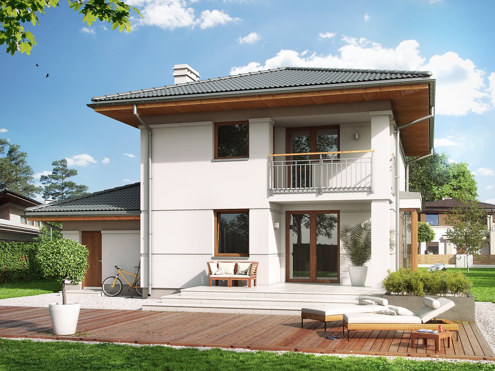 Dom jednorodzinny dla 4 – 5-osobowej rodziny, dwukondygnacyjny, z garażem, niepodpiwniczony. Na parterze zaprojektowano jednoprzestrzenną część dzienną z wydzielonymi aneksami: kuchennym, jadalnianym połączonym z ogrodem szklaną witryną oraz pokojem dziennym z kominkiem. Garaż i pomieszczenie techniczne łączą się z domem wewnętrznym wejściem. Na piętrze trzy sypialnie, łazienka i pralnia z garderobą. Dwie pełne kondygnacje dają możliwość łatwej aranżacji pomieszczeń także na piętrze. Dom charakteryzuje się zwartą bryłą o nowoczesnym wyglądzie.Konstrukcja