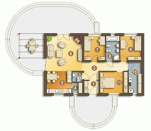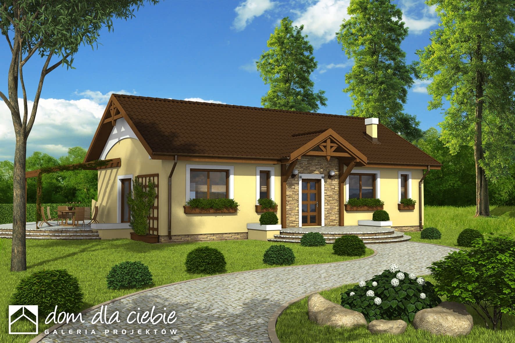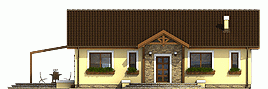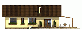 Niewielki dom jednorodzinny parterowy. Zaprojektowany z myślą o 4 osobowej rodzinie. Nieskomplikowana bryła, pozwoli na znaczne obniżenie kosztów budowy (prostokątny obrys domu oraz dach dwuspadowy). Posiada wyraźny podział na strefę dzienną, w skład której wchodzi kuchnia ze spiżarnią, jadalnia, pokój dzienny i wc, oraz nocną do której zaliczają się trzy pokoje, łazienka i pomieszczenie gospodarcze. Polecamy!