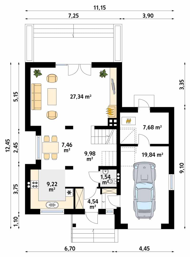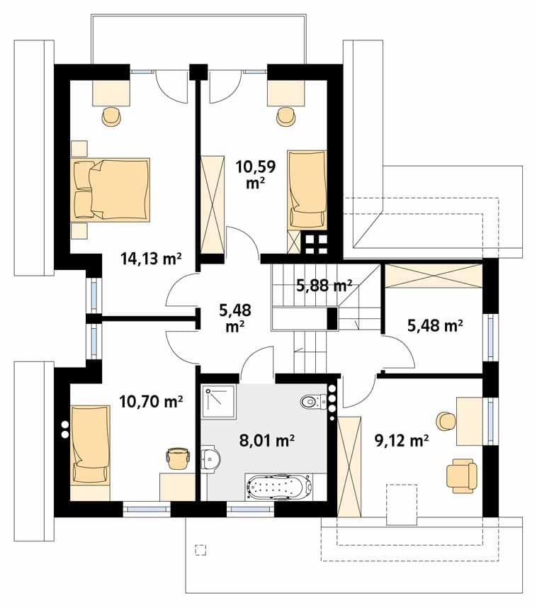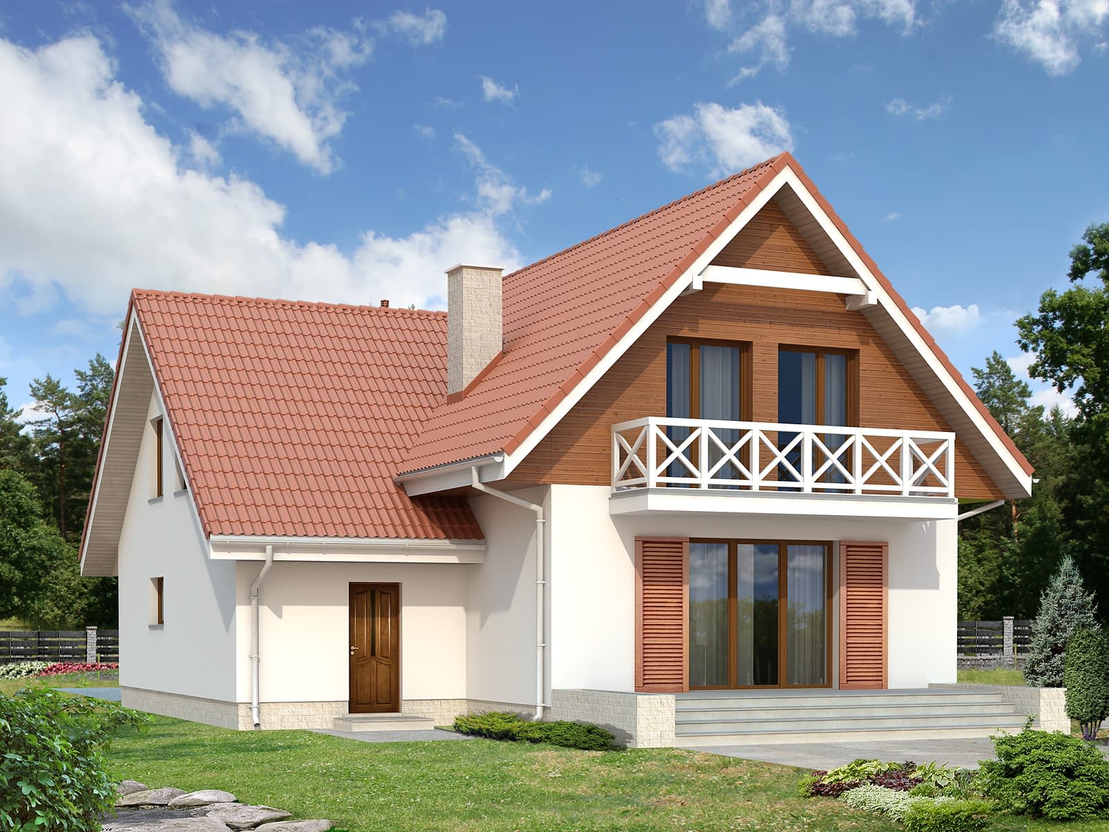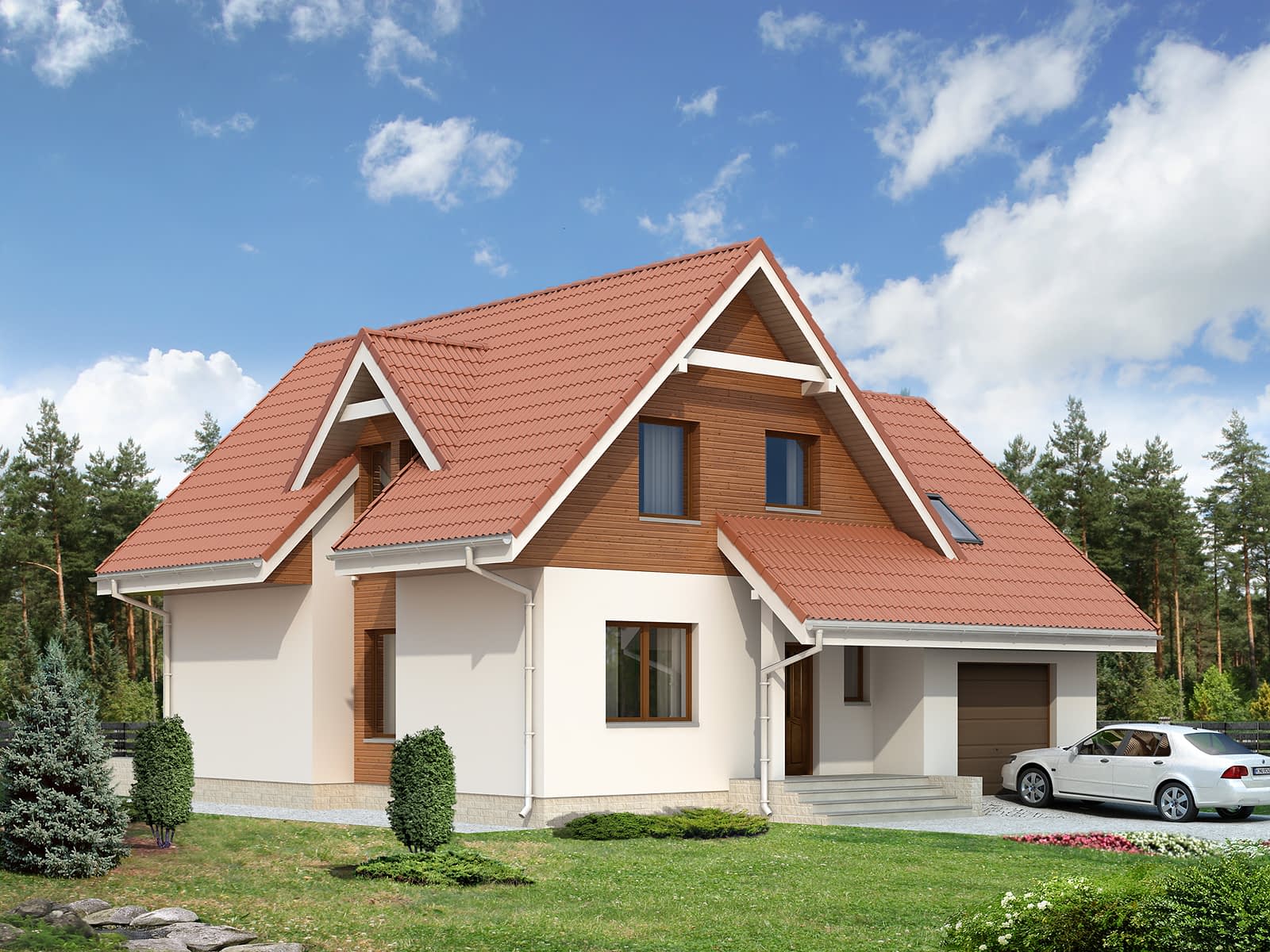 Dom jednorodzinny wolno stojący, parterowy z użytkowym poddaszem. Na parterze w części dziennej znajduje się przestrzenny pokój dzienny oraz kuchnia połączoną z jadalnią. Nad garażem na półpiętrze znajduje się garderoba oraz pokój lub gabinet. Na piętrze zaprojektowano 3 sypialnie z oddzielną łazienką.Konstrukcja