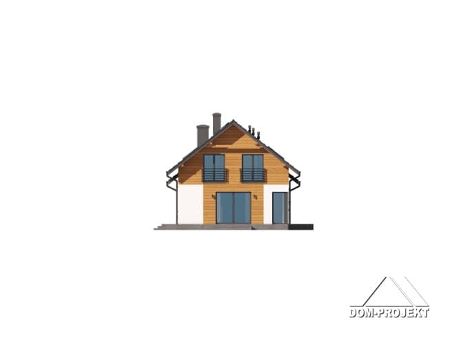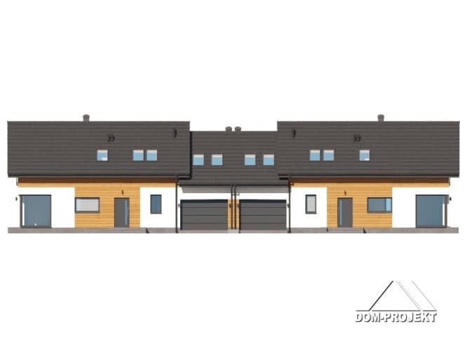 Dom - bliźniak, nowoczesny, wygodny, z atrakcyjnymi przeszkleniami w strefie dziennej. Segmenty połączone ze sobą garażami (z kotłownią). Przestrzeń w obu segmentach została zaaranżowana tak samo. Na parterze przewidzieliśmy bardzo wygodny salon z otwartą kuchnią, wyjściem na taras i kominkiem. Dodatkowy pokój może pełnić rolę sypialni lub domowego biura. Program użytkowy parteru uzupełnia wiatrołap i łazienka oraz kotłownia z wejściem od garażu. Na poddaszu trzy wygodne, duże sypialnie, łazienka oraz wspólna garderoba. Nad garażem strychRzuty
