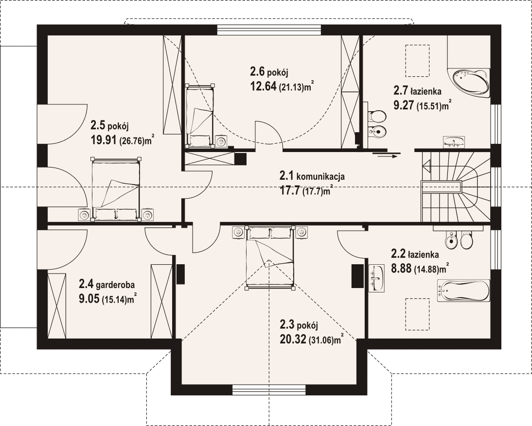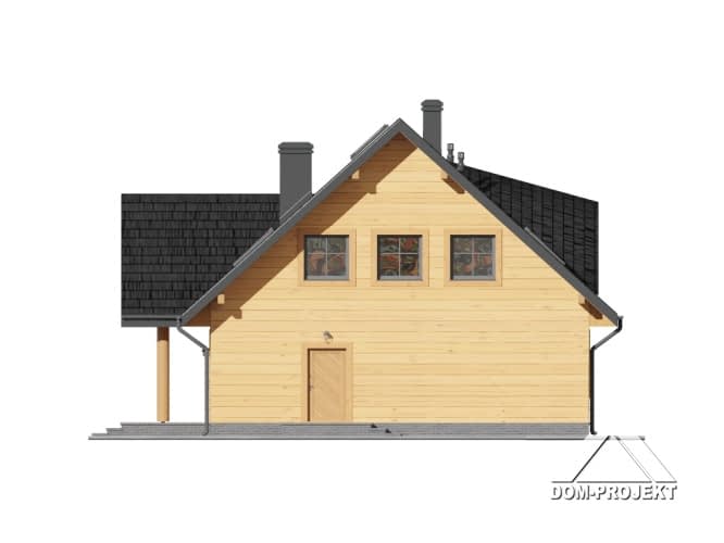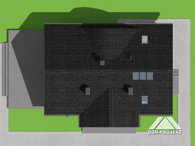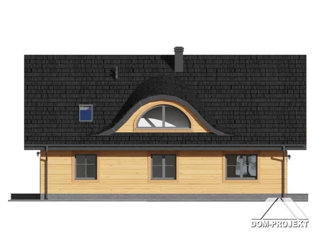 Dom w konstrukcji szkieletu drewnianego. Duży salon z aneksem kuchennym, kominkiem i wyjściami na taras. Pokój do pracy, łazienka z sauną, kotłownia, komunikacja, wiatrołap i spiżarka. Na poddaszu trzy pokoje, dwie łazienki, garderoba, komunikacja i balkon. Zwarta bryła budynku i dach dwuspadowy sprzyjają szybkiej i taniej budowie i niskim kosztom eksploatacji.Rzuty
