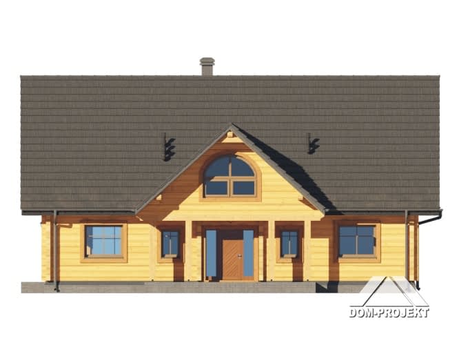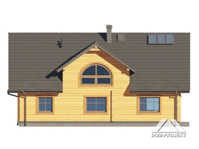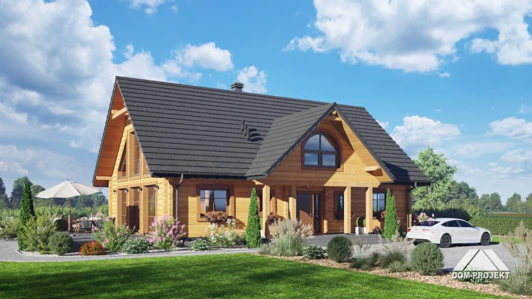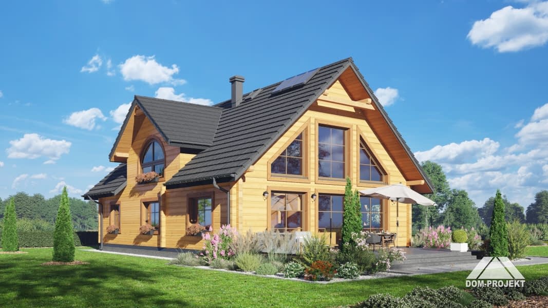 Dom z bali. Na parterze duży salon z kuchnią, kominkiem oraz wyjściem na taras. Spiżarka, dwa pokoje, łazienka, korytarz, pomieszczenie gospodarcze, wiatrołap. Na poddaszu trzy pokoje, garderoba, łazienka, komunikacja. Antresola nad salonem.Rzuty