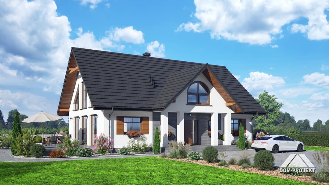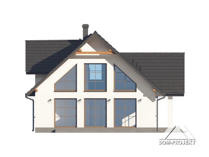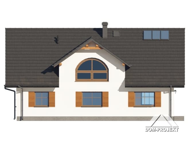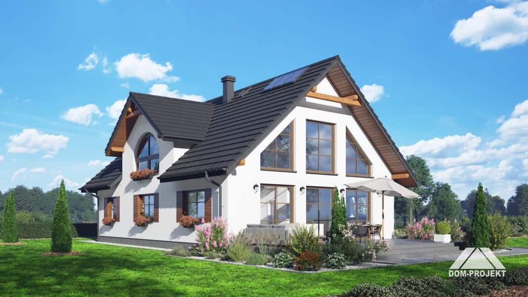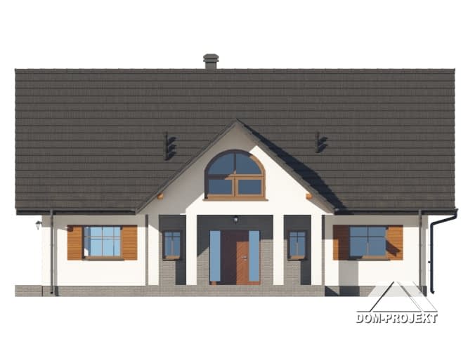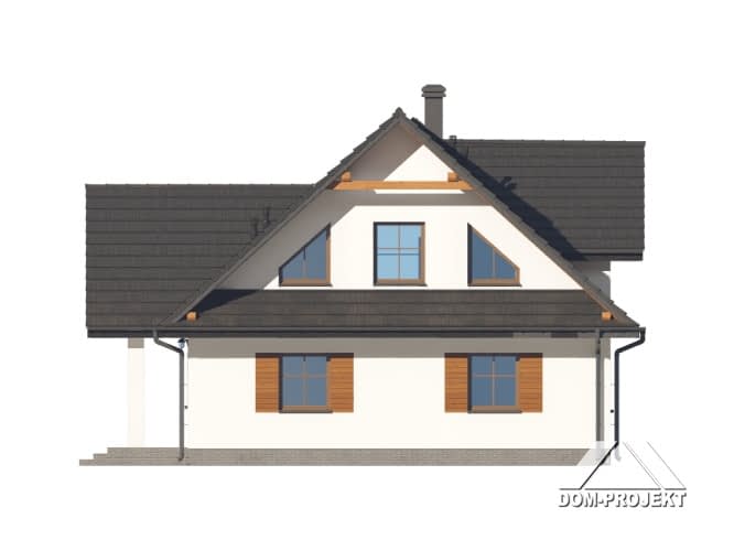 Dom z poddaszem użytkowym. Na parterze salon z kuchnią, kominkiem, wyjściem na taras. Dwa pokoje, łazienka, korytarz, pomieszczenie gospodarcze, wiatrołap, spiżarka. Na poddaszu trzy pokoje, garderoba, łazienka, komunikacja, antresola nad salonem. Zwarta bryła budynku oraz dach dwuspadowy sprzyjają szybkiej i taniej budowie oraz niskim kosztom eksploatacji.Rzuty