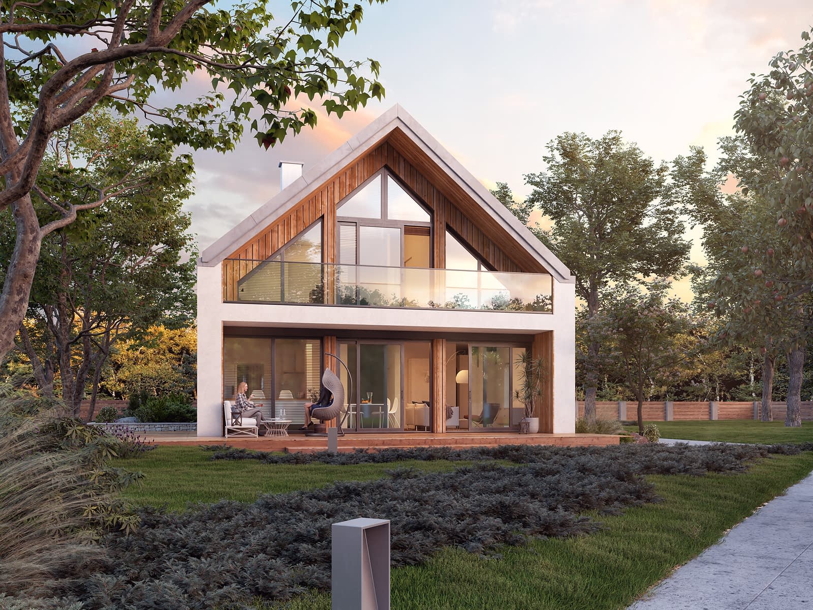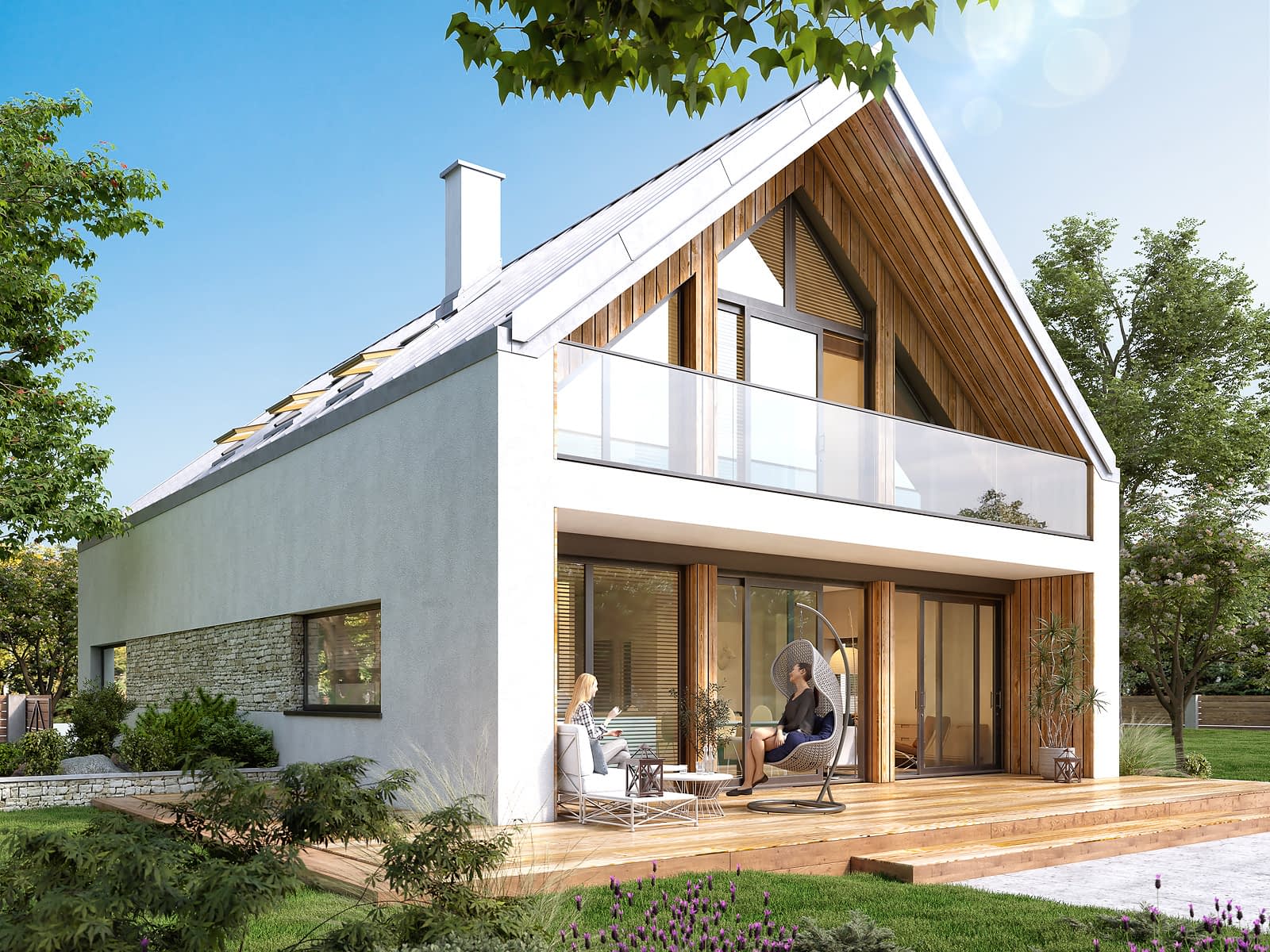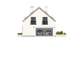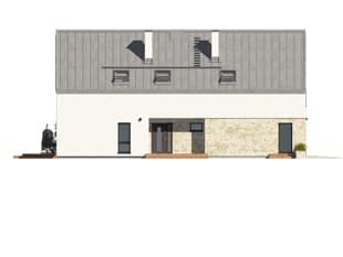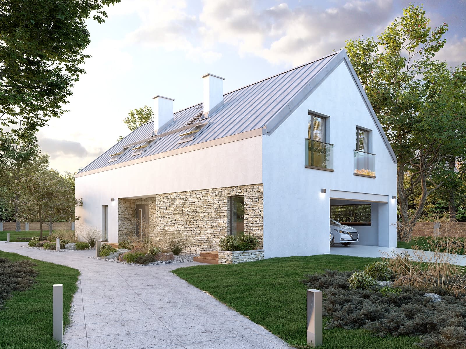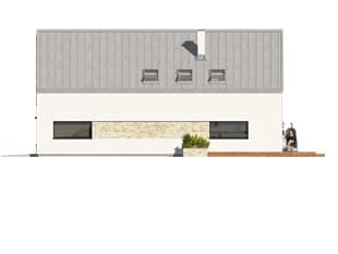 Pogodny 3 to projekt domu z użytkowym poddaszem o powierzchni 166 m2. Projekt utrzymany został w stylu nowoczesnej stodoły. Jasna elewacja wzbogacona została drewnianą szalówką i płytkami imitującymi kamień. Na dachu pojawiła się blacha na rąbek stojący w szarym kolorze. Parter stanowi część dzienną domu. Tworzą ją przestronny salon z kominkiem, jadalnia oraz kuchnia ze spiżarnią. Uzupełnieniem układu funkcjonalnego na parterze jest garderoba, toaleta oraz dwustanowiskowy garaż z przejściem do dużej kotłowni z oddzielnym wejściem zewnętrznym. Na poddaszu zaprojektowano część nocną, na którą składają się trzy sypialnie, ogólnodostępna łazienka oraz duża pralnia. Główna sypialnia tworzy apartament gospodarzy z prywatną garderobą oraz dużą łazienką z wanną i prysznicem. Dodatkowym atutem apartamentu jest również przeszklona ściana z wyjściem na balkon.Konstrukcja