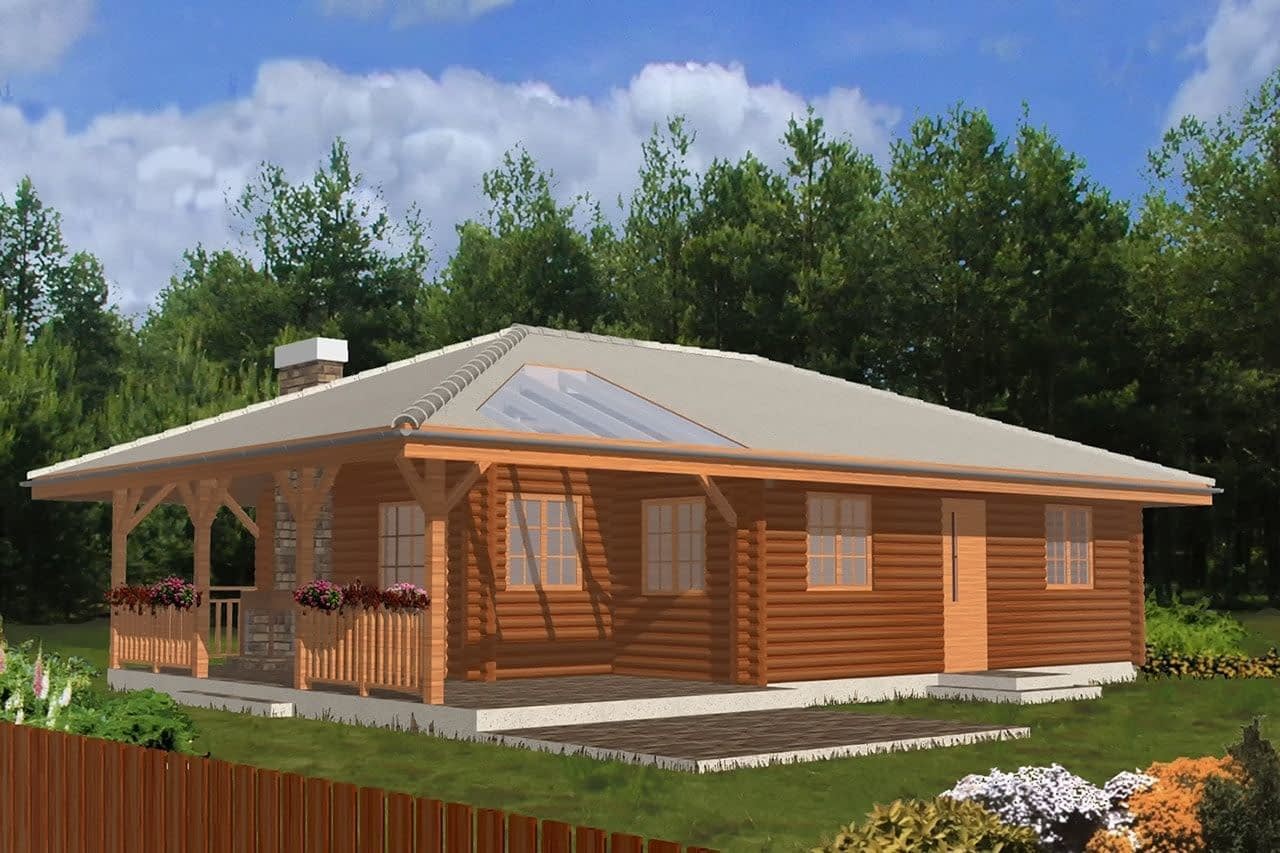 Projekt domu Pogodny Drewniany to mały i ekonomiczny domek z bali drewnianych. Parterowy, niepodpiwniczony, o prostej i wyważonej bryle, dla czteroosobowej rodziny. Może być traktowany zarówno jako dom jednorodzinny, jak i letniskowy. Budynek posiada czytelny i funkcjonalny rozkład pomieszczeń oraz wyraźny ich podział na strefy: dzienną i nocną, co daje poczucie komfortu i wygody. Obszerny zadaszony taras zapewnia możliwość korzystania z zewnętrznego kominka (grila) bez względu na warunki atmosferyczne. Kominek, zlokalizowany w salonie umożliwia rozprowadzenie ciepła po całym domu. Projekt domu Pogodny Drewniany dostępny jest w technologii drewnianej oraz murowanej. Pracownia dysponuje także wersją z poddaszem użytkowym. Każdy z wariantów projektu dostępny jest ponadto w odbiciu lustrzanym. Komplet czterech egzemplarzy zawiera: projekt architektury domu, konstrukcji oraz schematy instalacji wewnętrznych. Na prośbę Inwestora, do projektu dołączamy zgodę na dokonanie zmian według życzenia Klienta.