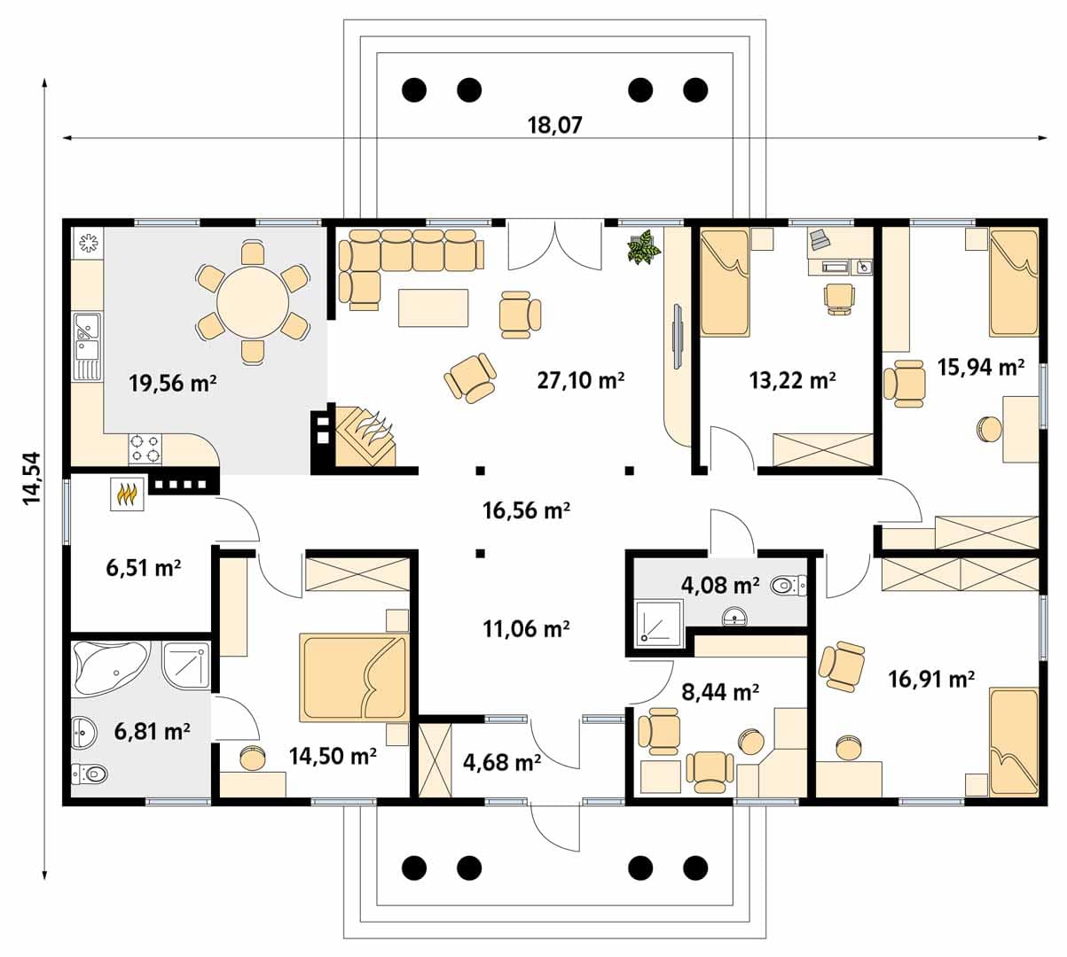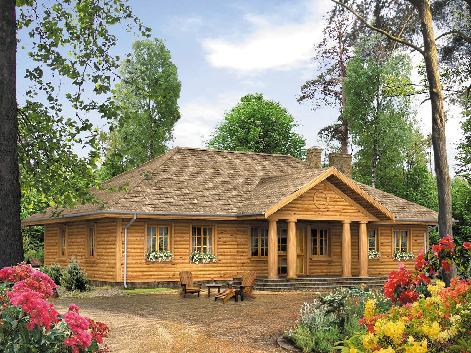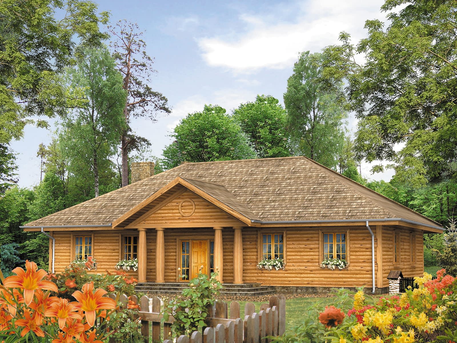 Parterowy dom drewniany dla 4 - 5-osobowej rodziny. Prosta, tradycyjna bryła z dachem kopertowym.Konstrukcja