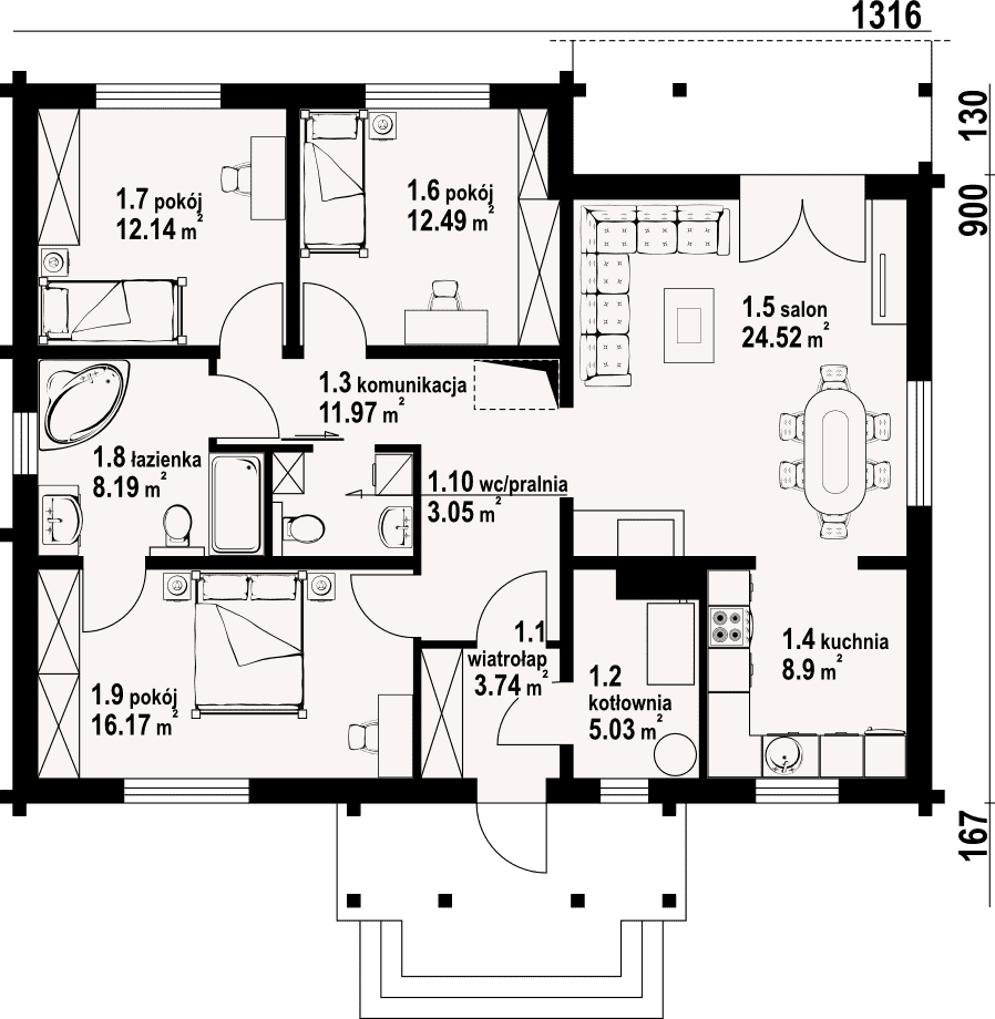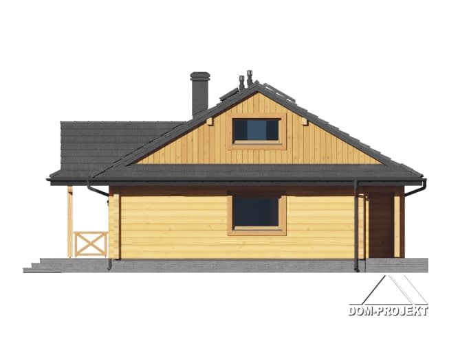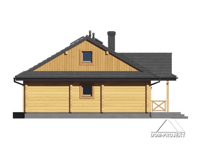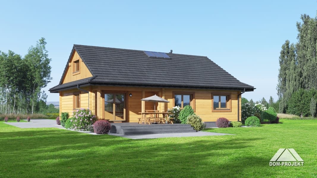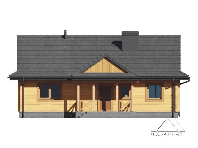 Parterowy dom z bali. Duży salon z kominkiem, wyjściem na częściowo zadaszony taras oraz przejściem do kuchni. Wygodna kuchnia. Trzy pokoje, łazienka, wc/pralnia, komunikacja, wiatrołap oraz kotłownia. Wyjście na poddasze schodami strychowymi rozkładanymi. Zwarta bryła budynku i dach dwuspadowy sprzyjają szybkiej i taniej budowie oraz niskim kosztom eksploatacji.Rzuty