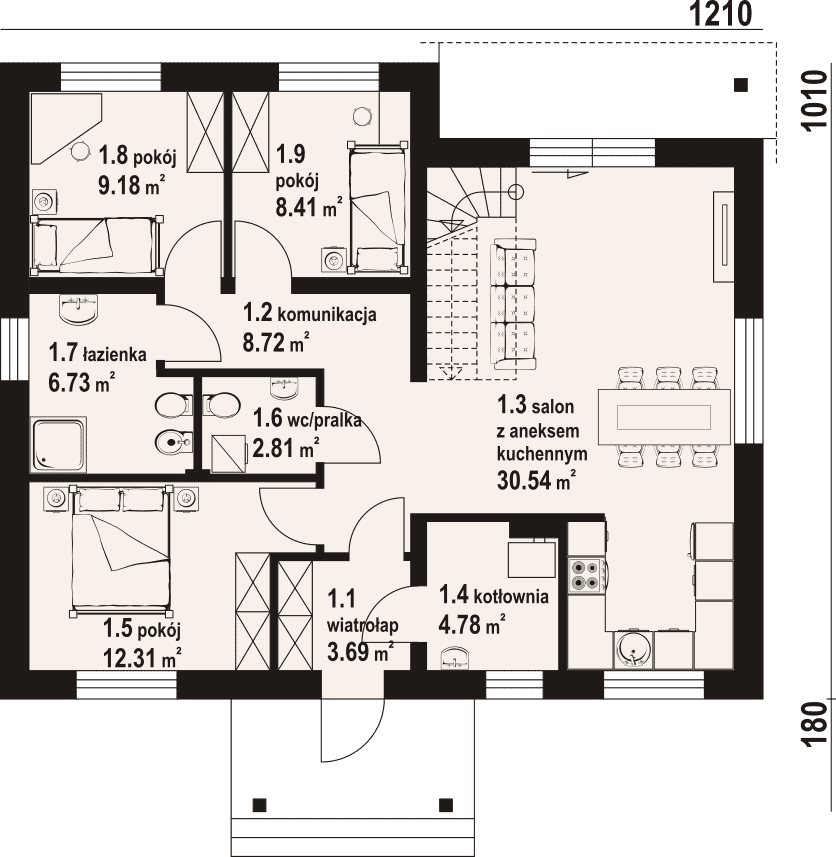 - 1.3 - salon z aneksem kuchennym30.54 m²