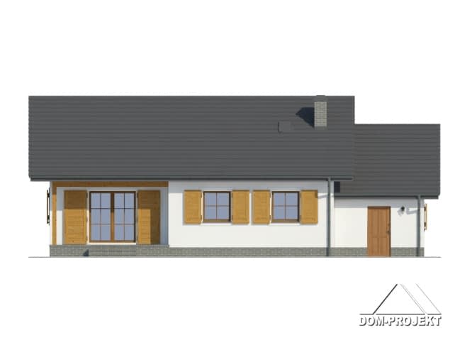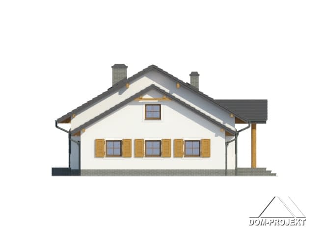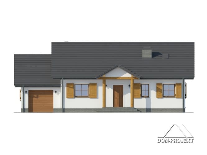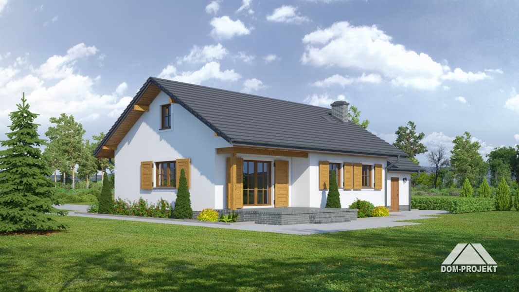 Wygodny dom parterowy dla 4 osobowej rodziny z funkcjonalnym układem pomieszczeń. Konstrukcja –szkielet drewniany wykończony od zewnątrz tynkiem. Duży salon z aneksem kuchennym, kominkiem i wyjściem na częściowo zadaszony taras. Trzy pokoje, łazienka, wc z pralką, wiatrołap z miejscem na szafy, spiżarka, komunikacja, garaż i kotłownia.Rzuty