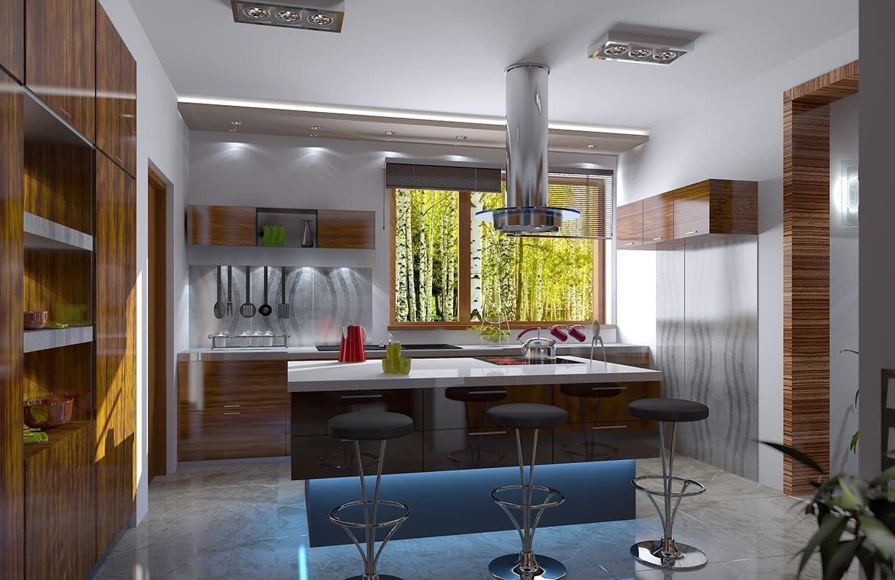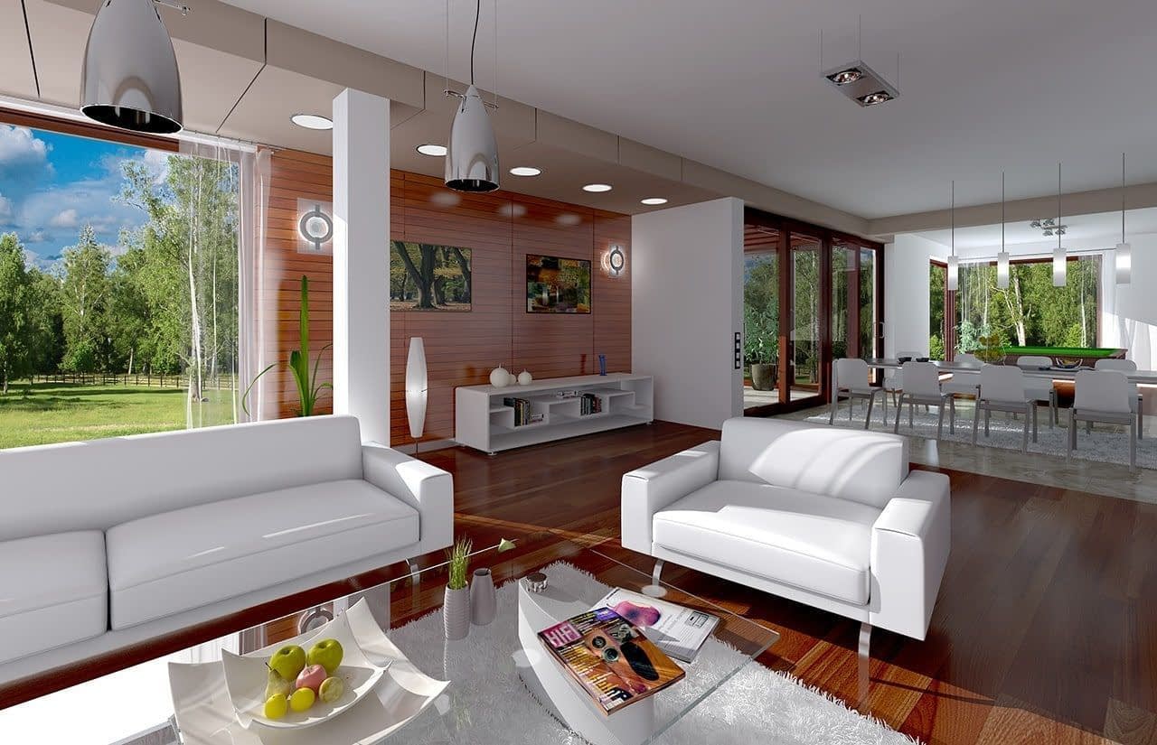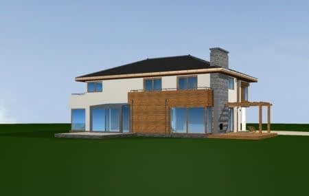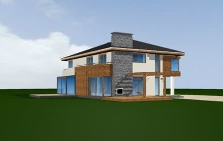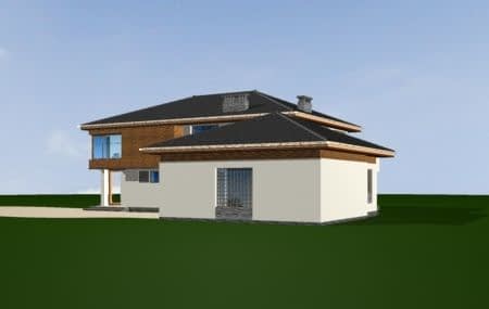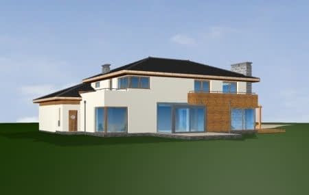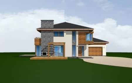 Projekt domu Południowy to komfortowy, bardzo oryginalny dom, o nowoczesnej architekturze. Zaprojektowano go z myślą o 4-5 osobowej rodzinie. Dom, dzięki otwarciu części dziennej na kilka stron świata może być adaptowany zarówno na działce z niekorzystnym wjazdem od strony południowej, jak i na działce z wjazdem od strony północnej lub bocznej (wschodniej lub zachodniej). Budynek składa się z głównej, dwukondygnacyjnej bryły oraz parterowej części garażowej. Duże przeszklenia, prostokątne wykusze, tarasy piętra - wszystkie te elementy podkreślają nowoczesność architektury domu Południowy. Prosta kubiczna bryła budynku została urozmaicona rozsądnie dobranymi detalami. Wnętrze domu na parterze to: przestrzeń dzienna łącząca salon, jadalnię z oranżerią, lub wariantowo podcienionym tarasem. Zaprojektowano tu również pomieszczenie rekreacji, które może również służyć jako biblioteka, pokój sportowy, lub ewentualnie sypialnia gościnna. Bardzo duża kuchnia z wyspą umieszczona została bliżej strefy wejściowej i garaży. Do garażu i pomieszczeń technicznych dostajemy się przez gospodarcze wejście kuchenne. Mieszczą się tam duży dwustanowiskowy garaż, pomieszczenie gospodarcze z dostępem na strych nad garażem, kotłownia-pralnia z wyjściem na ogród i spiżarnia. W projekcie domu Południowy, na piętrze zaplanowano apartament rodziców z garderobami, łazienką i własnym tarasem, dwie sypialnie dzieci z łazienką, oraz gabinet-bibliotekę z oknami widokowymi na część wejściową do domu. Pradownia dysponuje również wersją wariantową projektu domu Południowy w odbiciu lustrzanym.