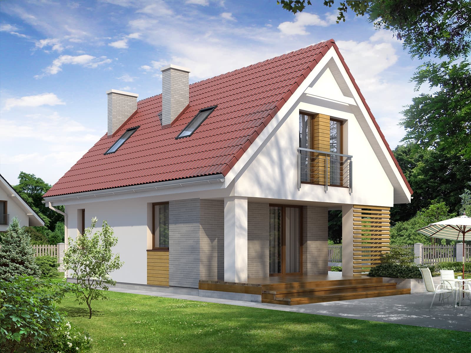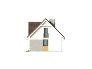 Mały, funkcjonalny dom jednorodzinny z użytkowym poddaszem o prostej, tradycyjnej bryle. Wyraźny podział funkcjonalny na część dzienną (parter) i nocną (poddasze). Na parterze zlokalizowano pokój dzienny z kominkiem i przyległym zadaszonym tarasem, kuchnię z jadalnią i łazienkę. Na poddaszu znajdują się trzy sypialnie, łazienka i garderoba. Projekt idealny dla 3 - 4-osobowej rodziny.Konstrukcja