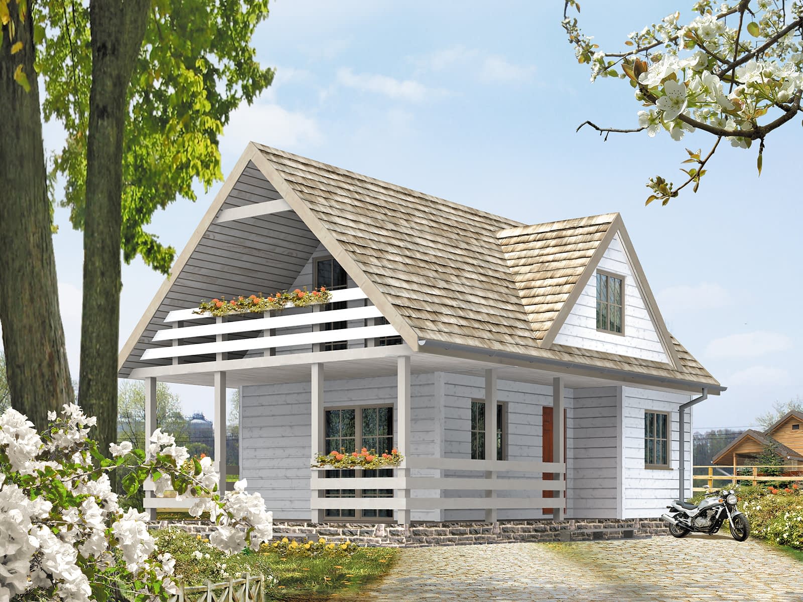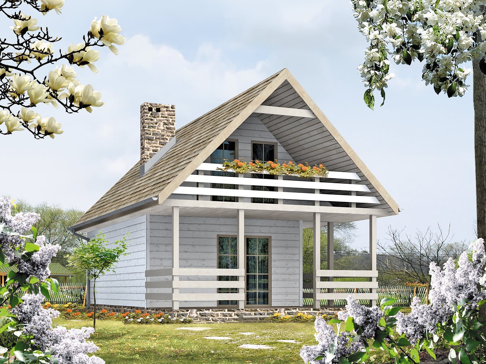 Mały letniskowy domek z czterema pokojami na poddaszu. Jadalnia z aneksem kuchennym. Pokój kominkowy z wyjściem na taras.Konstrukcja