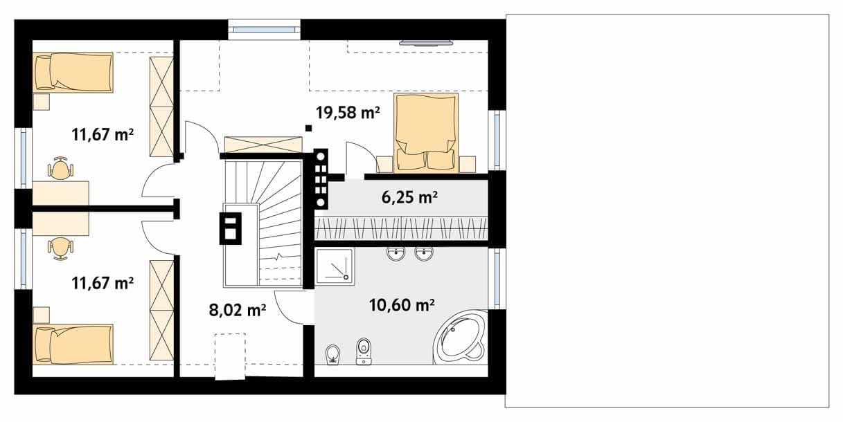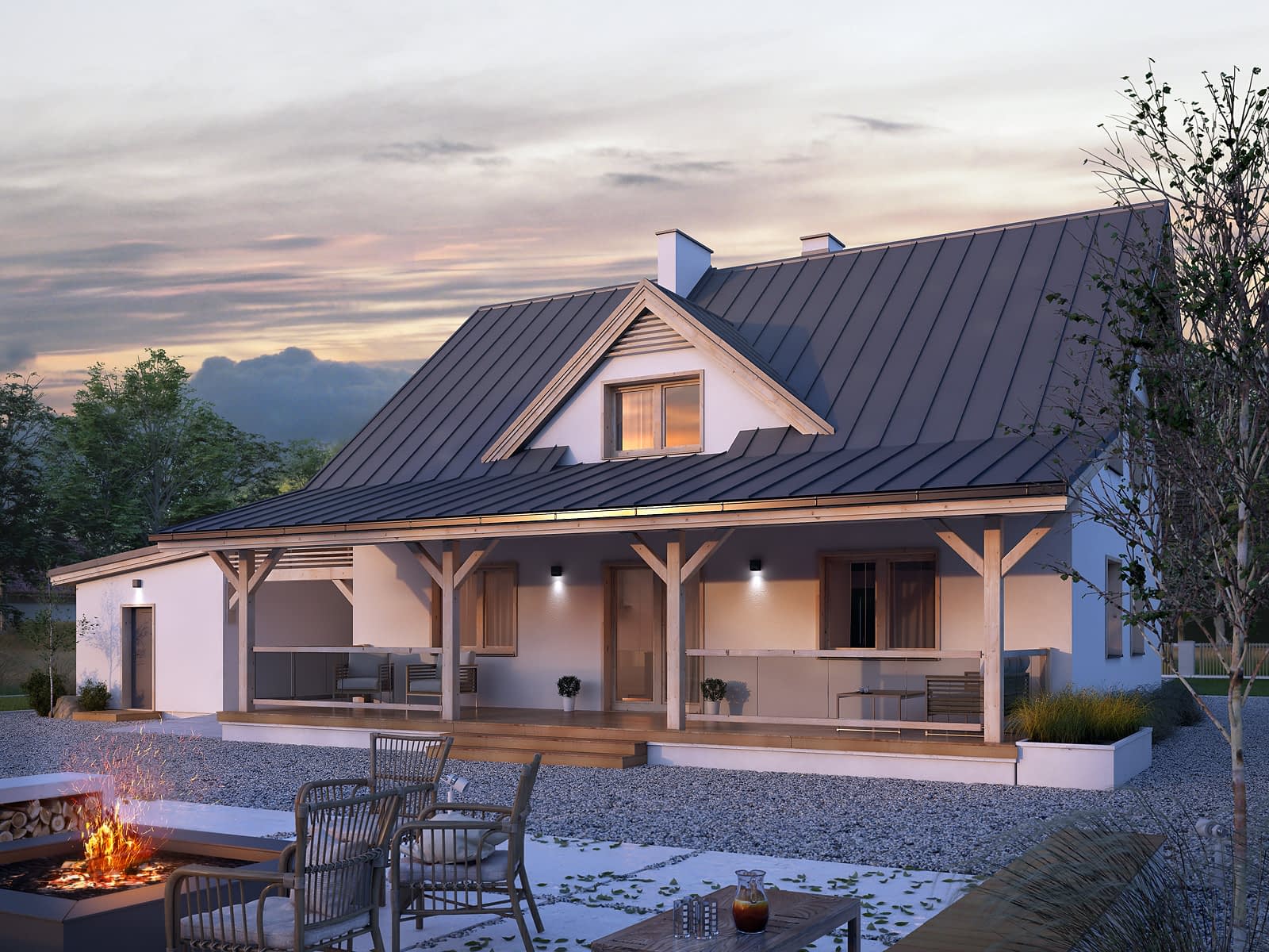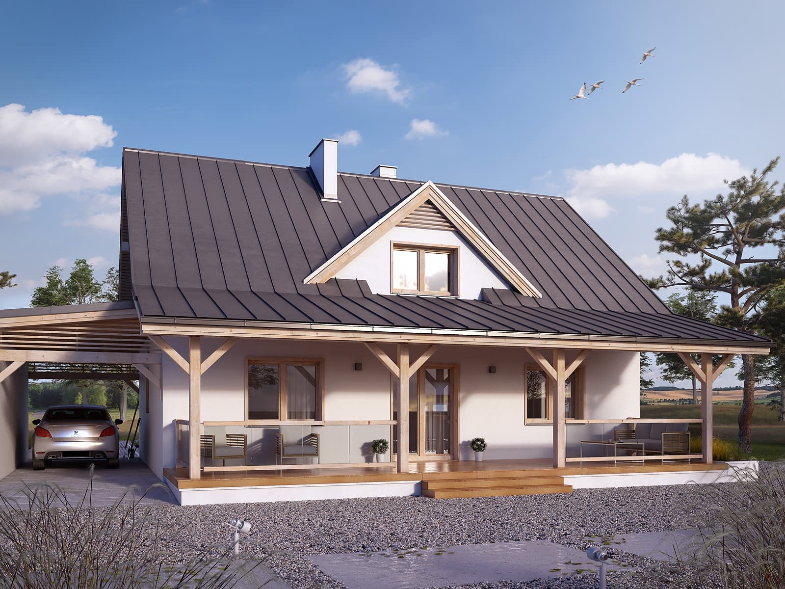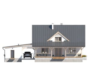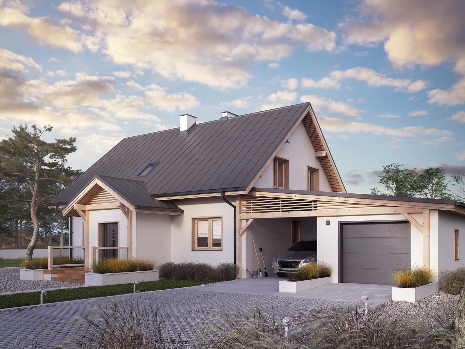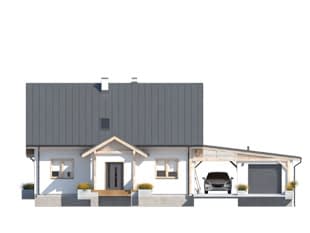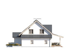 Poziomkowy 2 to dom jednorodzinny, niepodpiwniczony z użytkowym poddaszem oraz garażem z wiatą. Na parterze znajduje się salon połączony z jadalnią oraz otwarta kuchnia z łatwo dostępną spiżarnią. Atutem projektu jest dodatkowy pokój na parterze sąsiadujący z ogólnodostępną łazienką. Na poddaszu wygospodarowano trzy sypialnie, garderobę oraz łazienkę. Projekt wyróżnia się poprzez zadaszony taras od strony elewacji ogrodowej oraz przestrzeń pod wiatą, która może służyć jako dodatkowe miejsce parkingowe.Konstrukcja